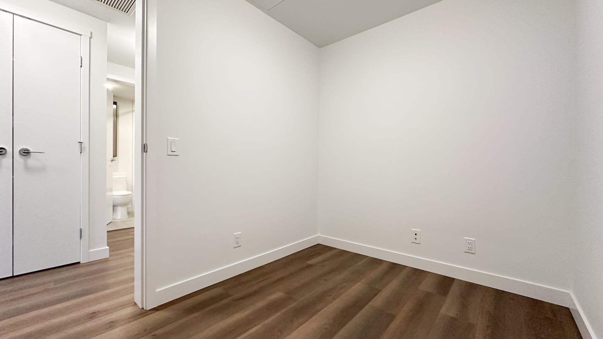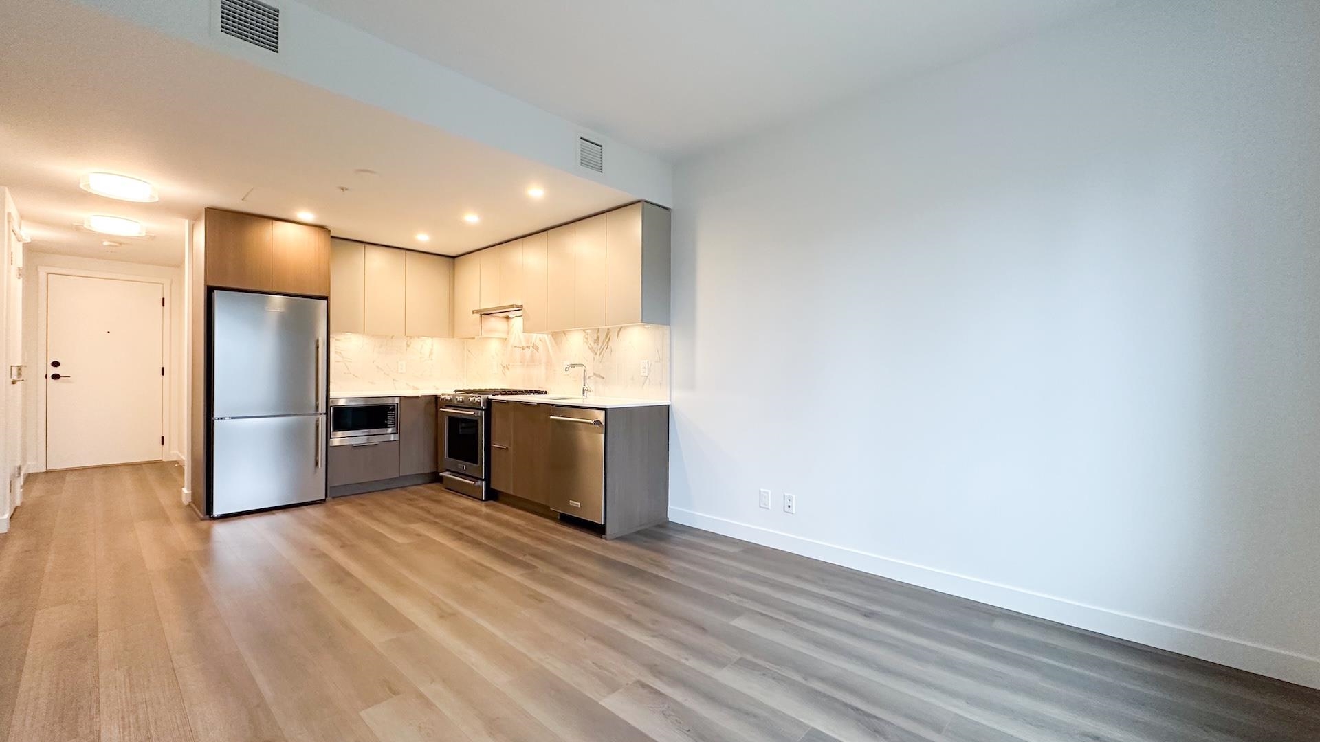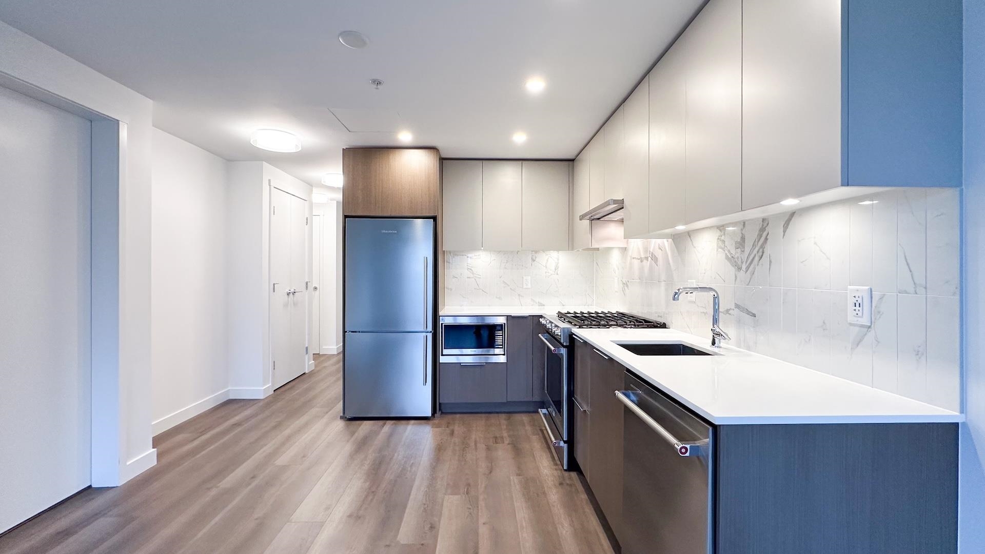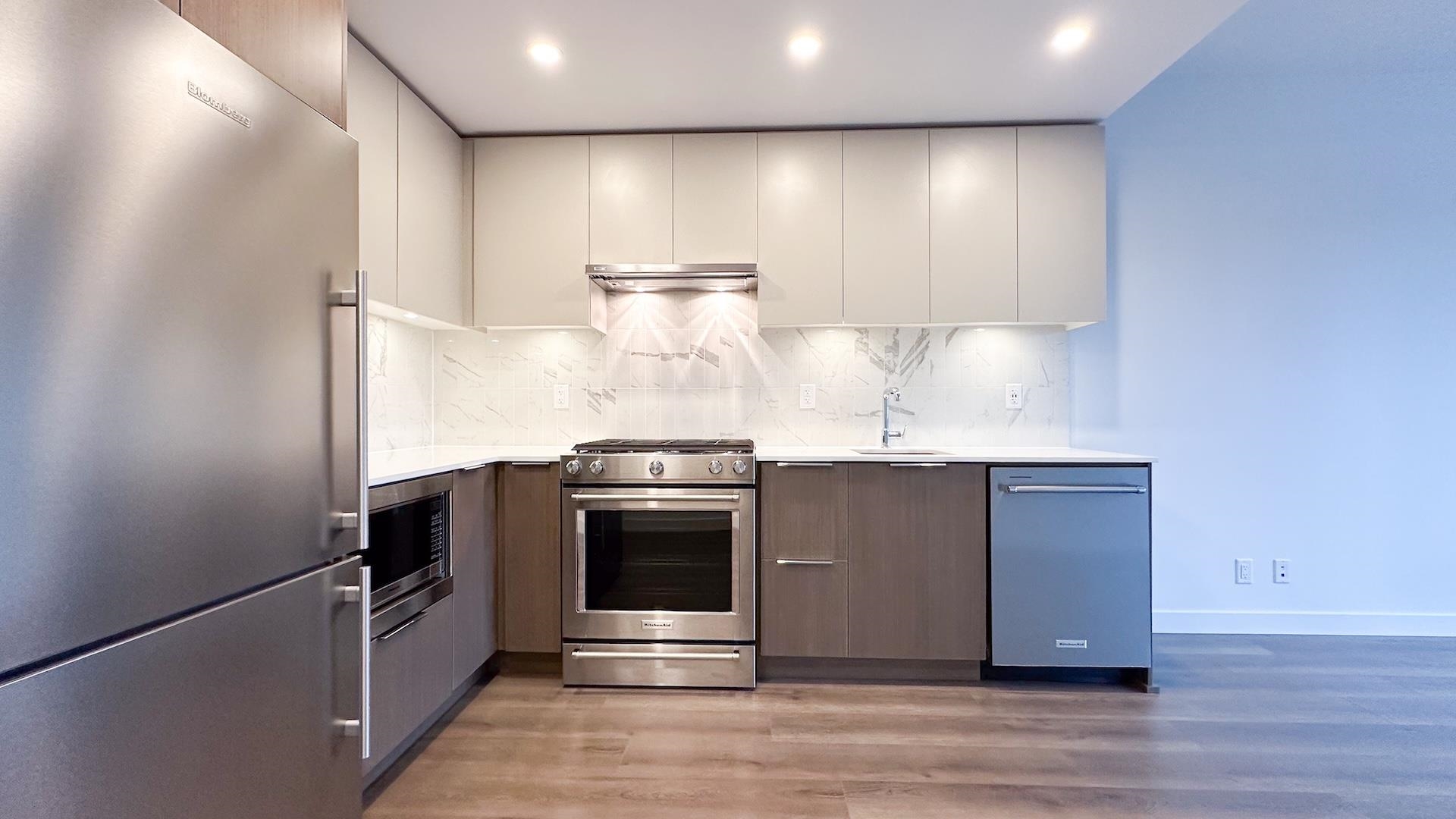 Welcome to Port & Mill built in 2023 by Streetside, part of reputable Qualico. S facing 1BR + den home feels brand new & features AC! L-shaped kitchen features full size Kitchen Aid & Blomberg appliances & quartz countertops. BR offers spacious walk-thru closets & cheater ensuite access to bathrm. Den is large enough for comfortable single bedrm, nursery, TV room or office. Full size washer/dryer. Parking features level 2 EV charger - just plug in your car! Storage & Bike locker. Amenities incl. caretaker; ...