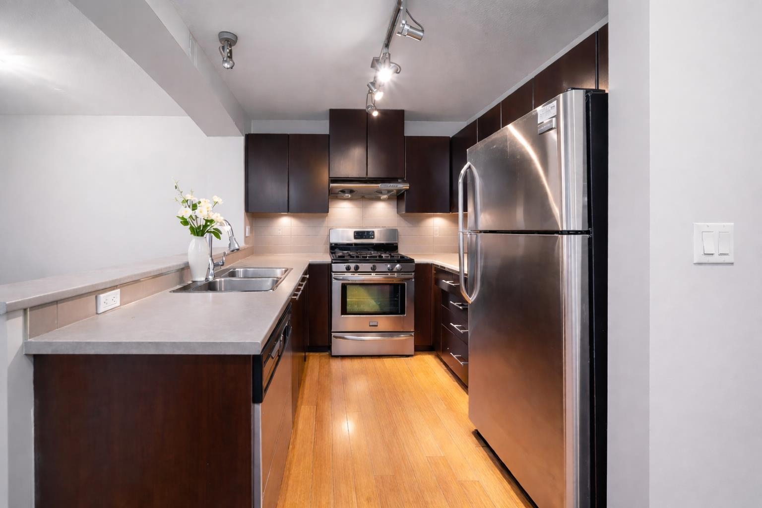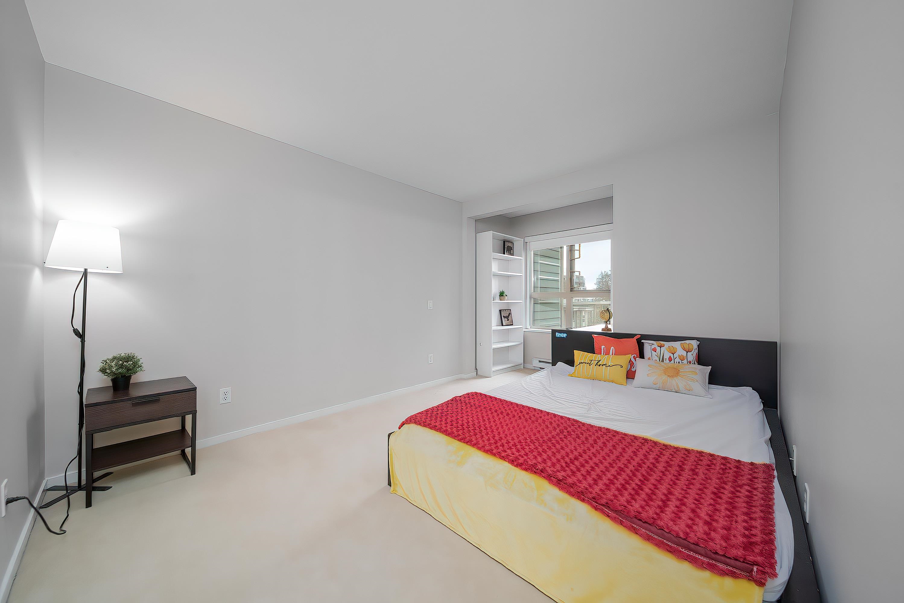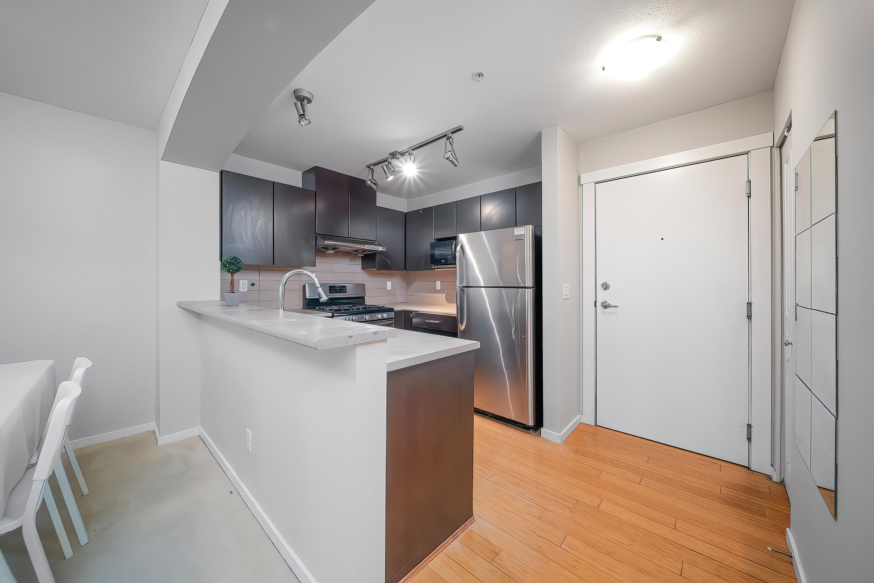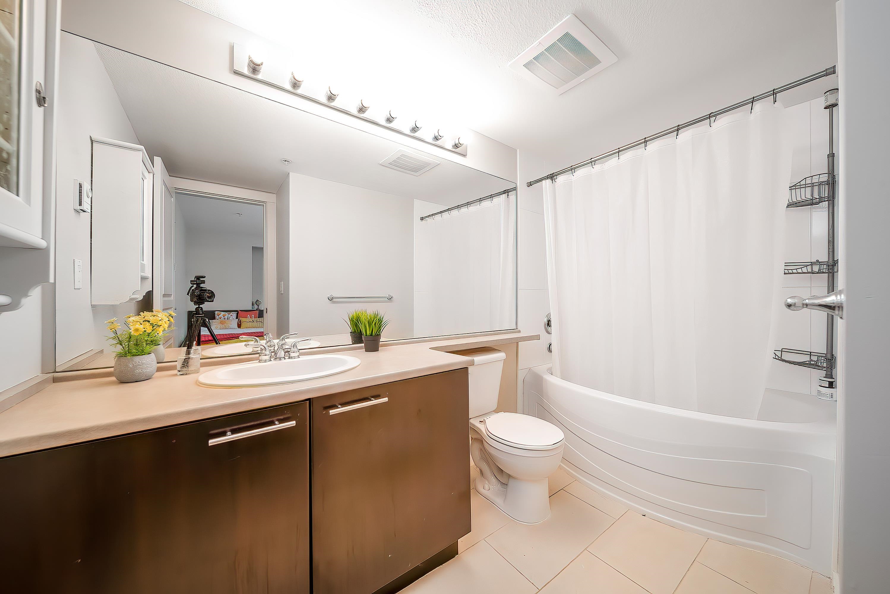 Harmony by Polygon – Rare southeast-facing corner suite offering a bright and efficient 2-bedroom, 2-bathroom layout. The spacious living area features a cozy gas fireplace and opens to a large covered balcony overlooking landscaped courtyard greenery with beautiful views. The L-shaped kitchen offers abundant storage, stainless steel appliances, gas range, flowing into a generous dining area. The primary bedroom is impressively sized with a walk-in closet, ensuite with soaker tub, and extra space ideal for ...