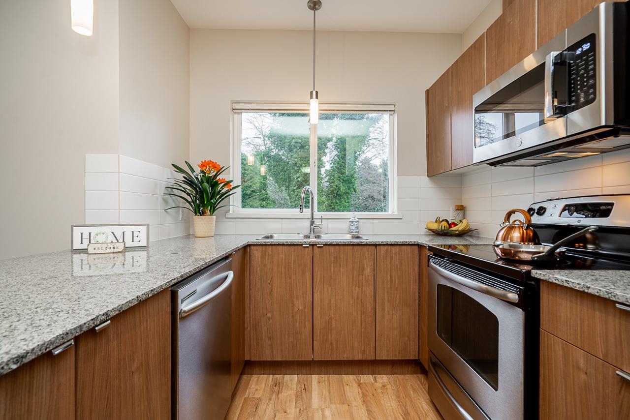 Hurry to view this spotless, quiet, corner apartment at GRUV. Like new condition, both bedrooms are spacious and both have their own bathrooms. Large wrap around covered NW facing balcony overlooking peaceful greenbelt. Stainless steel appliances, granite countertops, new carpets in bedrooms and fresh interior paint throughout. Open plan with breakfast bar, window in kitchen and plenty of natural light. Walk through closet in primary bedroom. Gym and amenity room, central hot water. Plenty of visitor parkin...