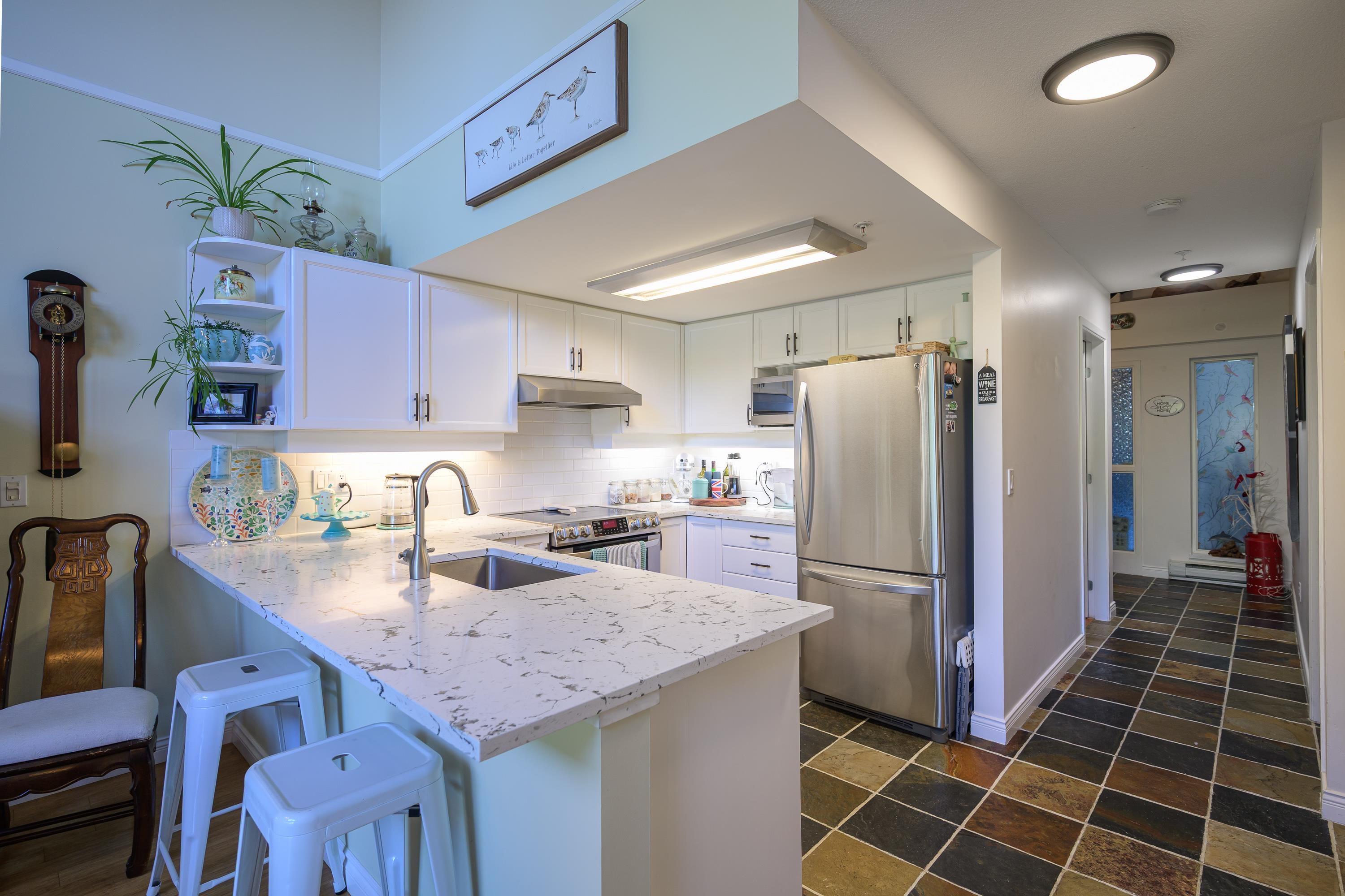 Experience the ultimate waterfront lifestyle at Tsatsu Shores! Overlooking a serene lagoon & surrounded by natural wildlife, this beautifully updated 1,305 sqft 2-storey residence offers the peaceful & tranquil setting you deserve and is just a short drive to countless amenities. Loft-style design feels like a house easing the transition into condo living. Highlights incl 2 large bedrooms, 2 renovated bathrooms, spectacular views of the North Shore Mountains from an oversized 241 sqft balcony, soaring vault...