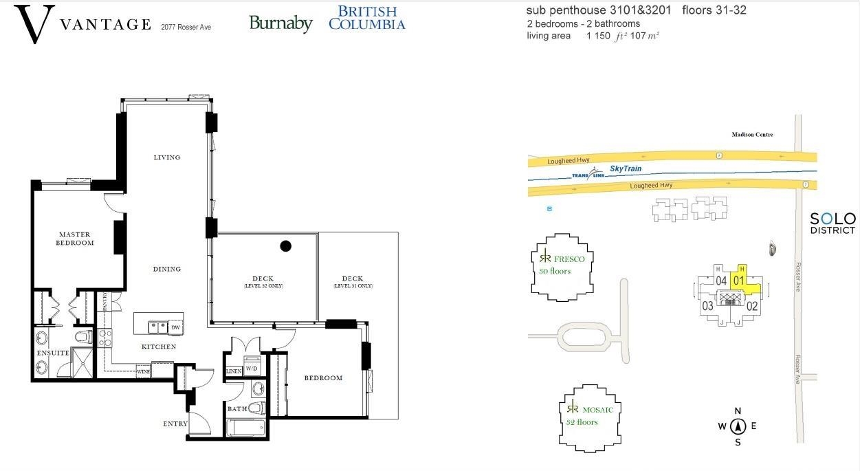 Welcome to this exceptional SUB-PENTHOUSE 2 bedroom, 2 bathroom corner home on the 32nd floor of Vantage by Bosa, and comes with 2 PARKINGS! ! Located in the heart of Brentwood. This 1,150 sqft residence features soaring ceilings, floor-to-ceiling windows, and a bright open layout with panoramic city and south river views. Enjoy outdoor living on the rare large balcony-ideal for relaxing or entertaining. The thoughtful floorplan offers excellent bedroom separation, with a spacious primary suite featuring a ...