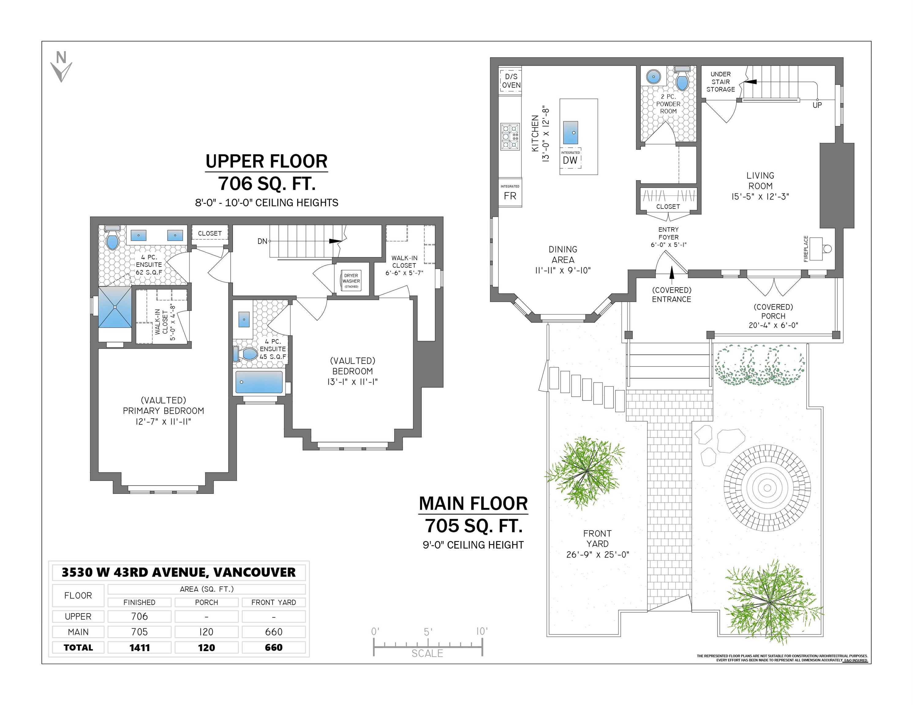Stunning craftsman half duplex w/ French doors to a charming front porch & private front yard on a quiet tree-lined street in Dunbar/Southlands. Light-filled & spacious 1,411 SF, 2 bed + 3 bath w/ vaulted ceilings, bay windows & open-concept living. Chef's Kitchen w/ custom cabinetry, quartz counters, Thermador gas cooktop & double wall ovens. Gas fireplace & indoor-outdoor flow. Primary w/ walk-in closet & spa-like ensuite w/ rain shower, bench & double vanity. 2nd bed w/ walk-in closet & full ensuite. Rad...