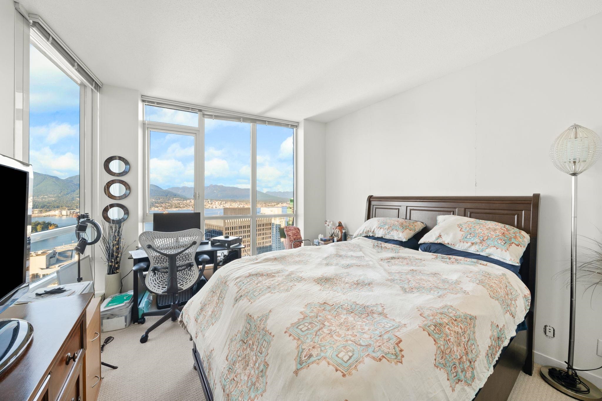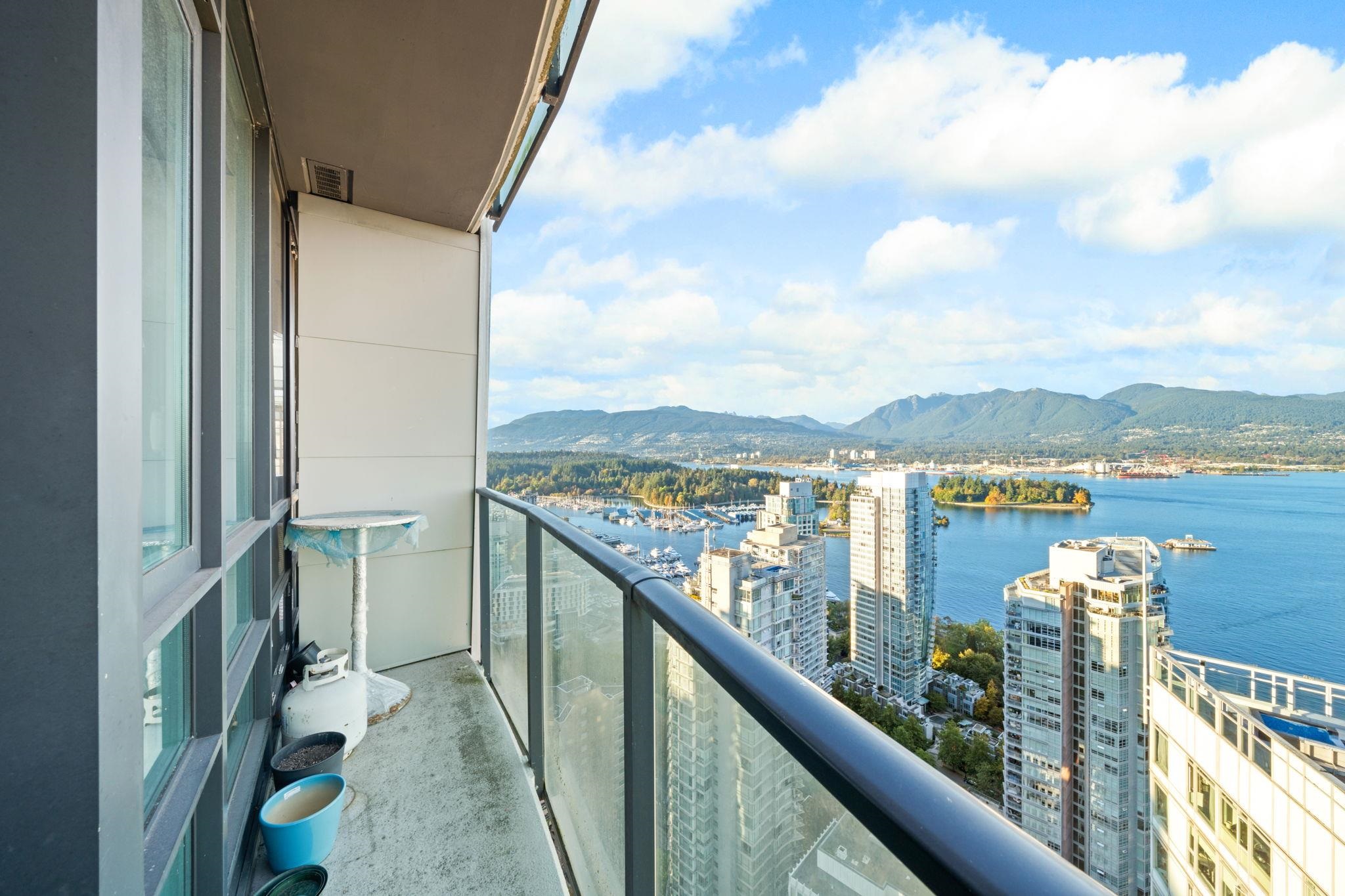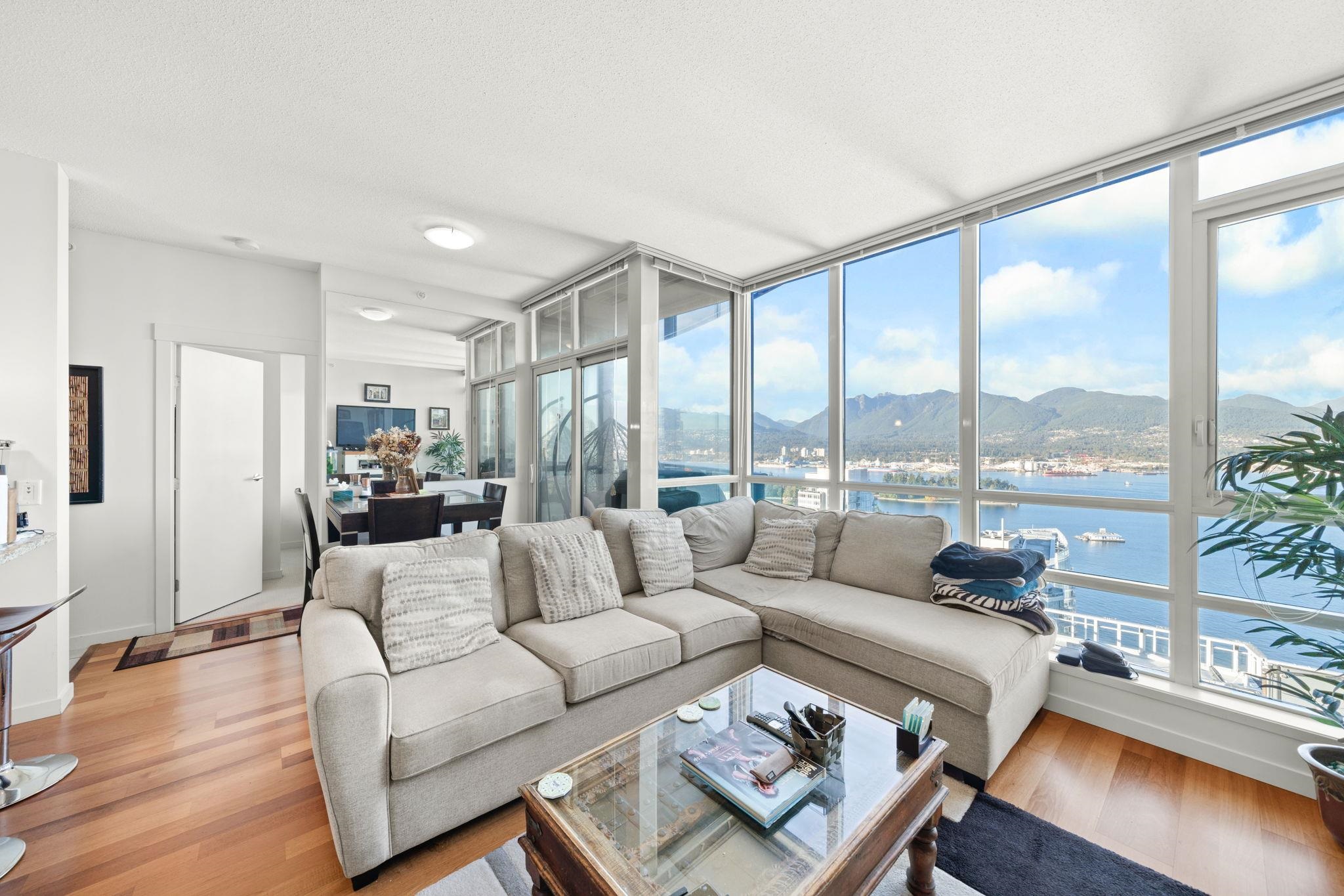 A Coal Harbour landmark - welcome home to The Melville. This unit boasts soaring, unobstructed PANORAMIC views of the North Shore mountains, city, Stanley Park, and Coal Harbour. Incredible floor to ceiling windows allow you to soak up all the views while the spacious and thoughtful layout offers privacy - 2 separate bedrooms on opposite ends of the unit. Open kitchen, granite countertops, gleaming hardwood floors, a private balcony to admire the view, additional den, 1 storage unit and 1 parking spot. The ...