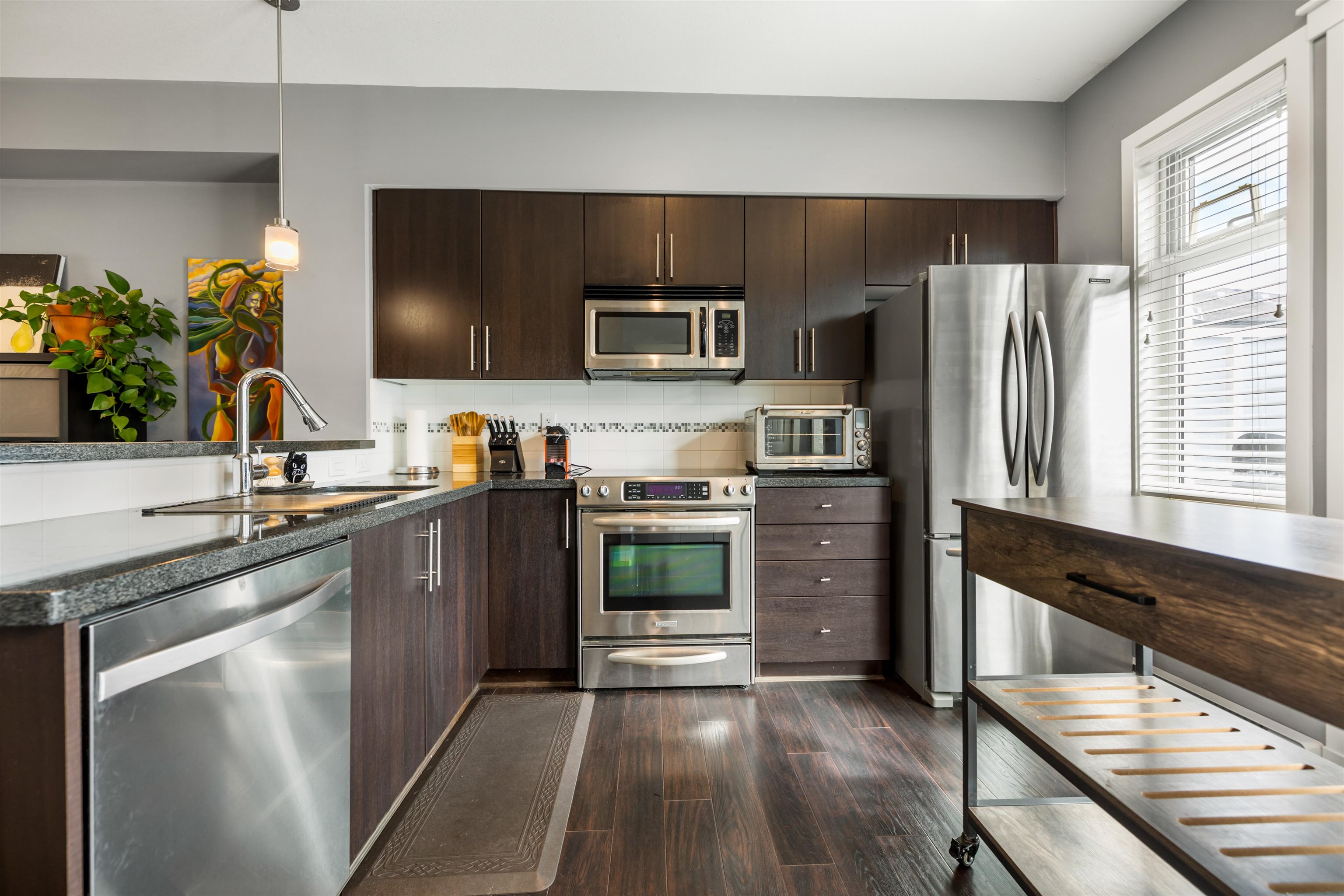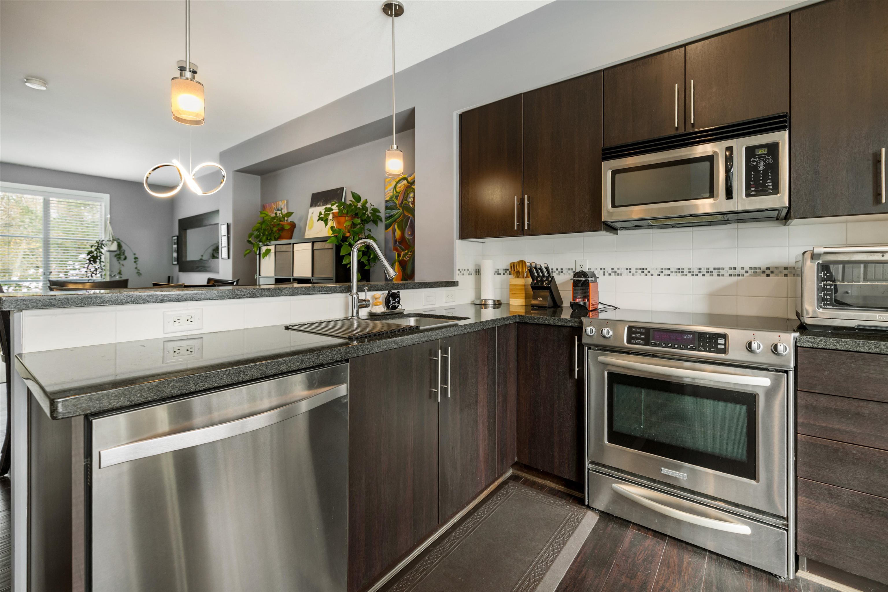 Welcome to Nuvo 2 in the highly sought after Grandview Heights neighbourhood. This 2 bedroom , 3 bath townhouse has 2 parking and the pad can fit your full size truck! Ultra quiet location backing onto protected greenspace and 2 entrances into the home. Zoning allows a licensed home business with its own washroom in lower level which is self contained. Open, bright layout with south facing deck, perfect for summers bbqs! Kitchen has room for your bar stools, upgraded stainless steel appliances & granite ...