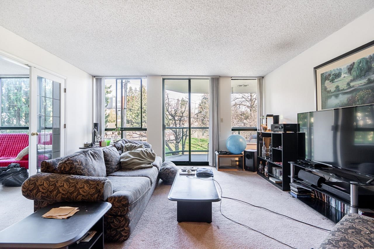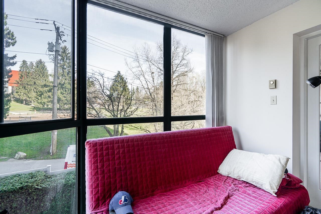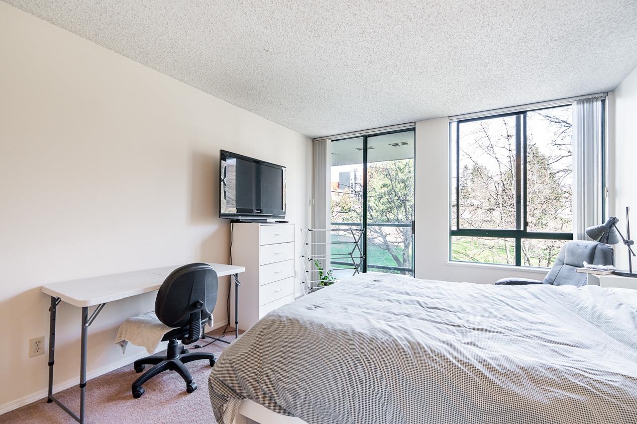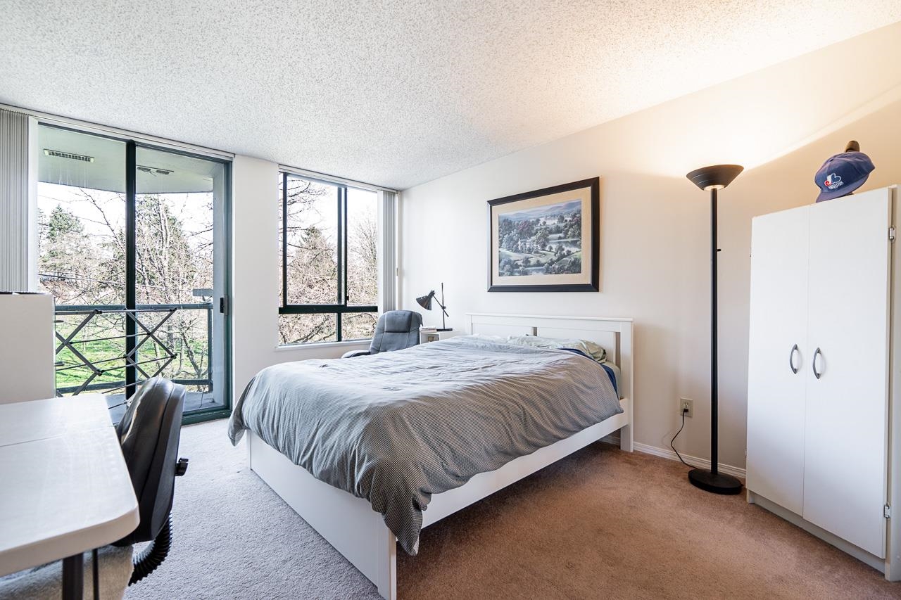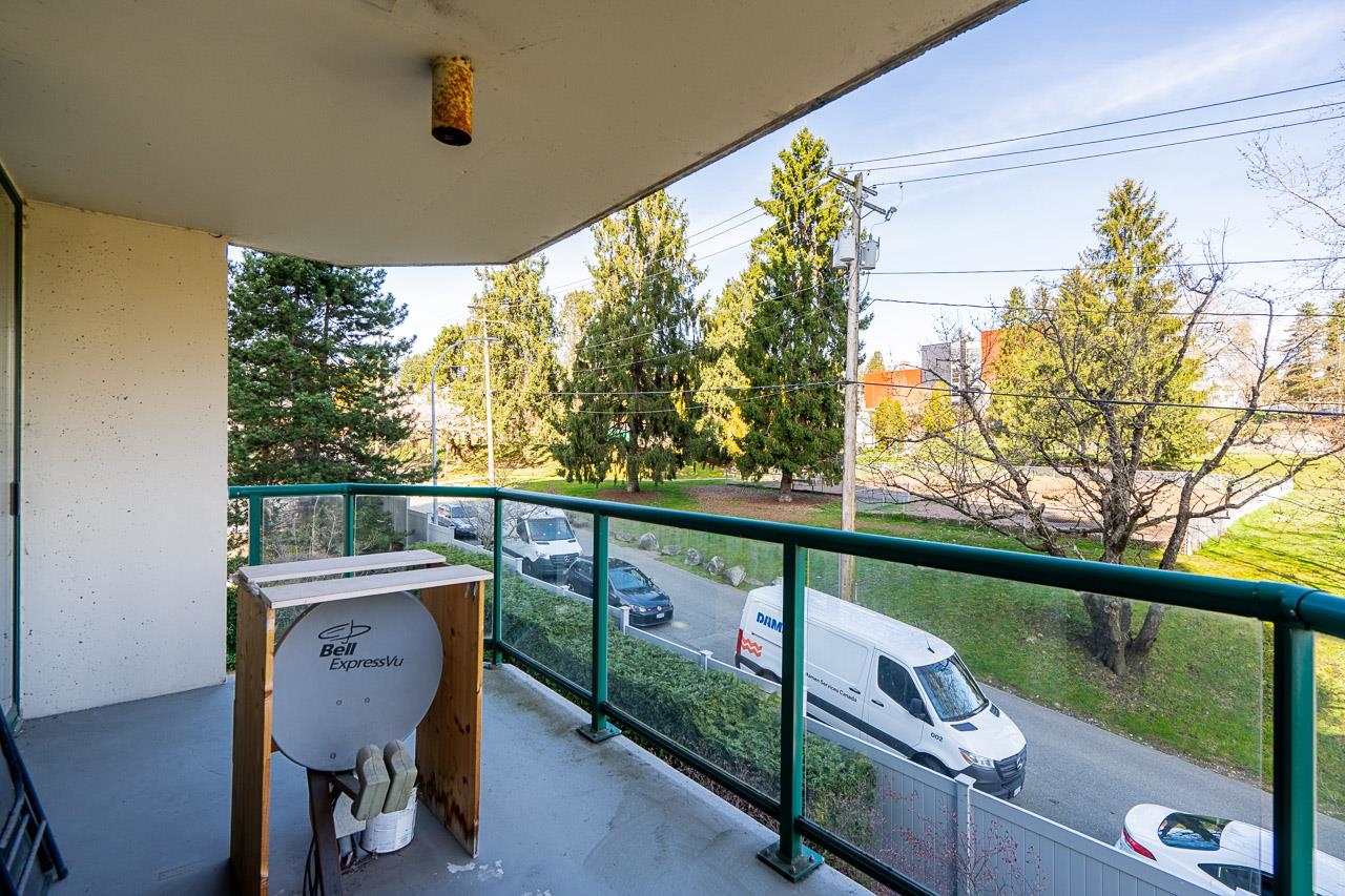 Welcome to this well-maintained, Bosa-built concrete tower in Uptown New Westminster, just steps to shopping and Sky Train! This spacious, nearly 1,000 square foot 2 bedroom, 1 bathroom home overlooks tranquil greenery and a nearby park, offering a quiet and private outlook. The thoughtfully designed layout features a large living and dining area, while the kitchen offers enough space for an eating nook. The primary bedroom is well-sized, complete with a walk-through closet and cheater ensuite. Floor-to-cei...