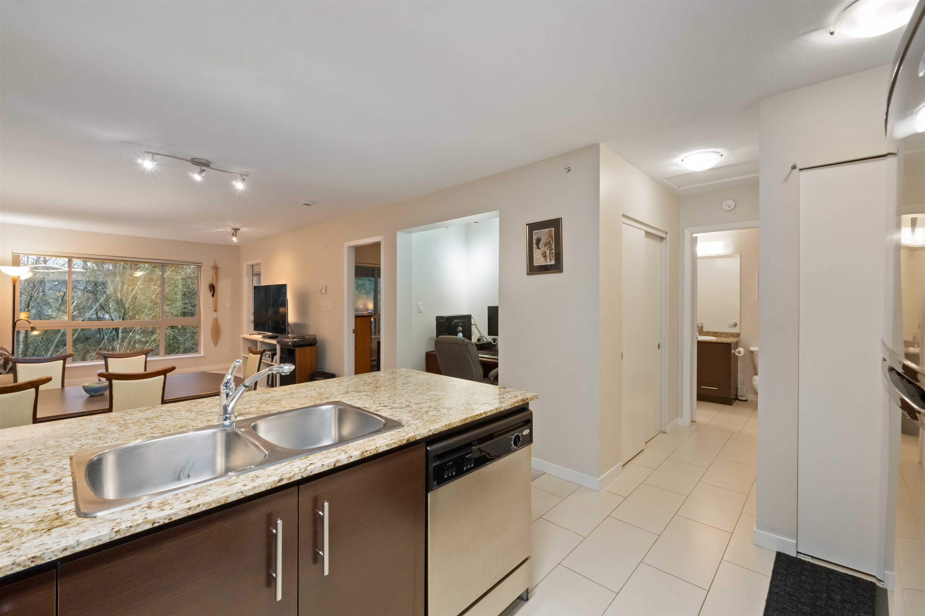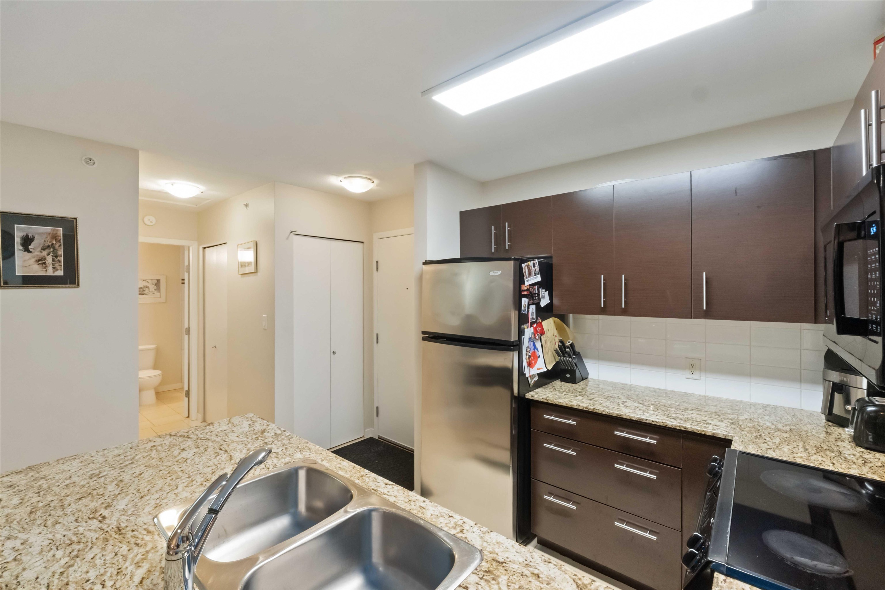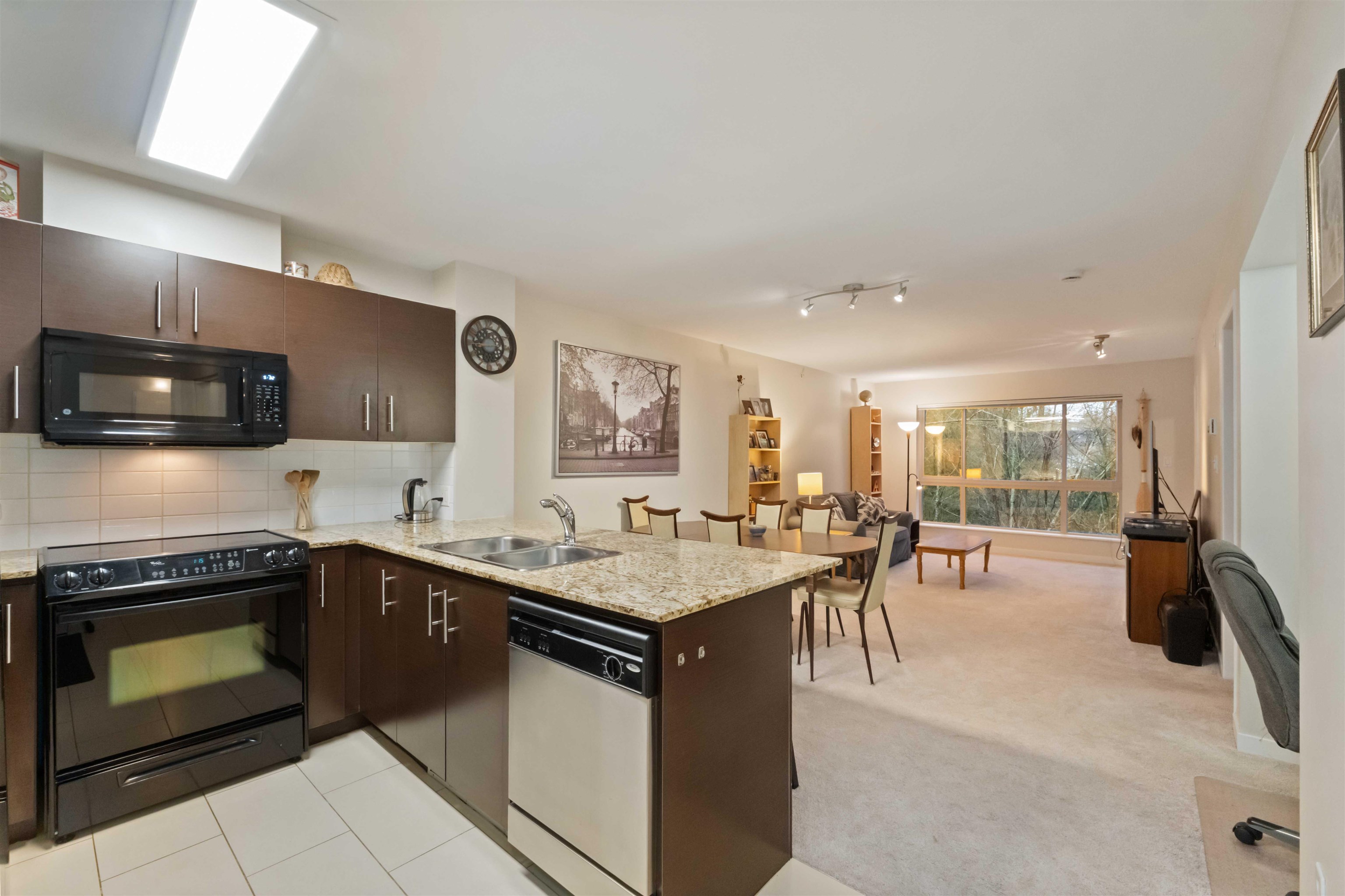 Spacious top-floor 1 bedroom plus den home featuring a well-designed open-concept floor plan and peaceful greenbelt exposure. With over 700 sqft the modern kitchen is equipped with granite countertops and stainless steel appliances, ideal for everyday living and entertaining. Large windows bring in natural light, while the generous balcony overlooks the greenbelt, offering added privacy and a tranquil outdoor retreat. Conveniently located within walking distance to town, transit, West Coast Express, and rec...