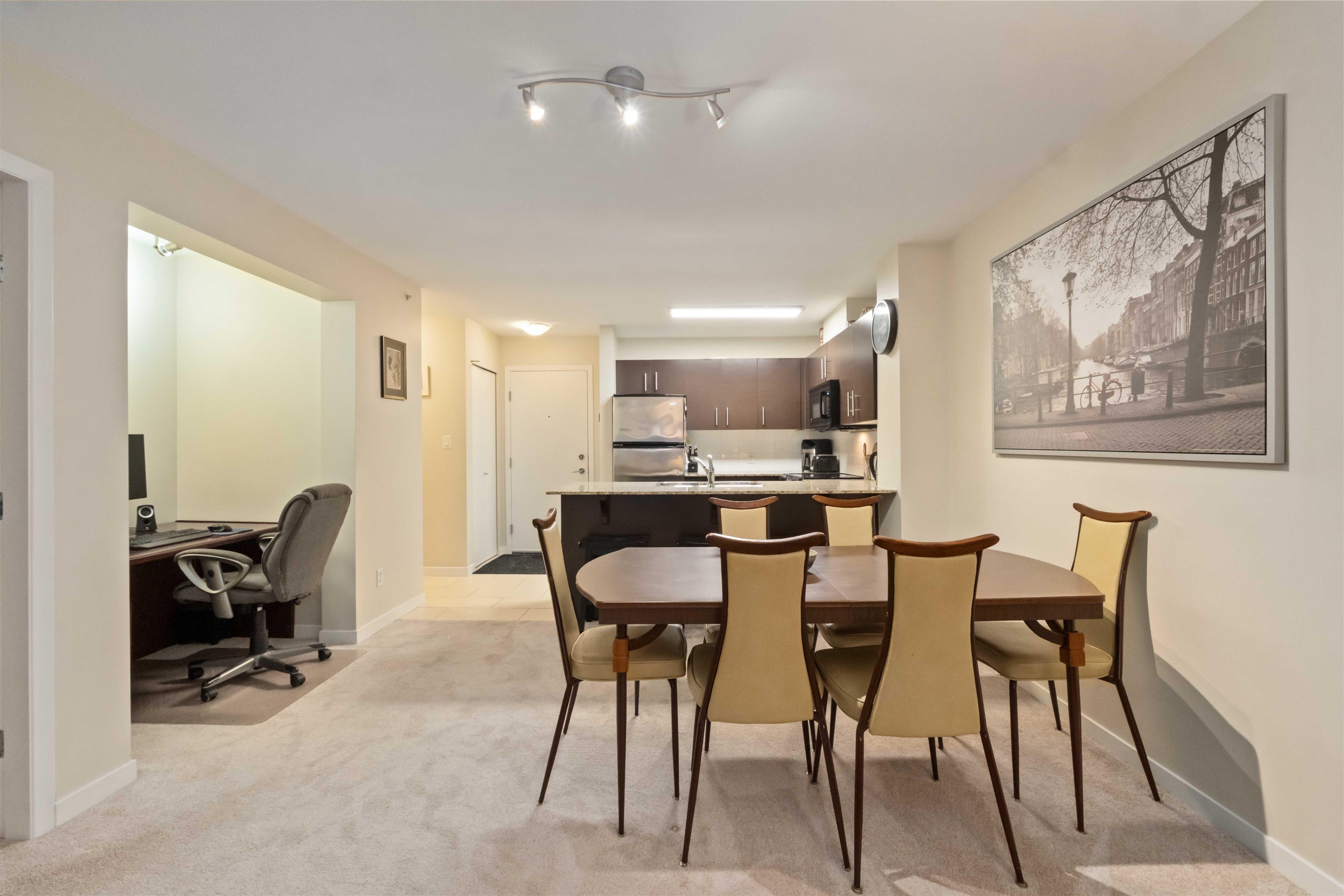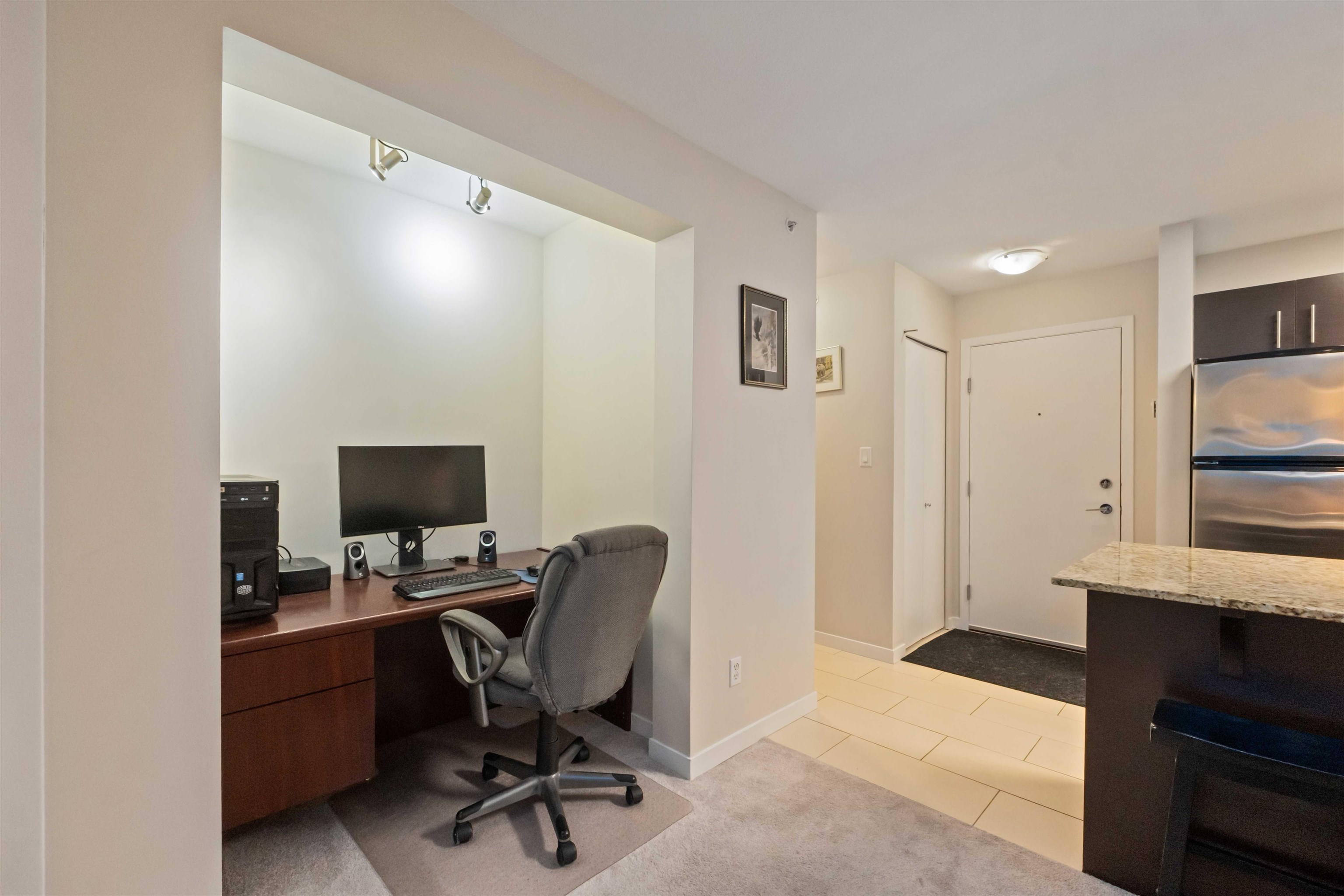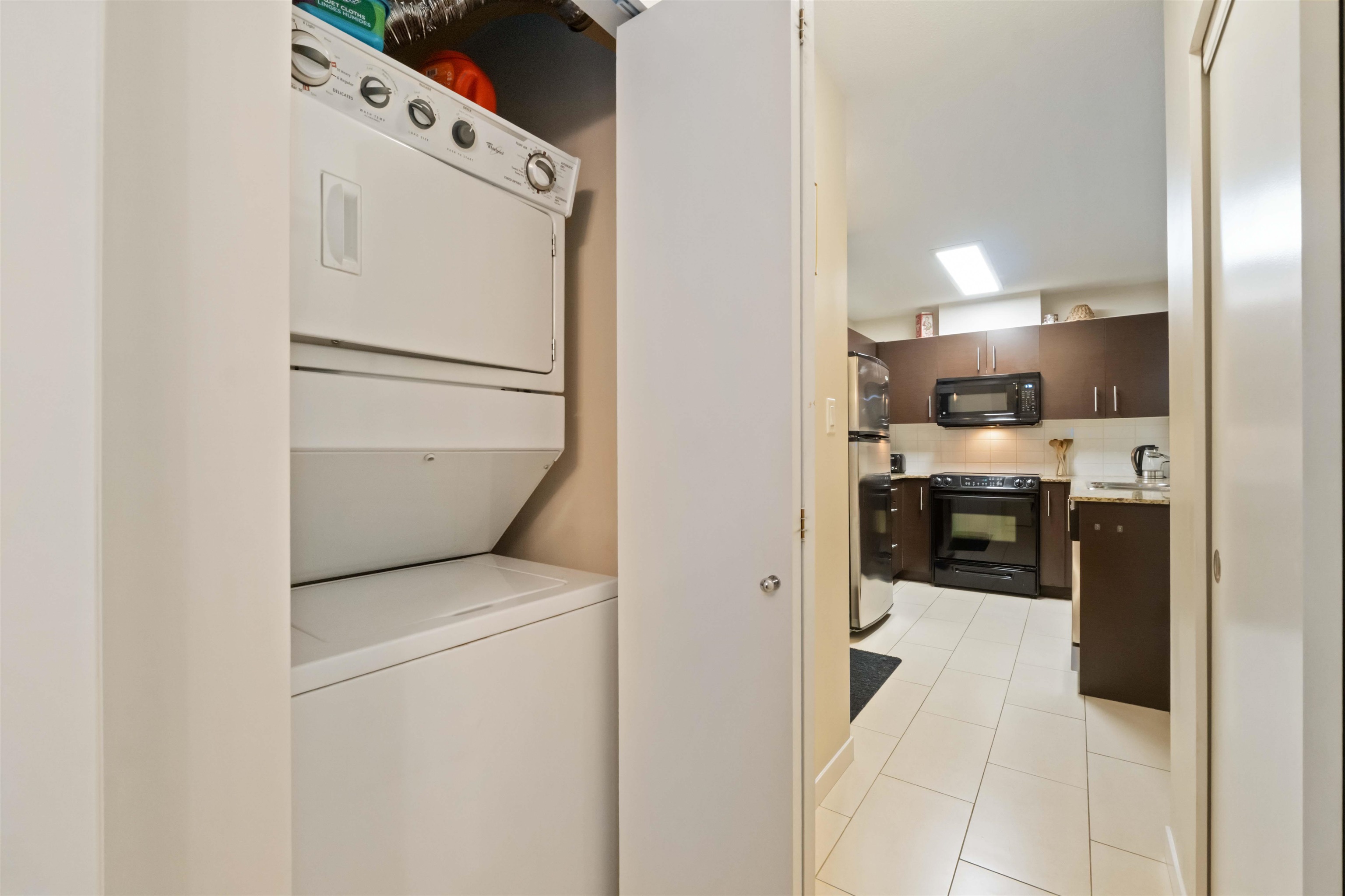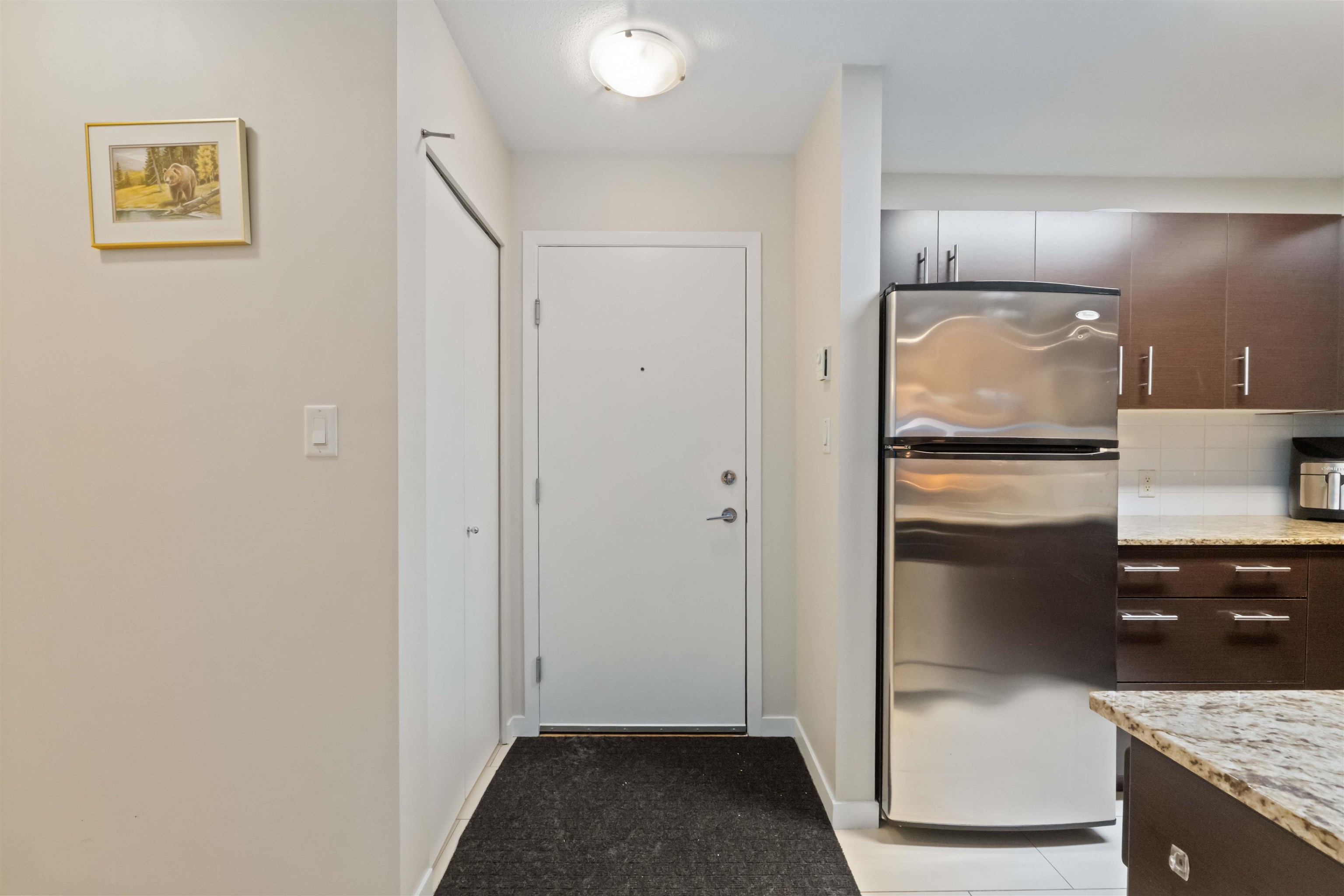 Spacious top-floor 1 bedroom plus den home featuring a well-designed open-concept floor plan and peaceful greenbelt exposure. With over 700 sqft the modern kitchen is equipped with granite countertops and stainless steel appliances, ideal for everyday living and entertaining. Large windows bring in natural light, while the generous balcony overlooks the greenbelt, offering added privacy and a tranquil outdoor retreat. Conveniently located within walking distance to town, transit, West Coast Express, and rec...