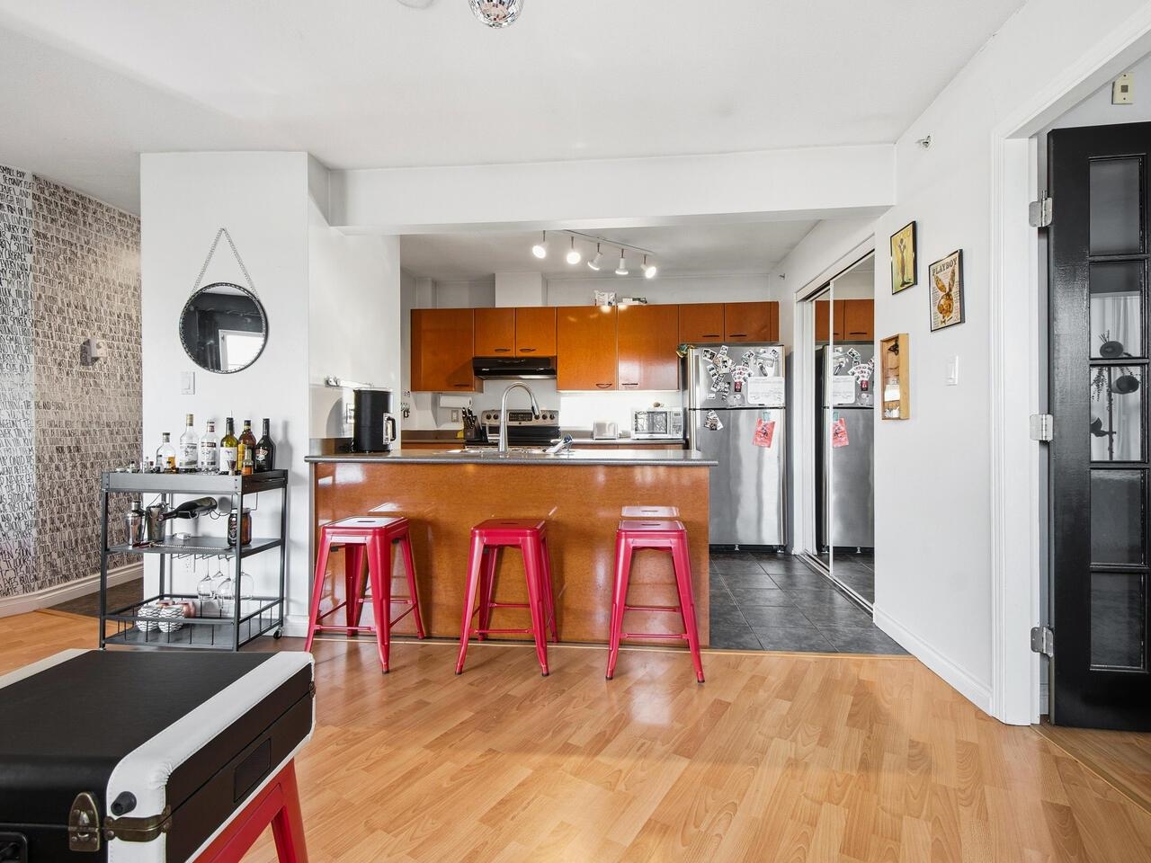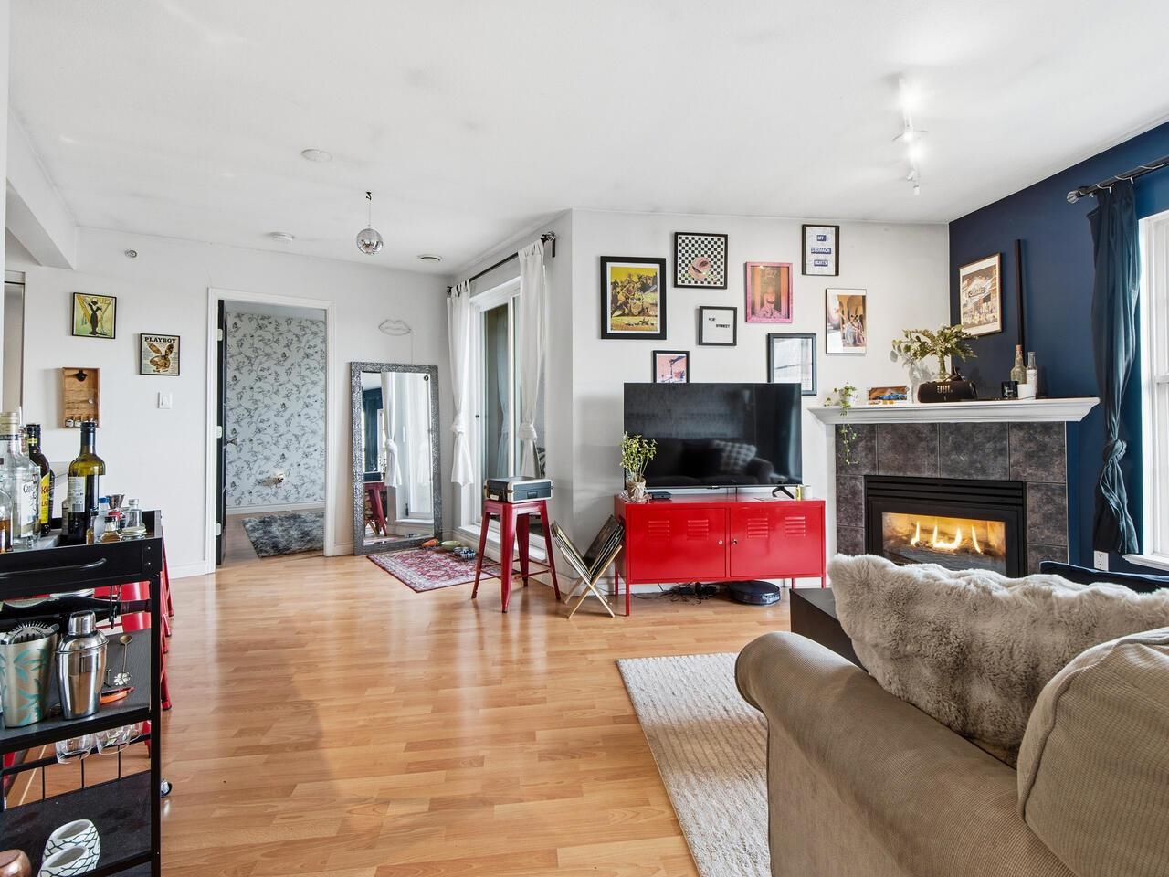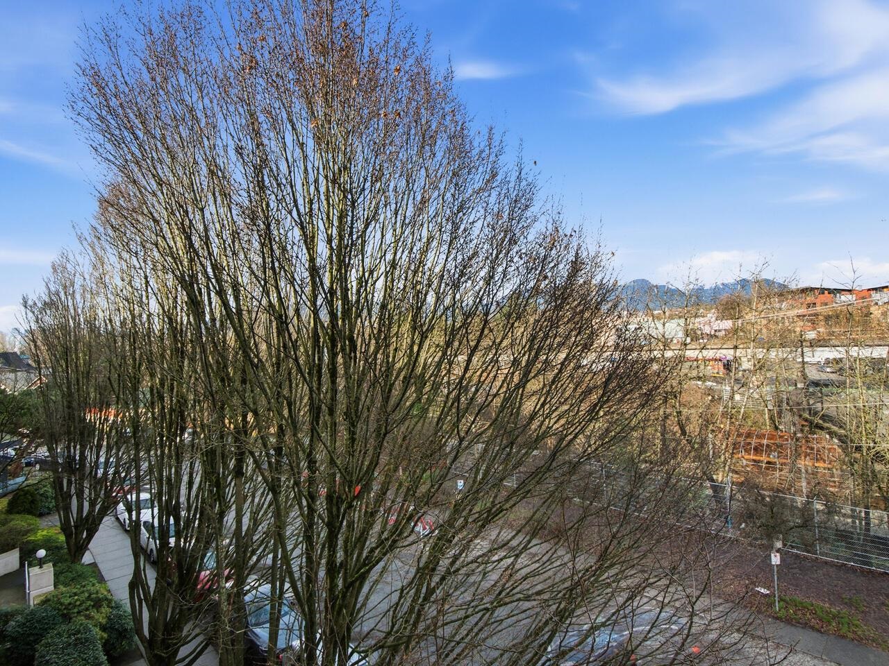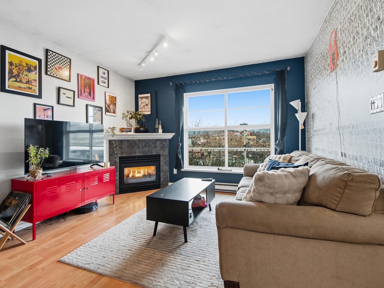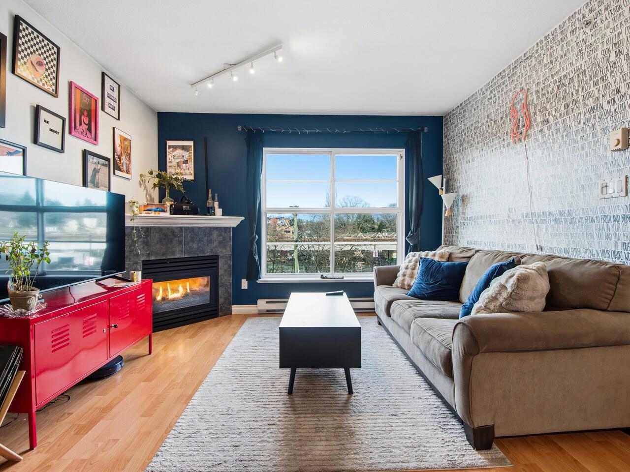 Wow, this floorplan packs a lot into its 783 sq ft, featuring 2 bedrooms, 2 bathrooms, open plan kitchen with a generous pantry and tons of cupboard space. The top floor has views of the gorgeous north shore mountains in winter and tree canopy in the summer and fall. Steps from Broadway and Commercial transit hub, literally at the centre of it all, no need for a car, yet EV ready parking stall is also included. Modern decor is complimented by a cozy fireplace and bold graphics - to suit its hip vibe. Thi...