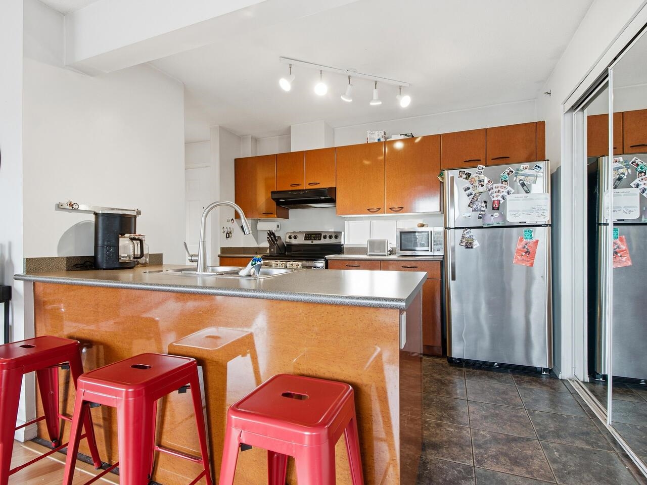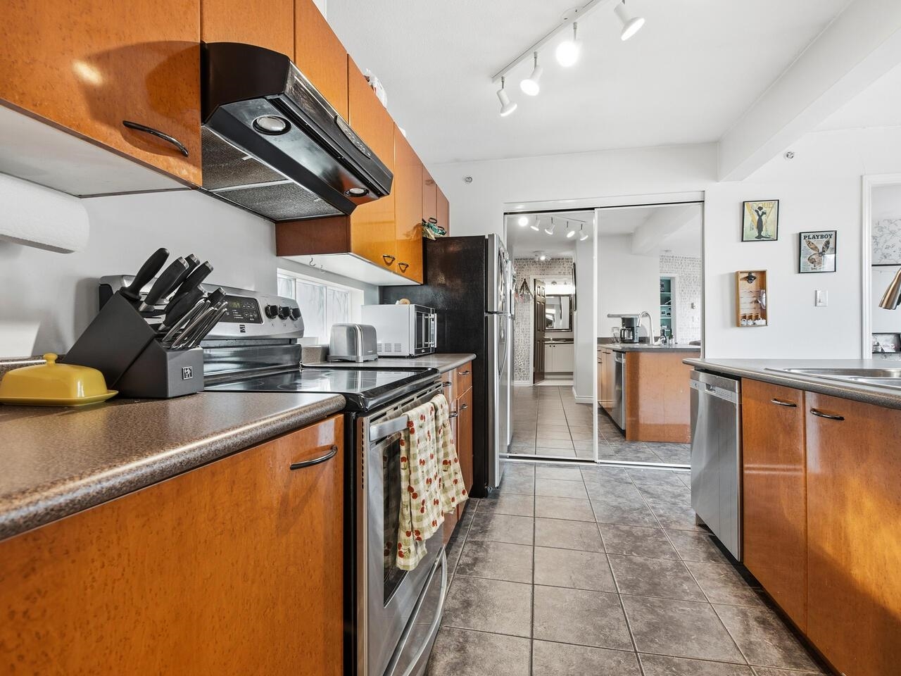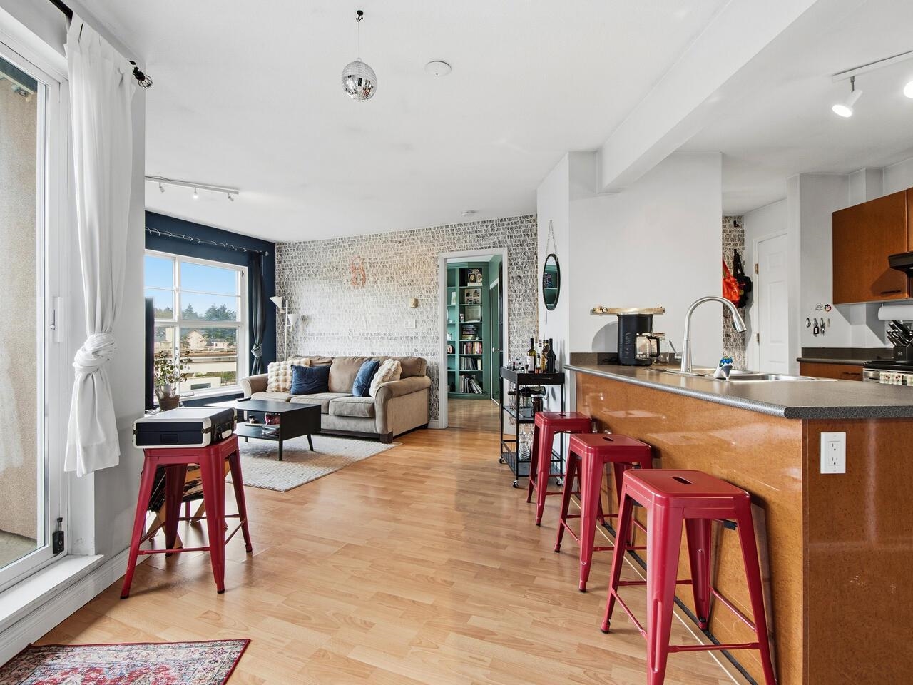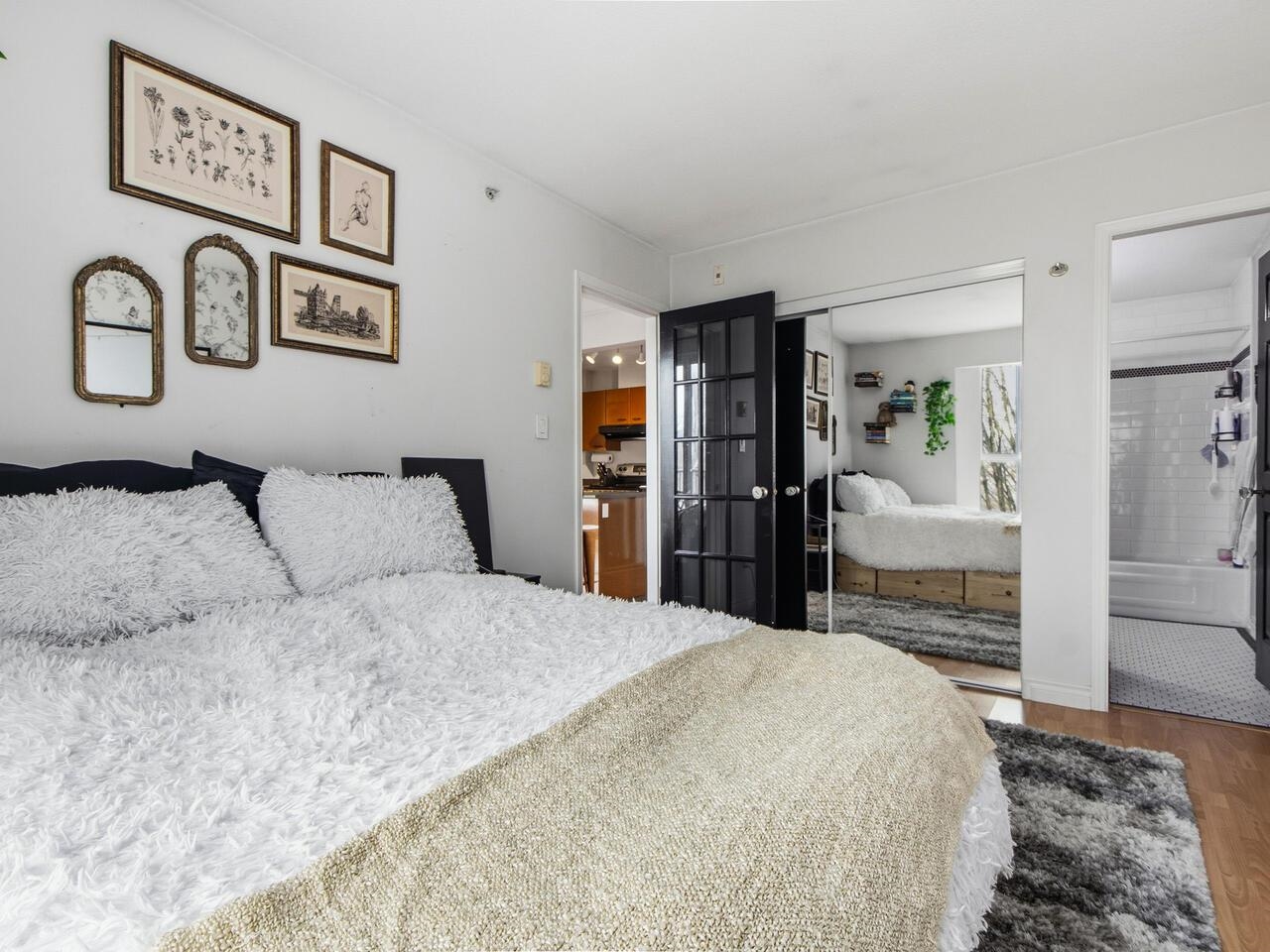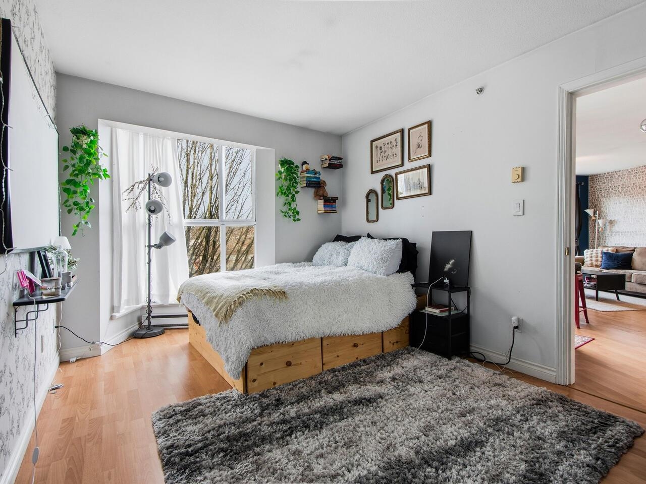 Wow, this floorplan packs a lot into its 783 sq ft, featuring 2 bedrooms, 2 bathrooms, open plan kitchen with a generous pantry and tons of cupboard space. The top floor has views of the gorgeous north shore mountains in winter and tree canopy in the summer and fall. Steps from Broadway and Commercial transit hub, literally at the centre of it all, no need for a car, yet EV ready parking stall is also included. Modern decor is complimented by a cozy fireplace and bold graphics - to suit its hip vibe. Thi...