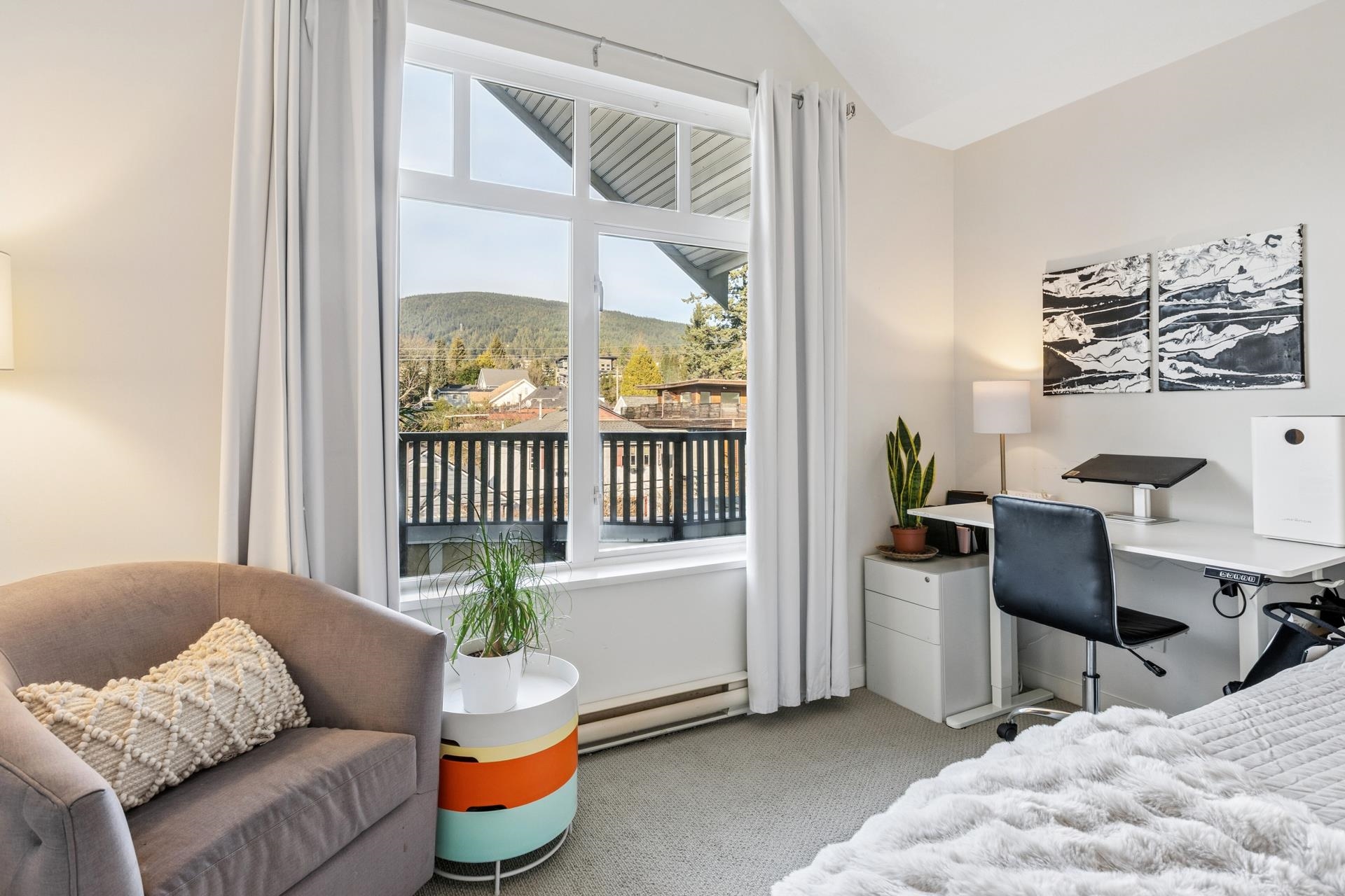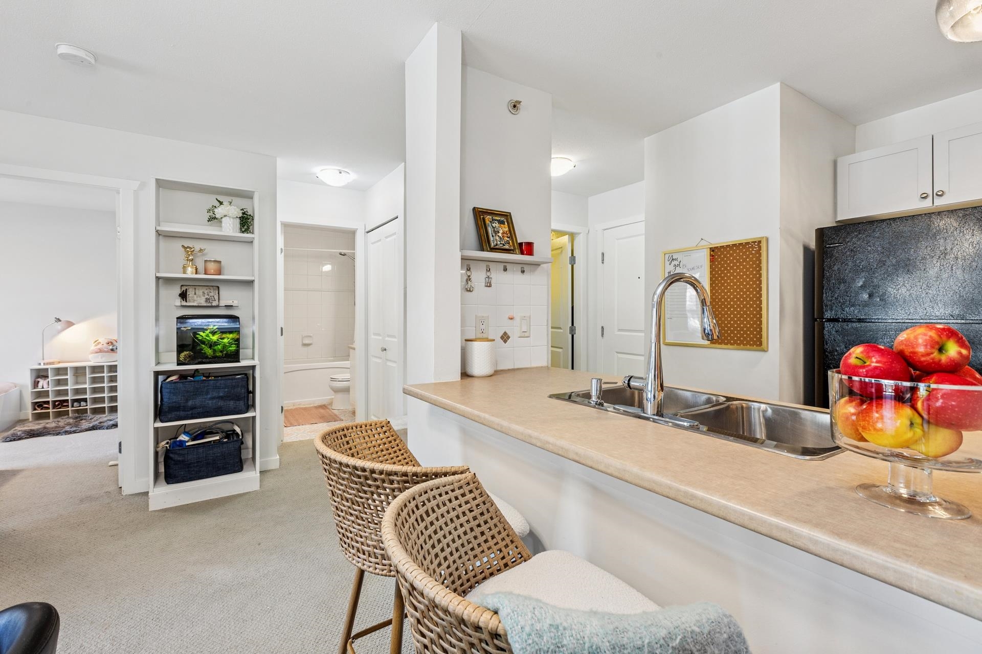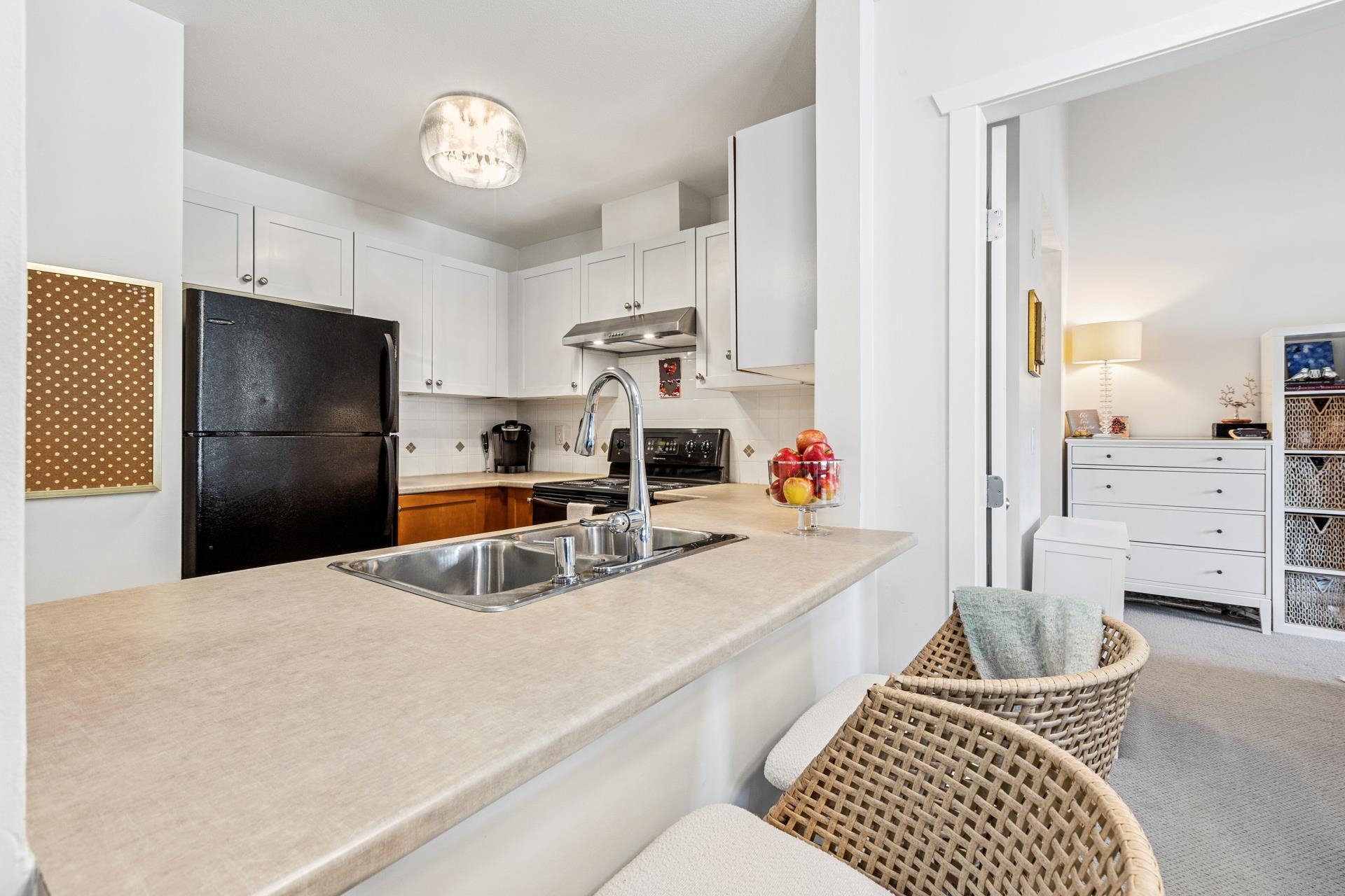 Top-floor 2 bdrm + den with over 1,000 sq/ft incl an open-concept kitchen, dining, and living area - ideal for everyday living and entertaining. The living room features a cozy fireplace, large picture windows, and access to a covered balcony perfect for year round use. The kitchen includes two-tone cabinetry, a recently upgraded dishwasher, and a breakfast bar. Bedrooms are well-separated for privacy; the primary boasts 15-ft vaulted ceilings, two closets, space for a seating or work area, and a 4-piece e...