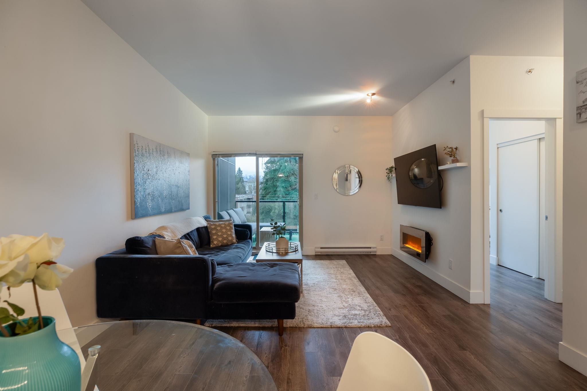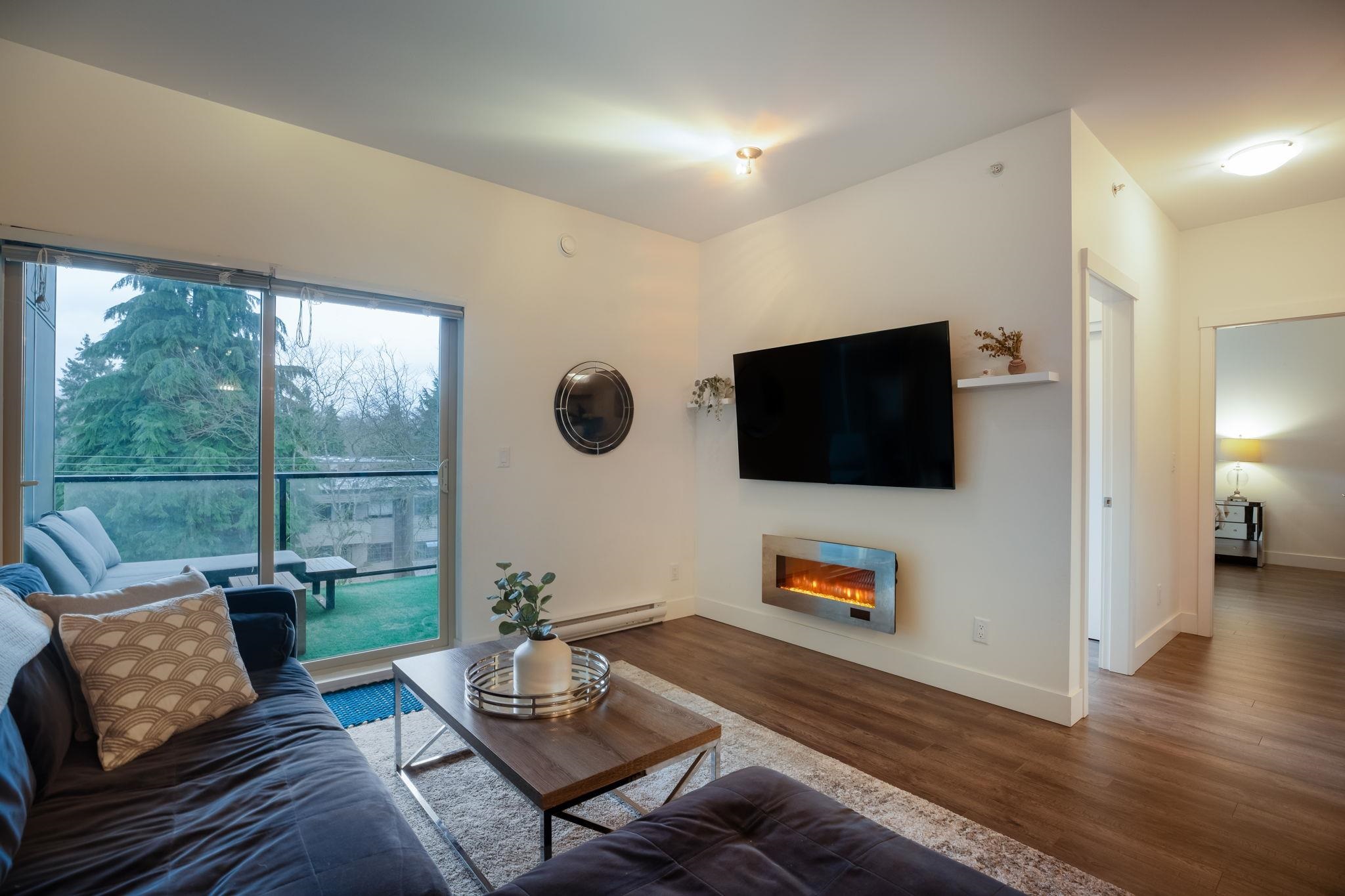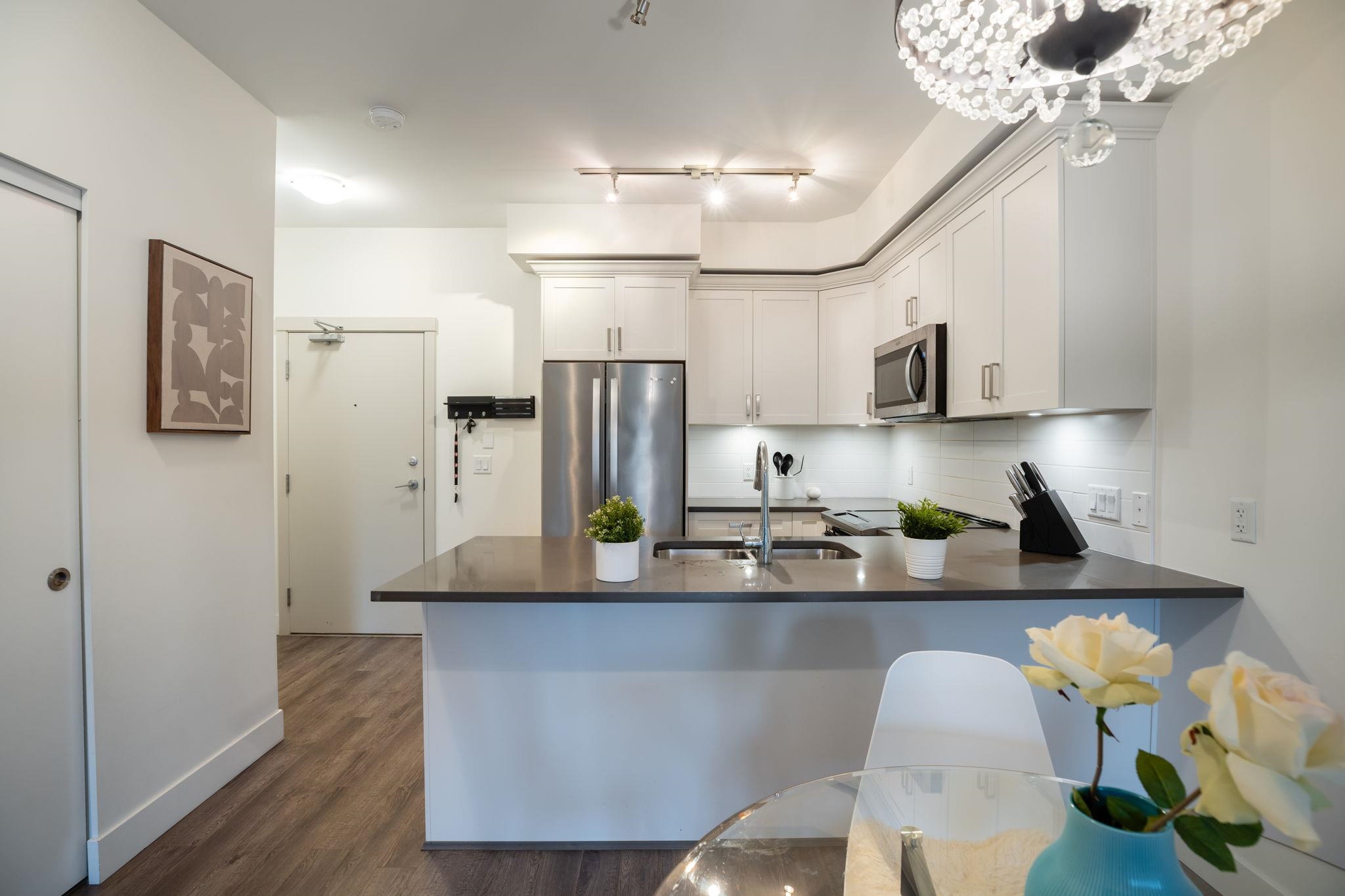 Welcome to LUMIERE in the heart of Downtown Port Coquitlam! This top-floor 1072 sqft, 2 bed + den, 2 bath home offers a bright open layout with 10’ ceilings in the living area. Modern kitchen with quartz countertops, breakfast bar, stainless steel appliances, and white shaker cabinetry. Features include 12mm laminate flooring, smart thermostat, and roughed-in central vacuum. Vaulted ceiling in the master bedroom. Enjoy two covered balconies—perfect for entertaining. Steps to transit, schools, West Coast Exp...