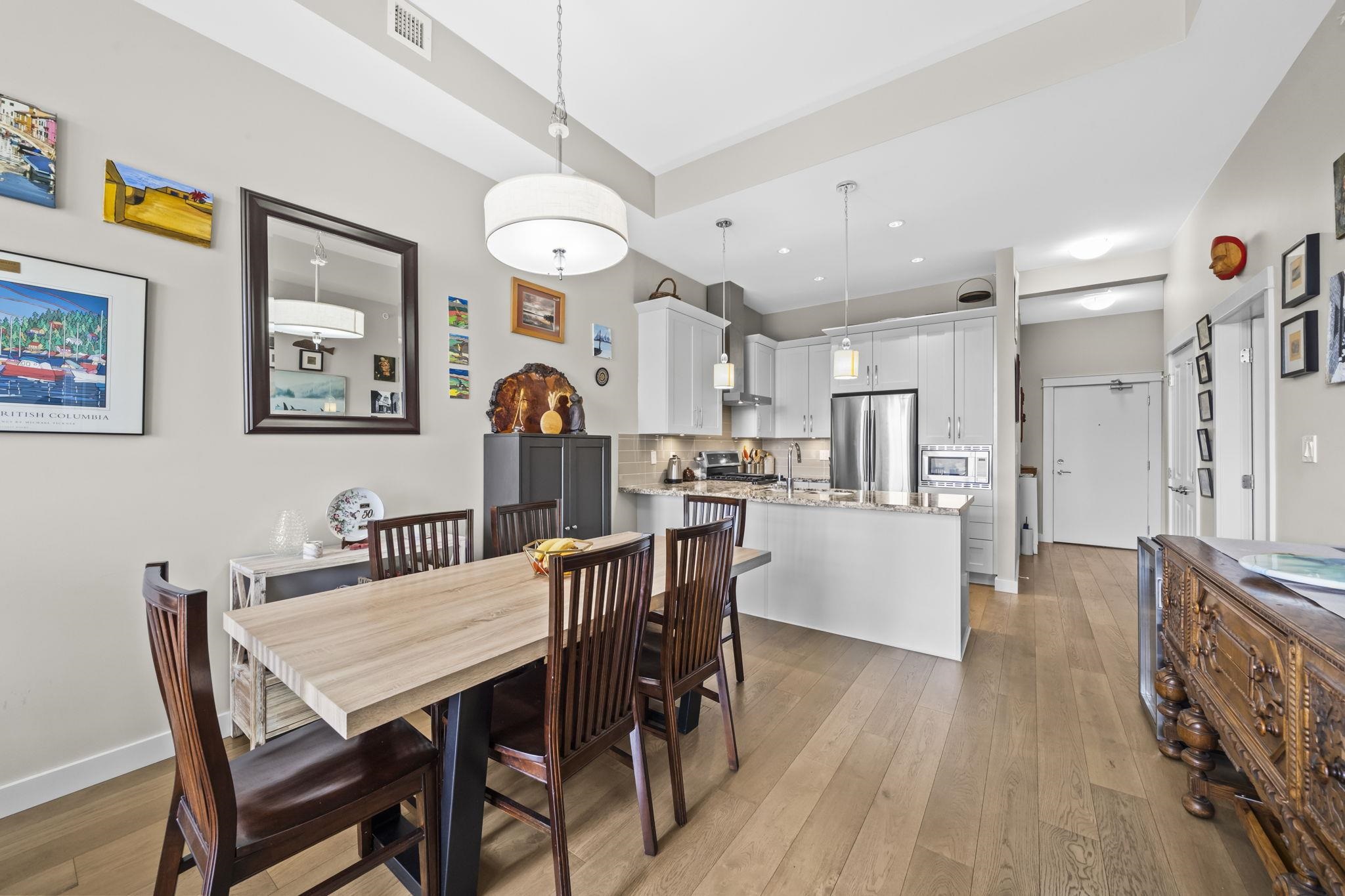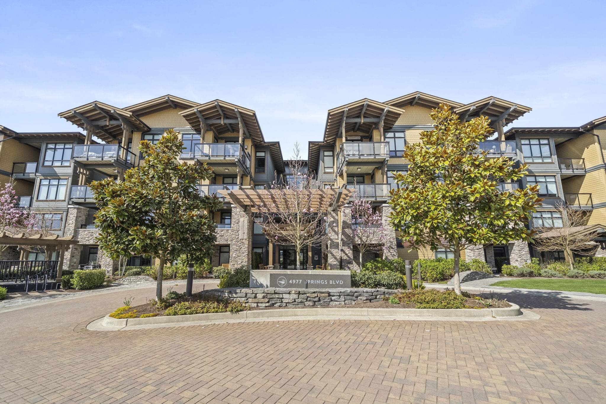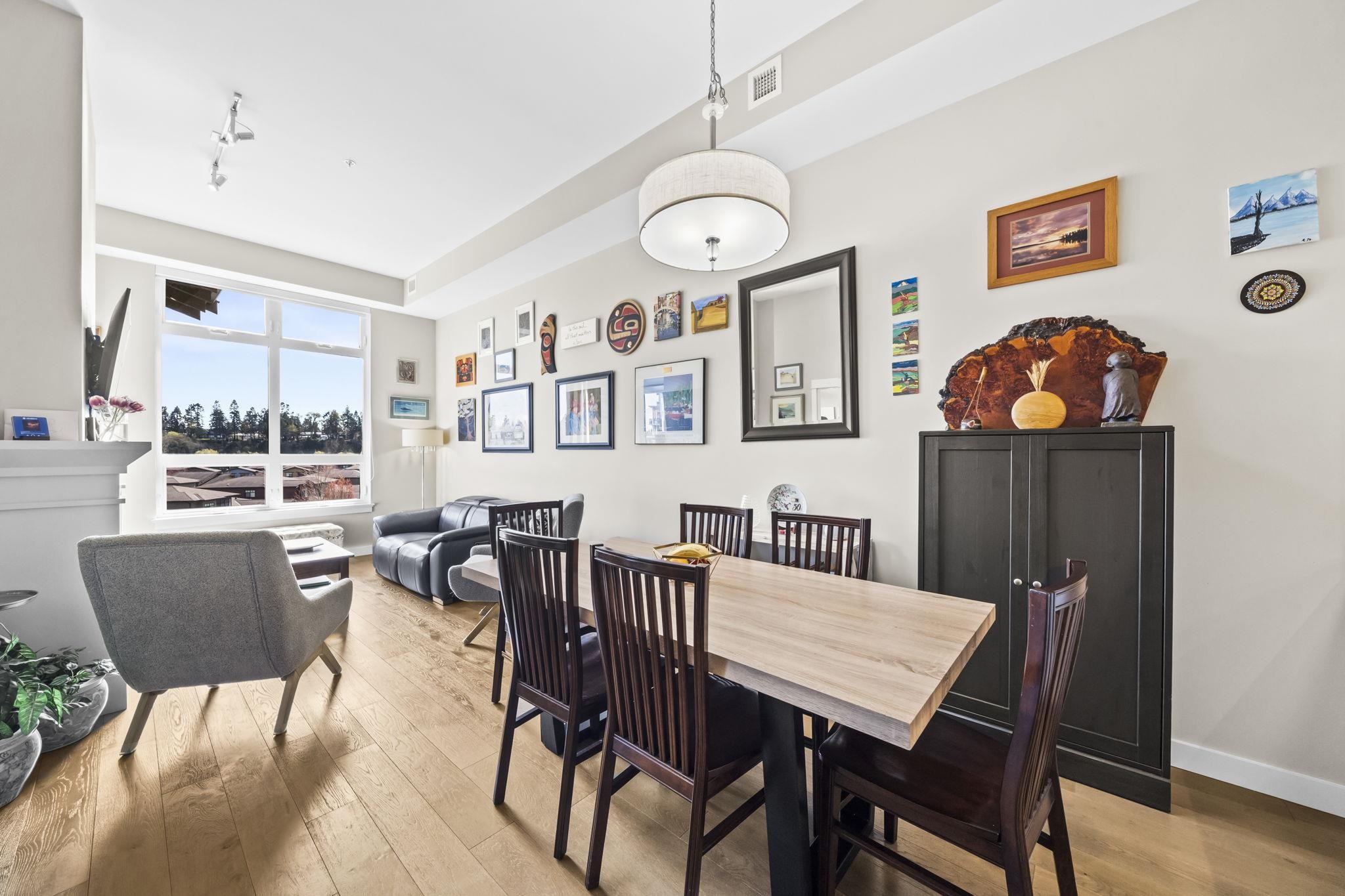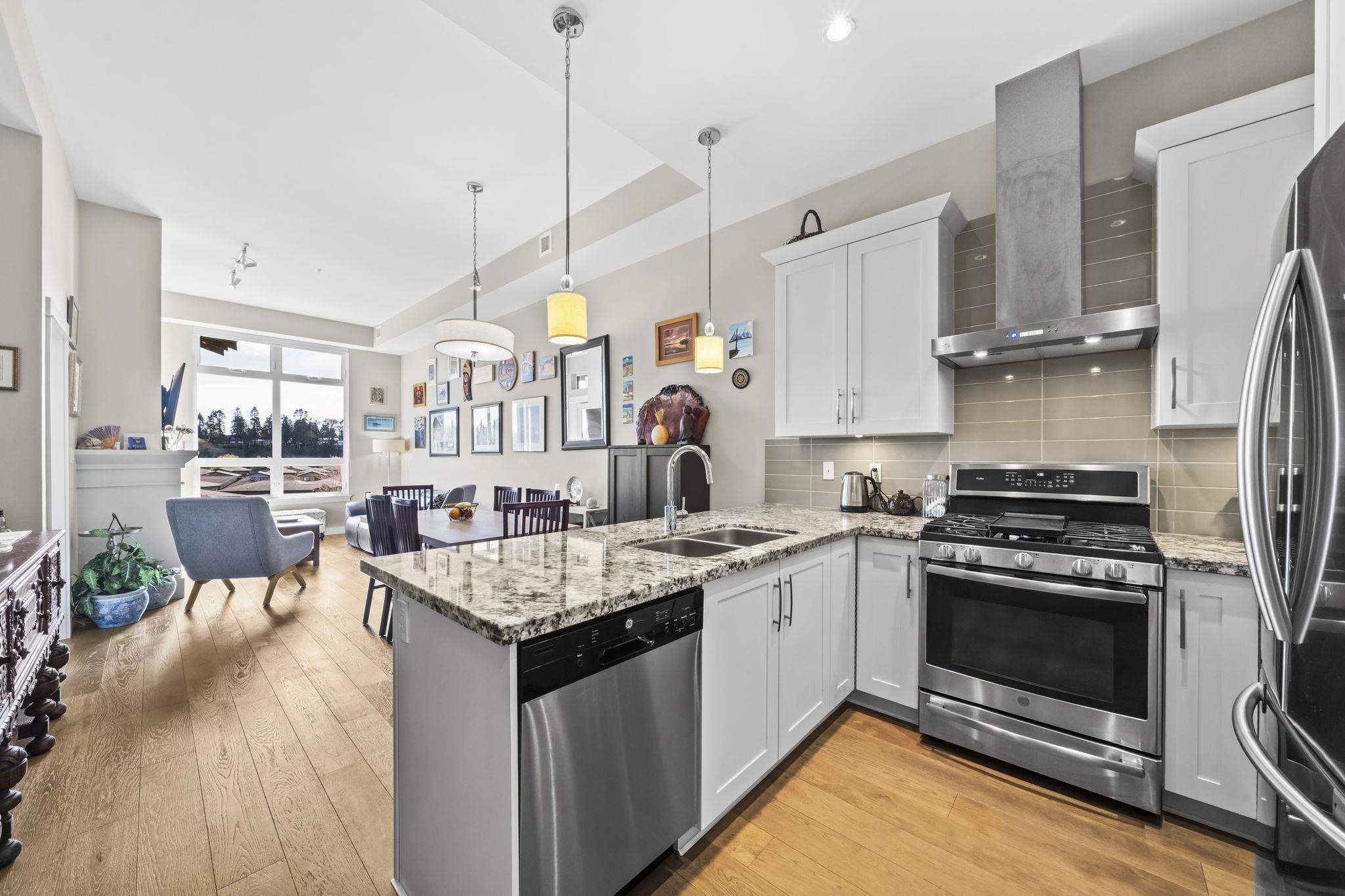 Stunning 2 bed+den penthouse at Tsawwassen Springs offering breathtaking views & refined modern living. This bright 1,000+ SF home features high ceilings, expansive open-concept living & high-end finishes throughout. Enjoy engineered wide plank hardwood flooring, granite countertops, shaker cabinets & s/s appliances. The spacious layout includes 2 large bedrooms, a versatile flex/den ideal for storage or pantry use, a/c, heated floors & cozy gas fireplace. Step out to your sunlit NW facing covered patio wit...