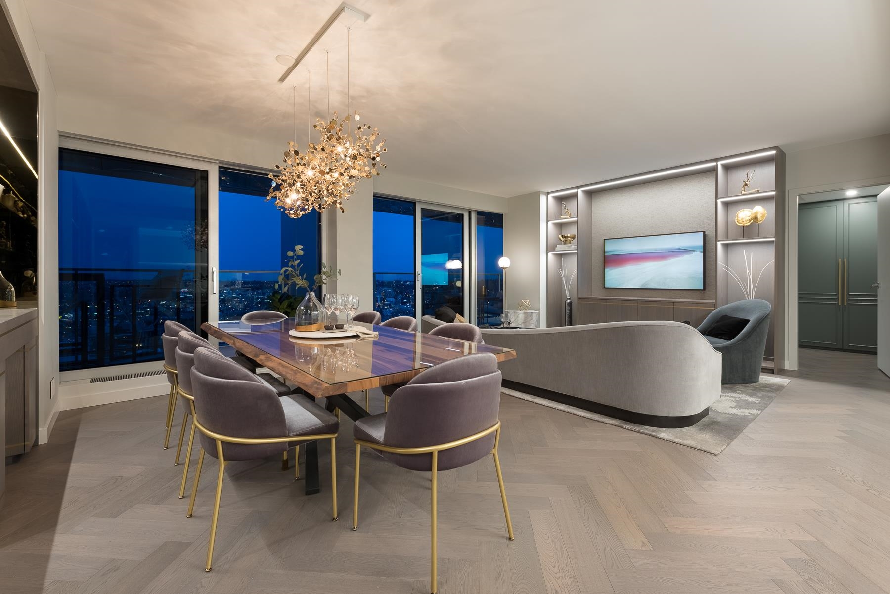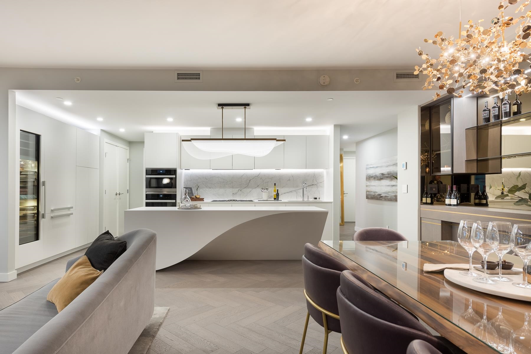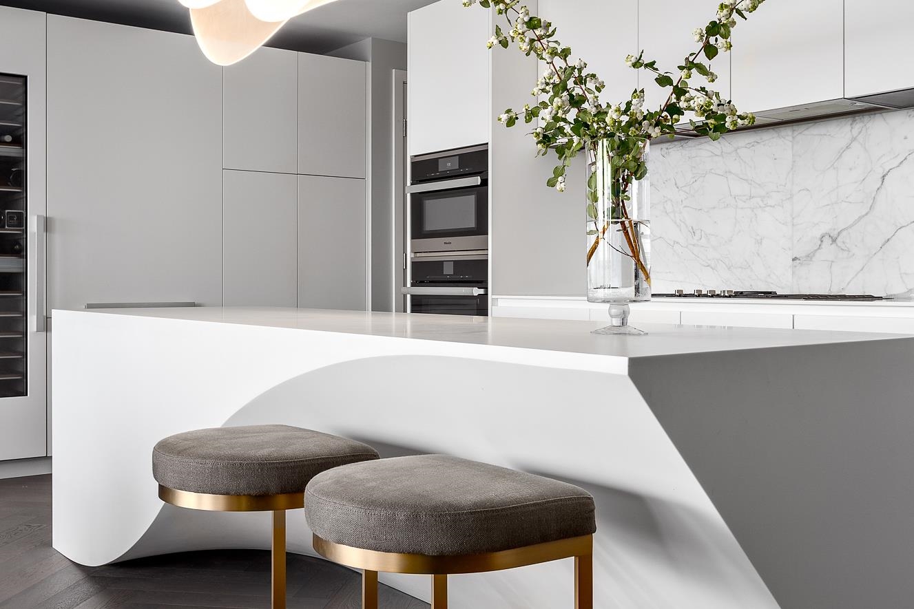 GEORGIE AWARD FINALIST! An extraordinary estate in the sky, this stunning residence showcases a spectacular renovation with bespoke millwork and elevated design throughout. Herringbone hardwood floors lead to a dramatic entertaining space designed by Kalu Interiors & built by Tall Tree Construction. Brass-inlaid walnut cabinetry with LED lighting and floating glass shelves is set against a smoked glass backdrop, creating warmth and sophistication. A discreet secret door separates the private primary suite. ...