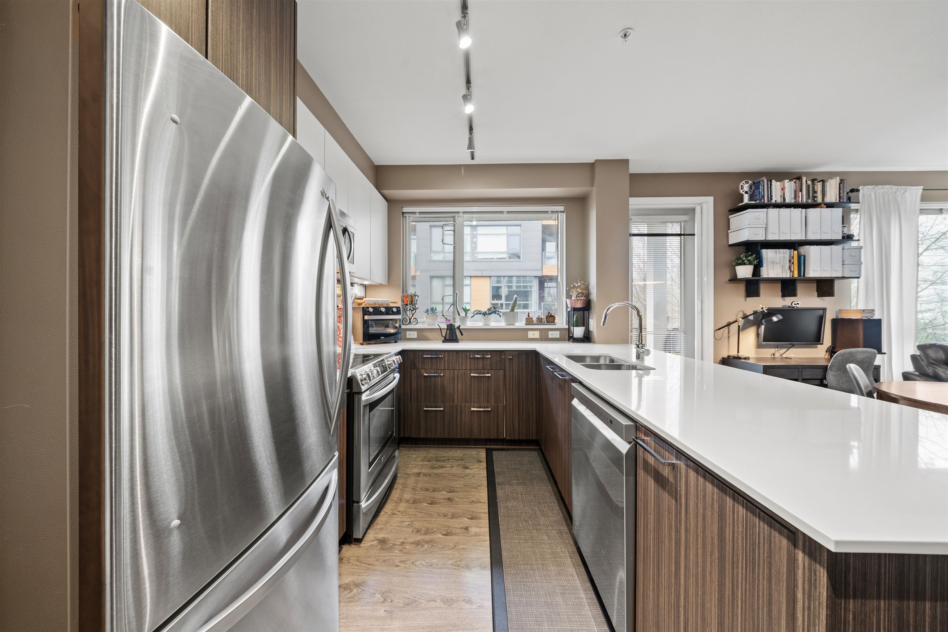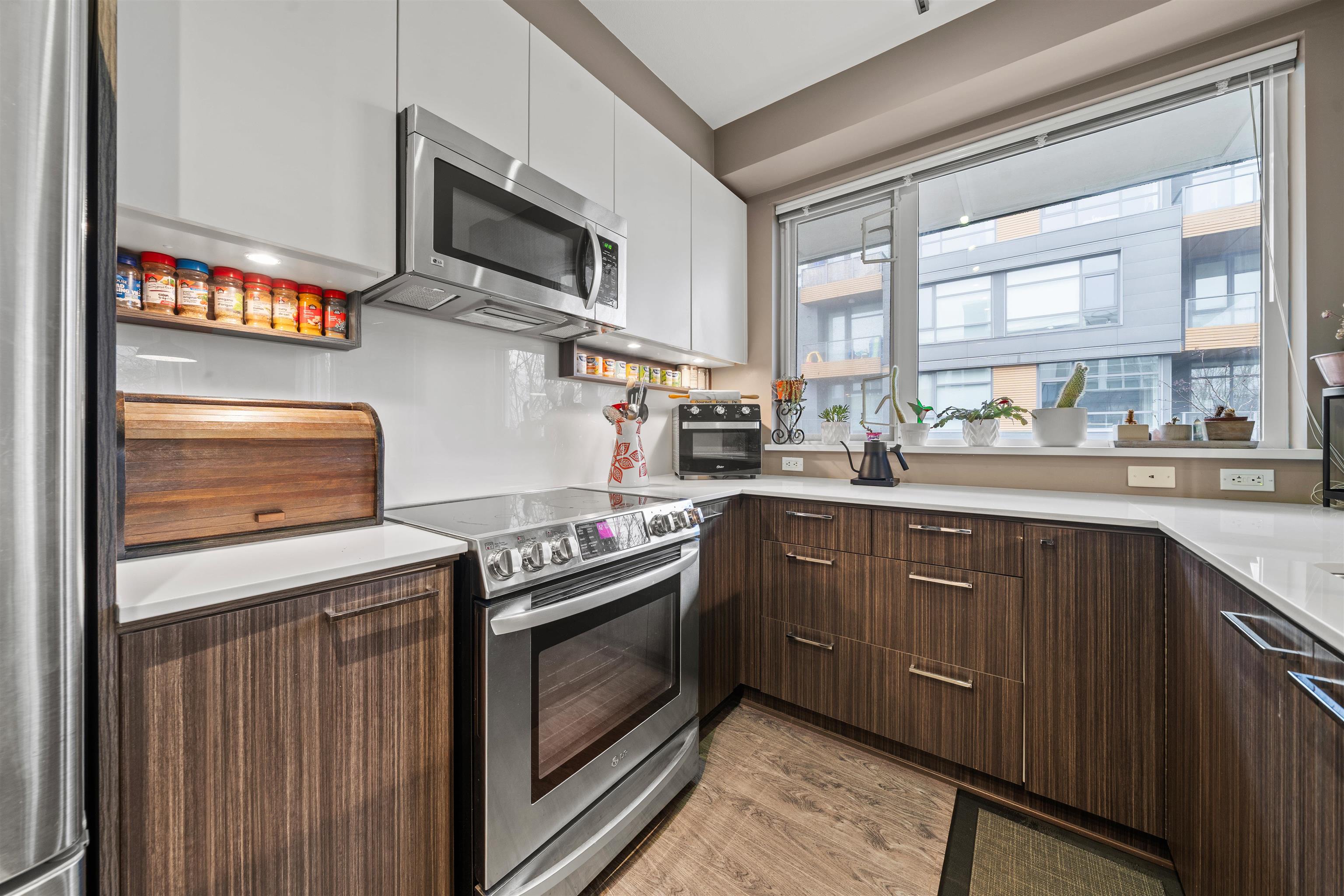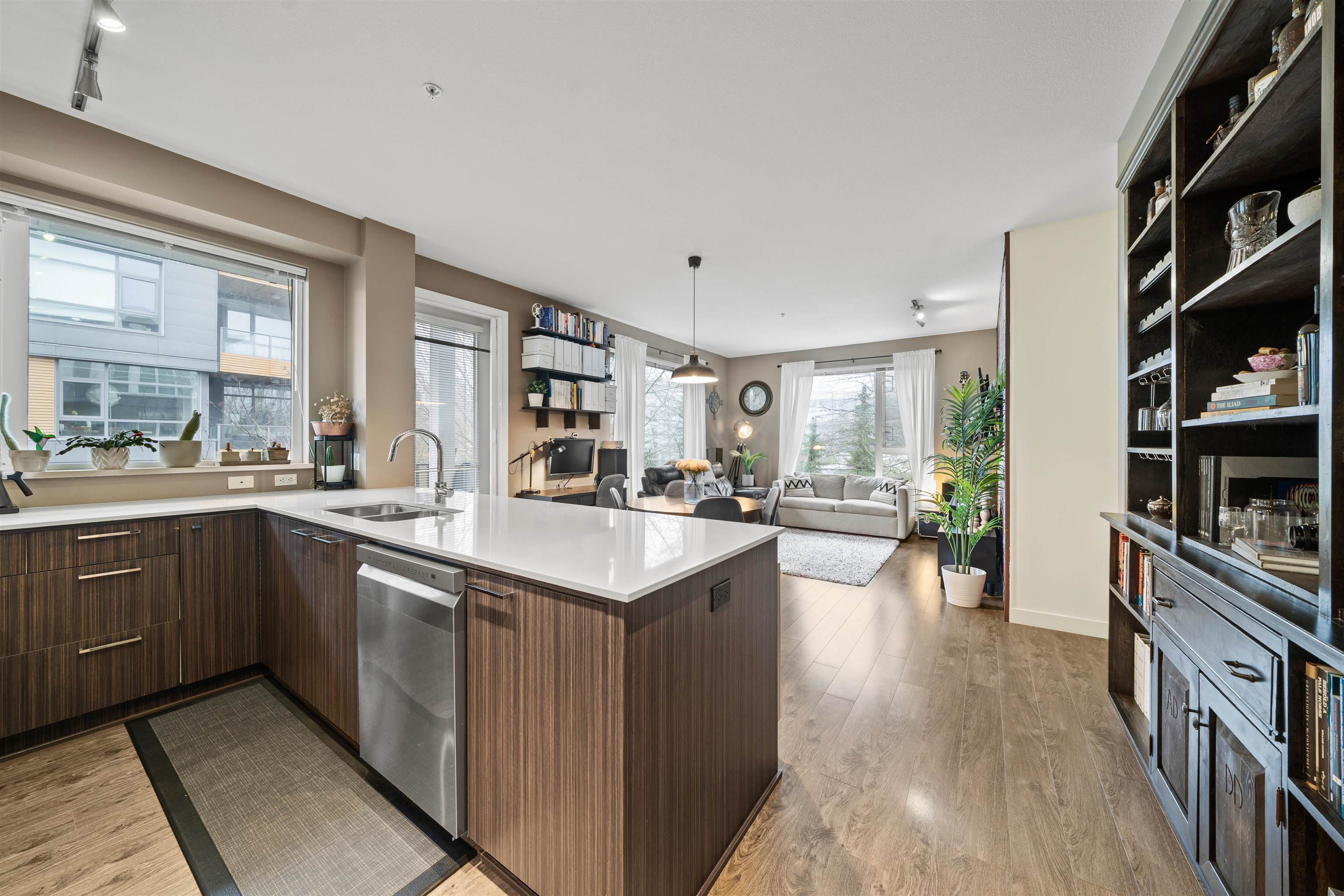 Welcome to Nest by Mosaic on Burnaby Mountain, where nature and lifestyle meet. This northwest-facing, 2 bedroom, 2 full bathroom, 2 balcony, corner unit includes a striking brick-inspired feature wall, custom built-in cabinetry, quartz countertops, and stainless steel appliances, perfect for everyday living and entertaining. The primary bedroom includes a walk-in closet and spa-like ensuite. A major highlight is TWO Parking Stalls, a rare and valuable offering on Burnaby Mountain. Quality finishes include ...