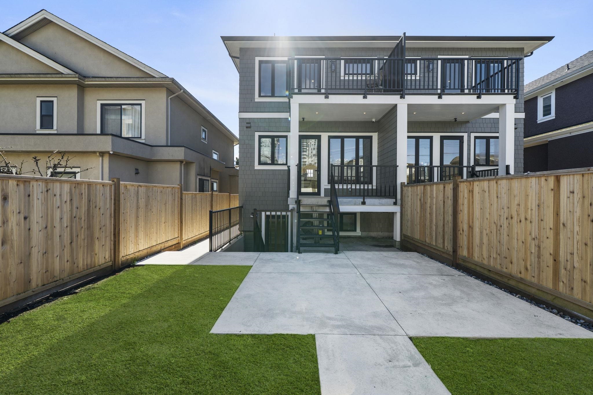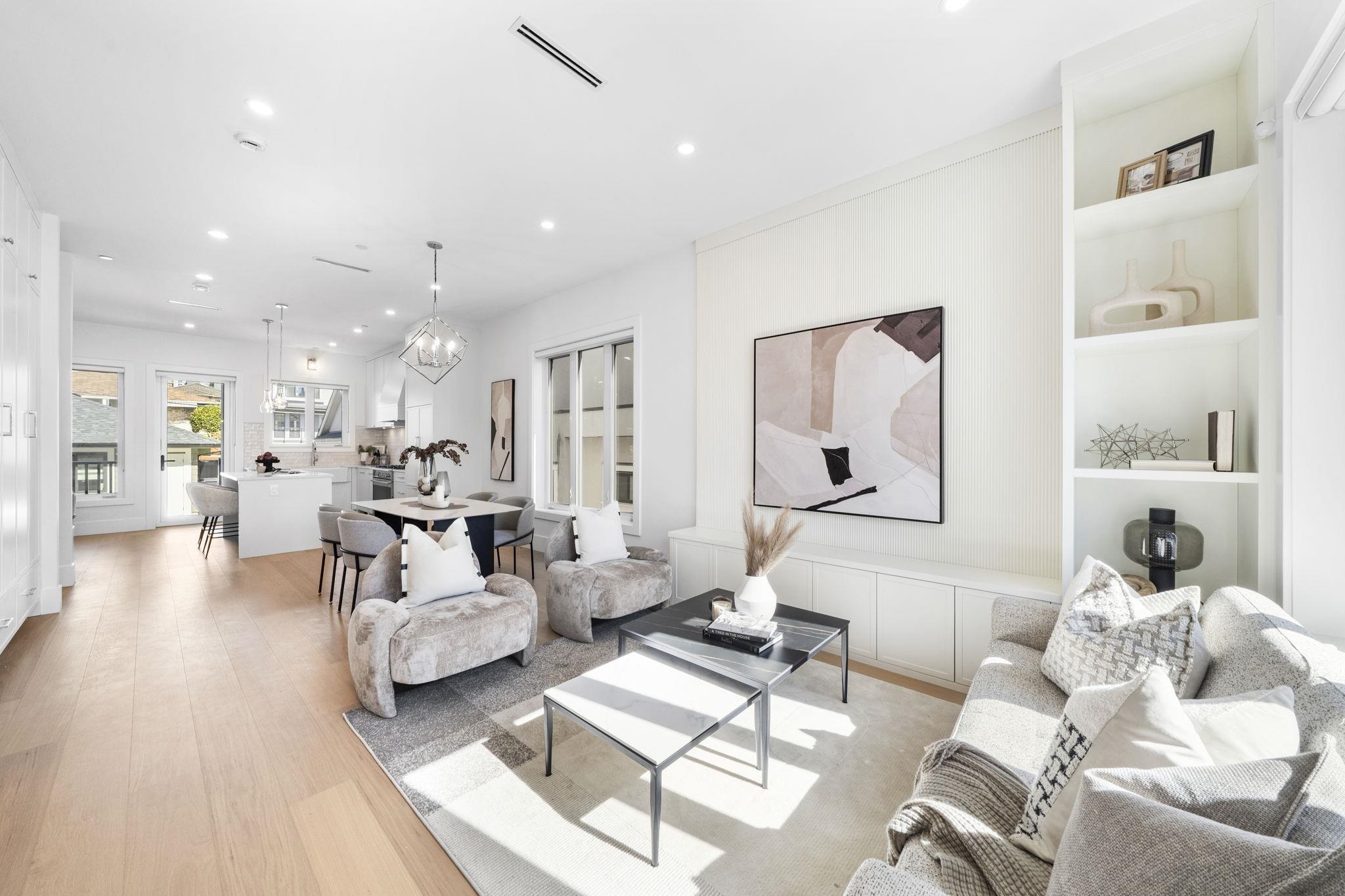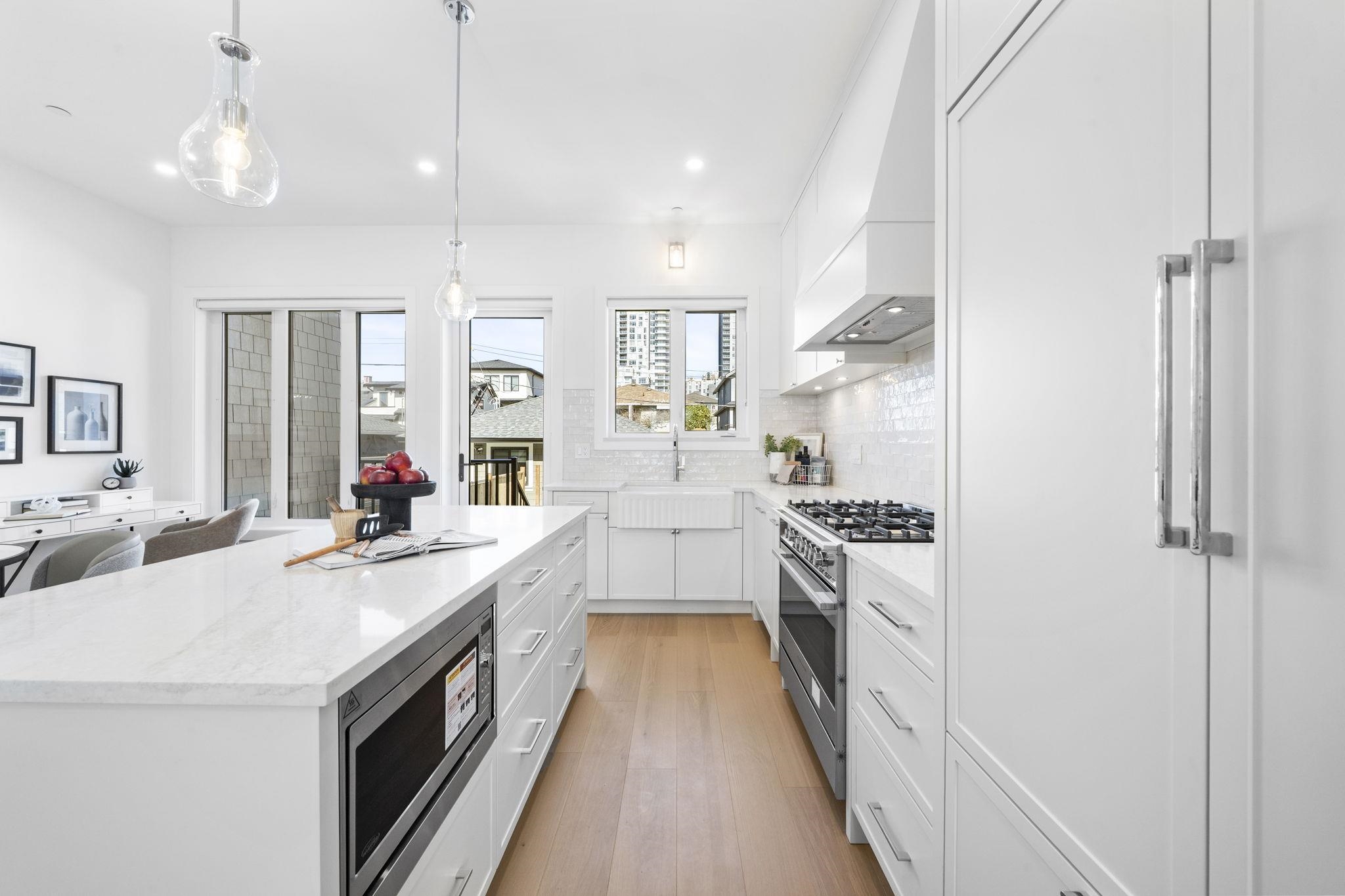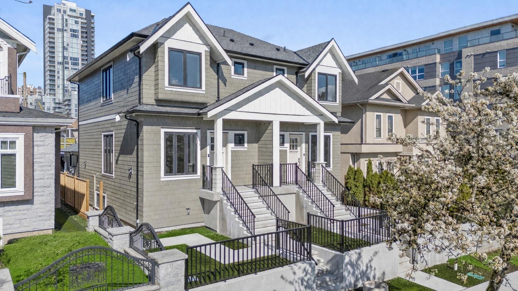 Welcome HOME to this QUALITY built craftsman-style SIDE x SIDE duplex 46ft wide lot, amazing CAMBIE location, just an 8min walk from Marine Gateway skytrain! This BRIGHT, SUNNY, efficient 4bd 3.5bth home incl DIRECT interior access to 1bd 1bth suite w/separate entrance – you can AIRBNB THIS SUITE! Feel the LUXURY the moment you enter this home w/ EXQUISITE millwork, engineered hardwood floors, radiant heat, A/C, 10ft HIGH CEILINGS & DESIGNER powder room! You will LOVE spending time w/family in the CHEFS KI...