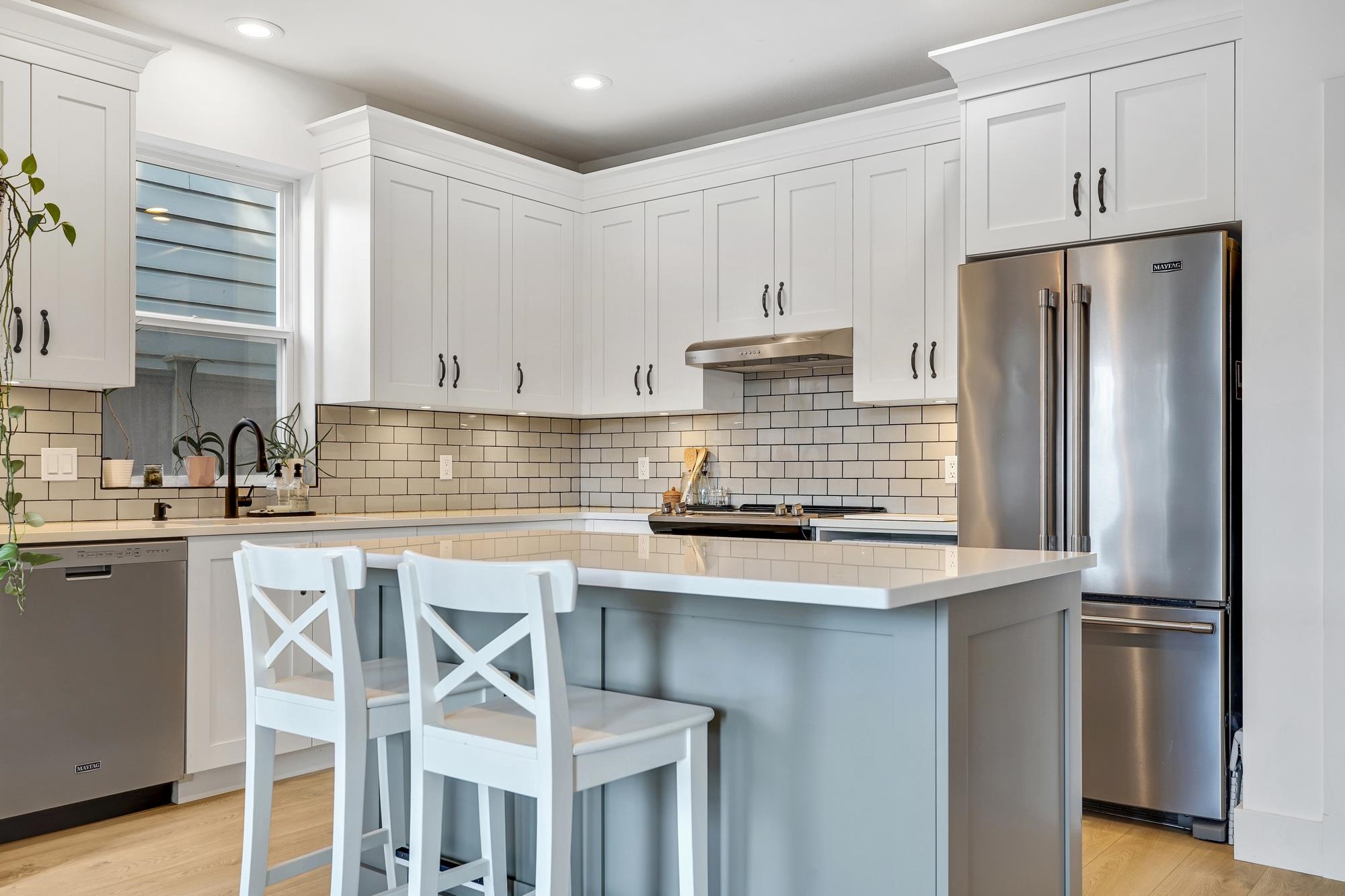 Charming and spacious 1,842 sq ft home in well-maintained complex. This 3-bedroom, 3-bathroom residence features an open floor plan, large windows, and a sunny west-facing patio off the family room. Quality finishes include 9' ceilings, quartz countertops, stainless steel appliances, gas stove, rich cabinetry, custom millwork, and laminate flooring. Enjoy a fully fenced yard, detached garage, and bonus storage. Ideally located in a quiet, family-friendly Ladner neighborhood-just steps to schools, transit, r...