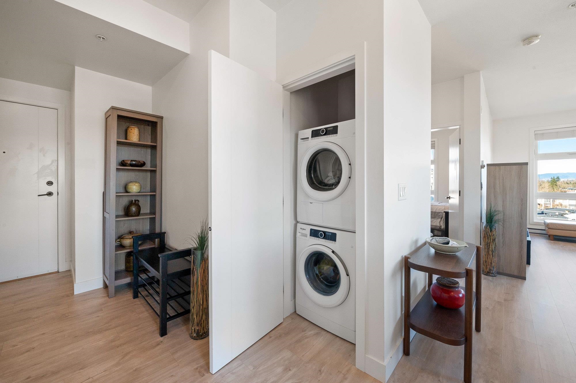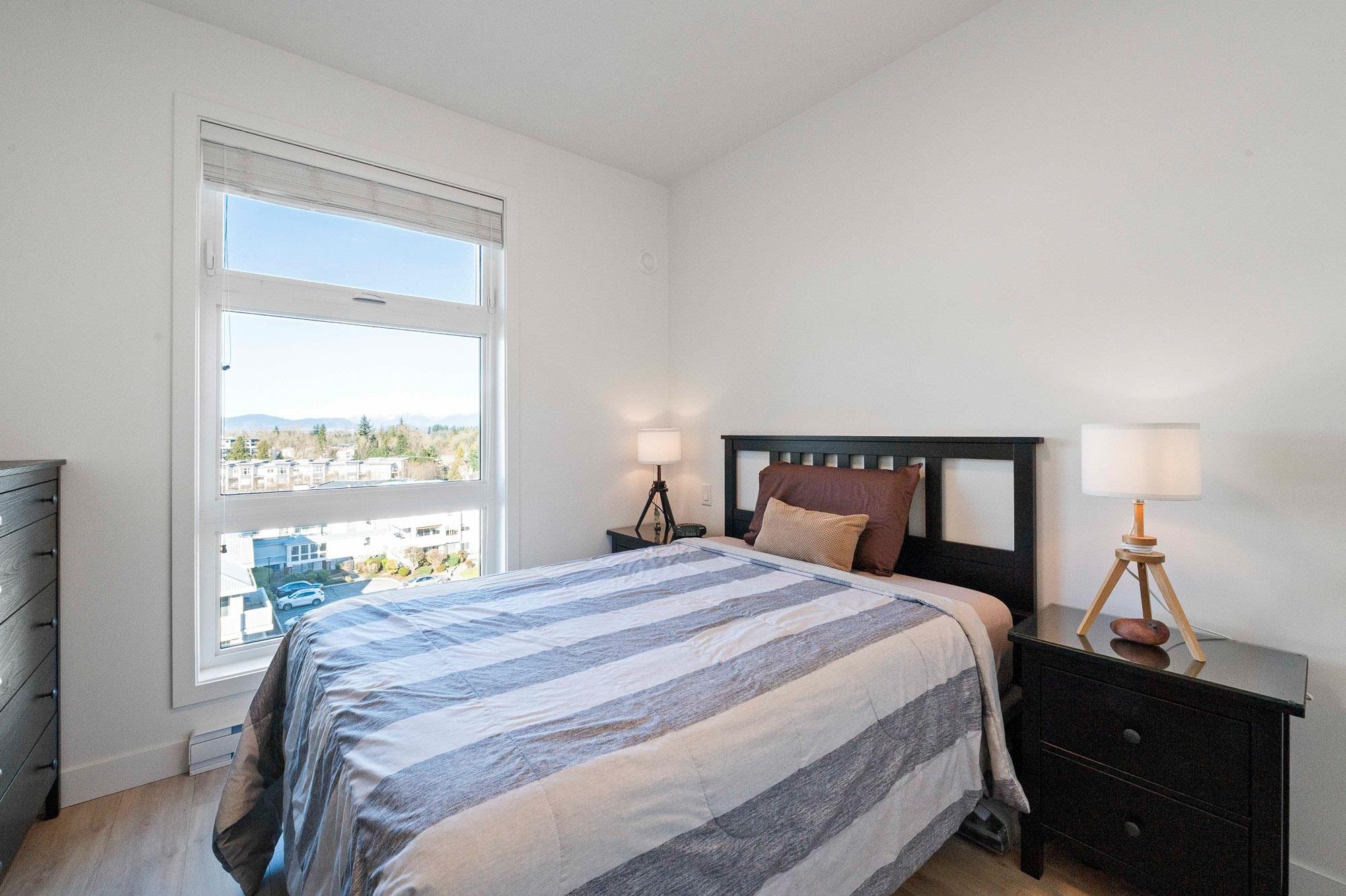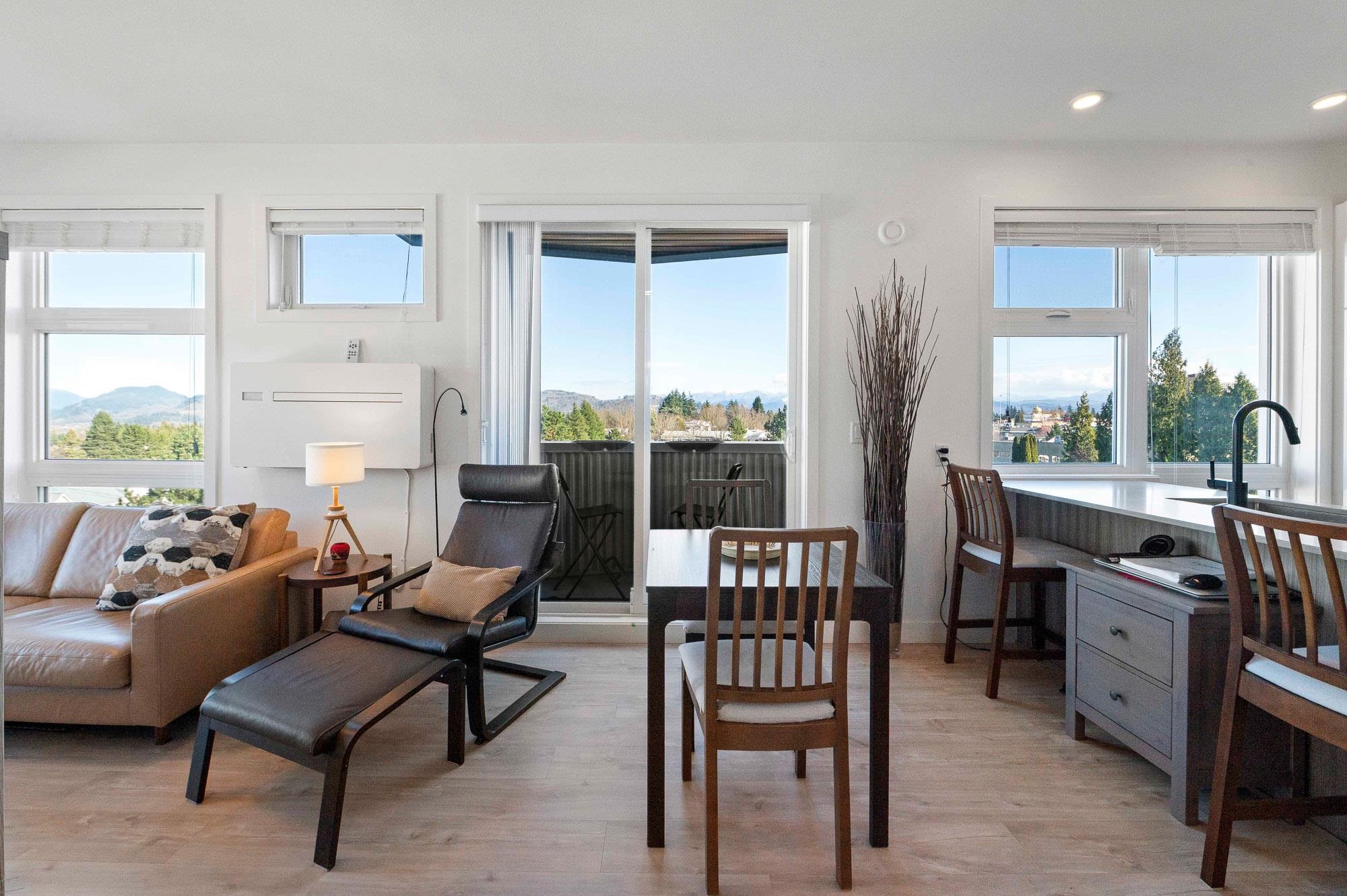 Penthouse living at The Court. Stunning Corner Unit with 180+ unobstructed views to enjoy your morning coffee. Amazing views from every room of Snow Capped Mountains to Mount Baker and beyond. Enjoy the solitude of top-floor privacy in this bright 1 bed, 1 bath home with floor-to-ceiling windows, 9' ceilings, and an open-concept 630 sq ft layout. One of Abbotsford's finest one bedroom condos. Modern kitchen with quartz countertops, stainless steel appliances and a large island. Brand-new A/C/Heat Pump. Upgr...