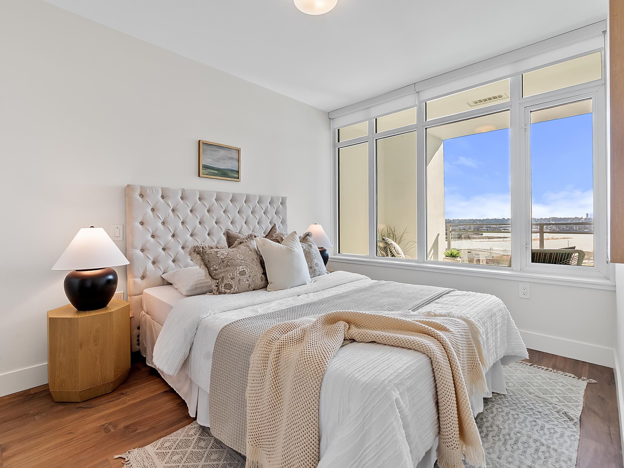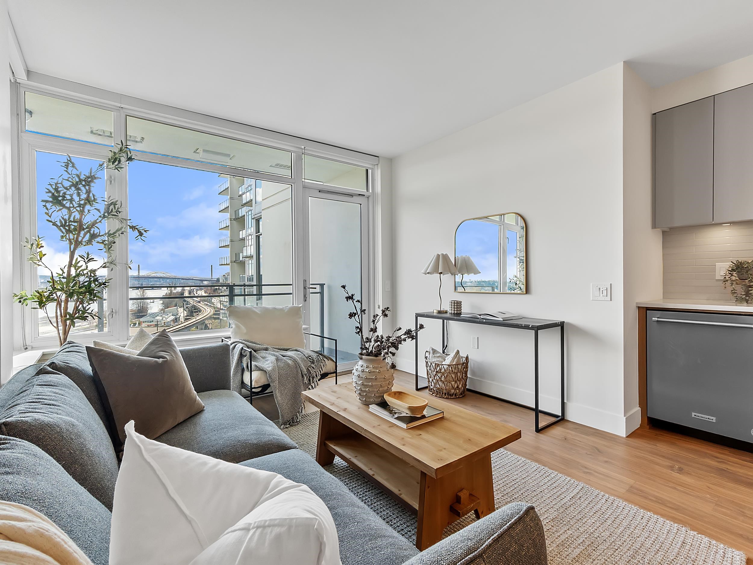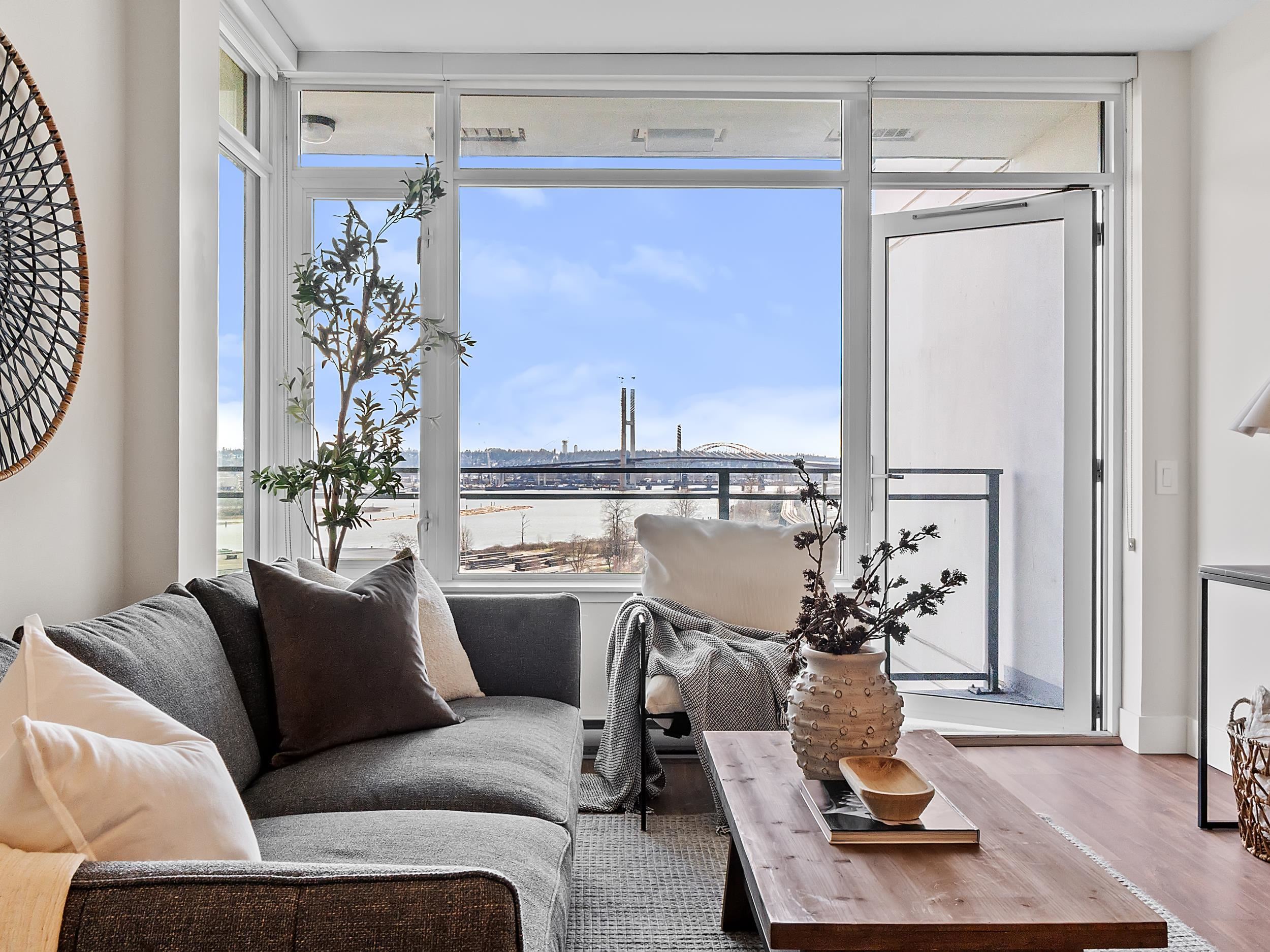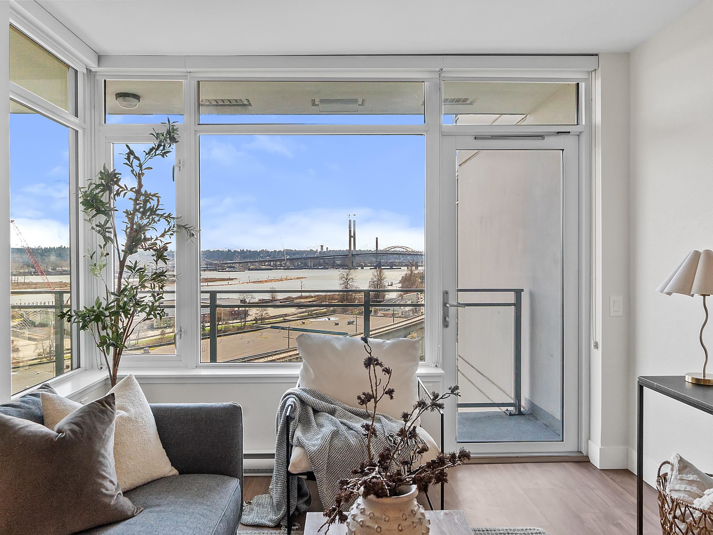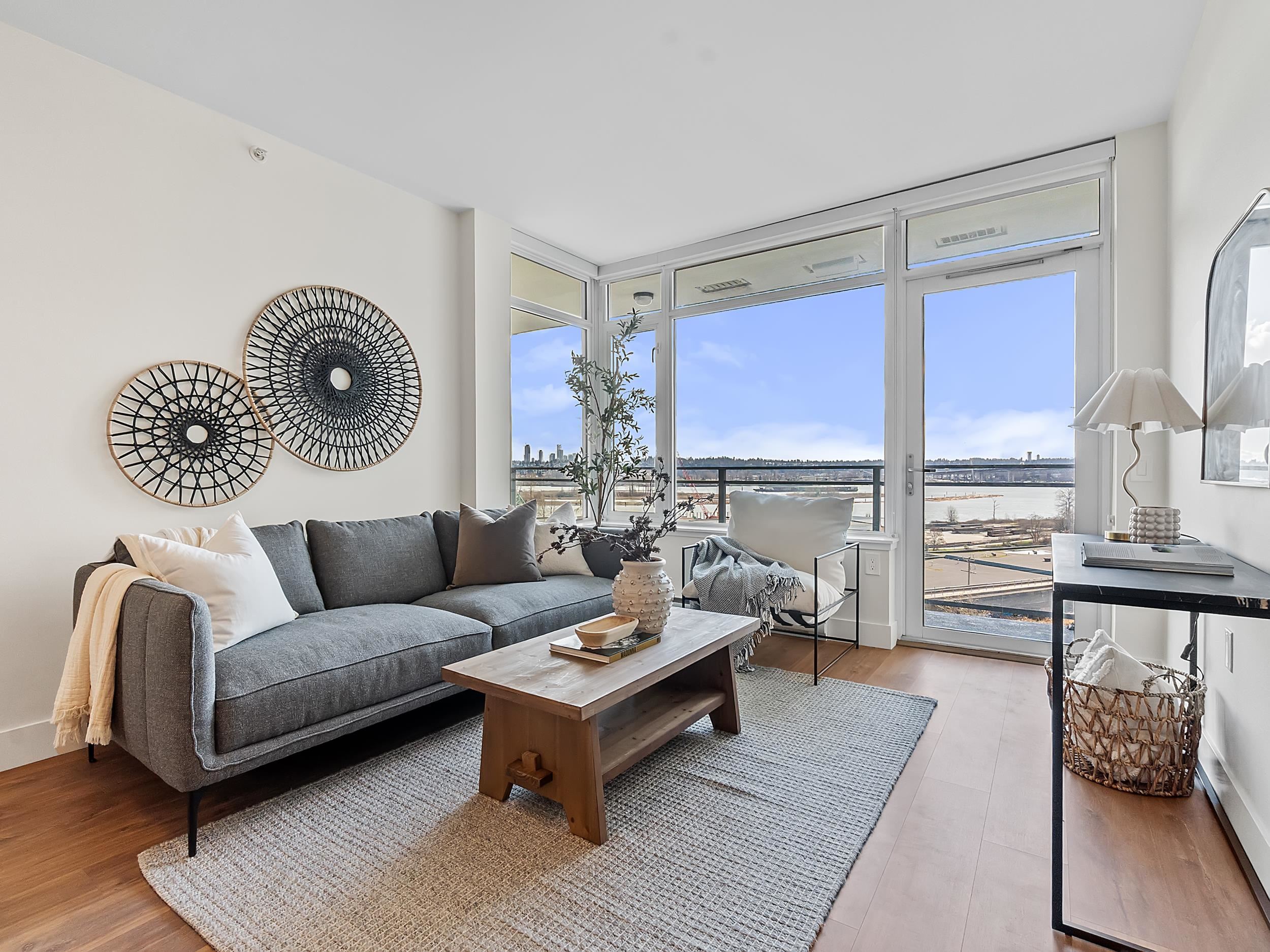 Southeast unit on the sixth floor of The Columbia, Wesgroup's concrete tower anchoring the Brewery District. The Fraser River fills your sightline the moment you walk in, framed by a southeast balcony stretching over twenty feet wide. A gas range kitchen with two-tone oak and gloss cabinetry meets quartz counters and glass subway tile, grounded by wide plank flooring underfoot. The bathroom reads boutique hotel with its soaker tub, quartz vanity, and polished chrome fixtures. A private den closes off for fo...