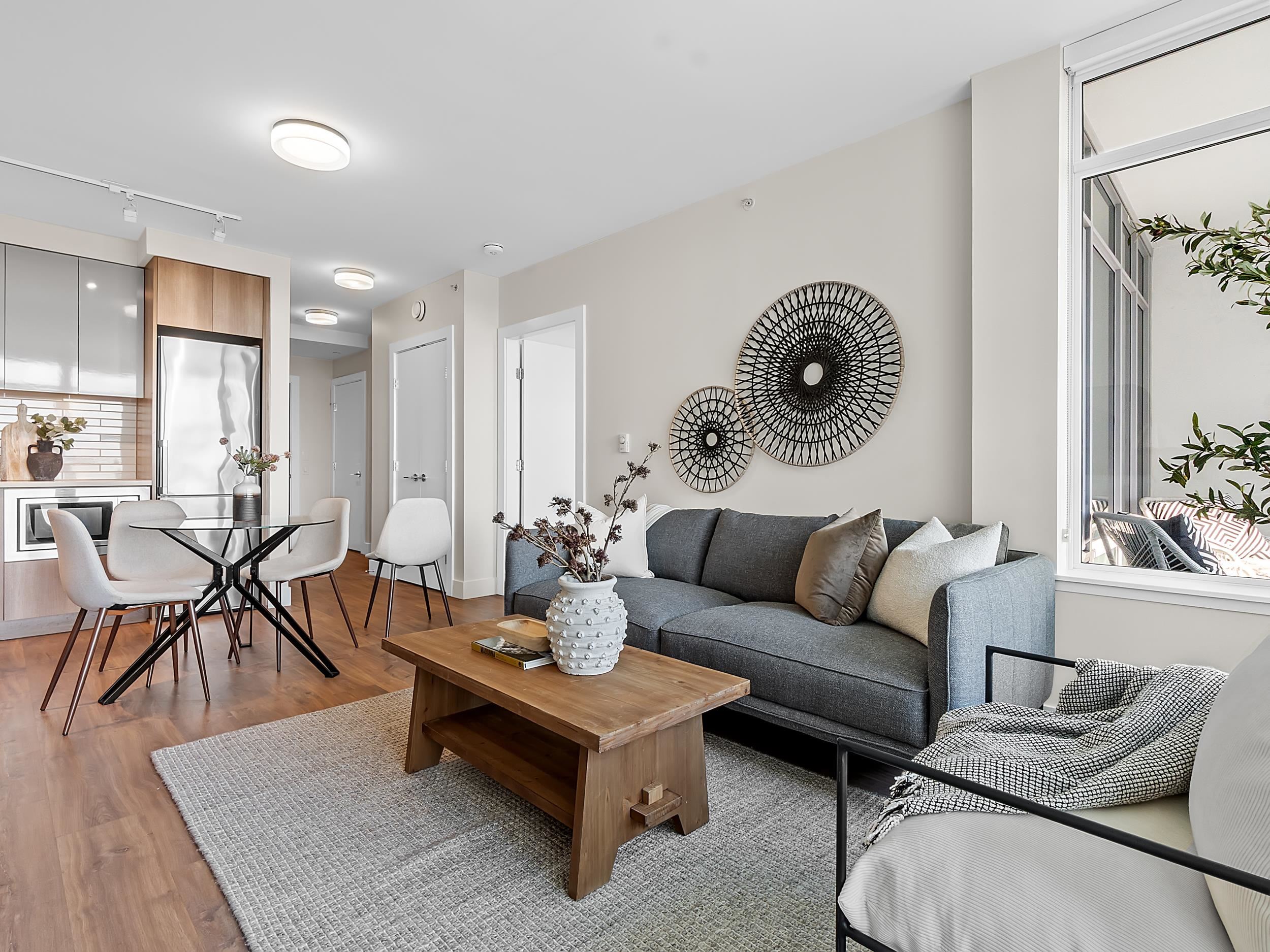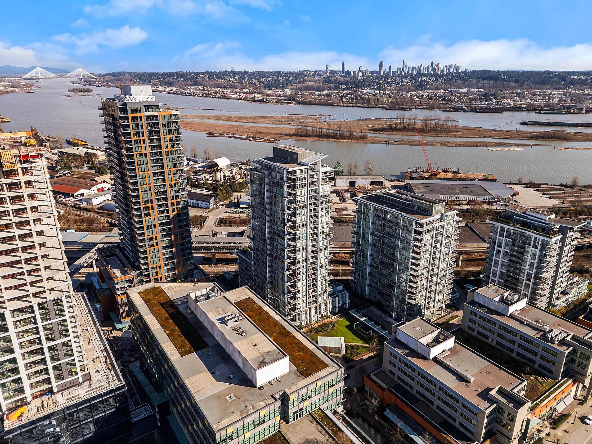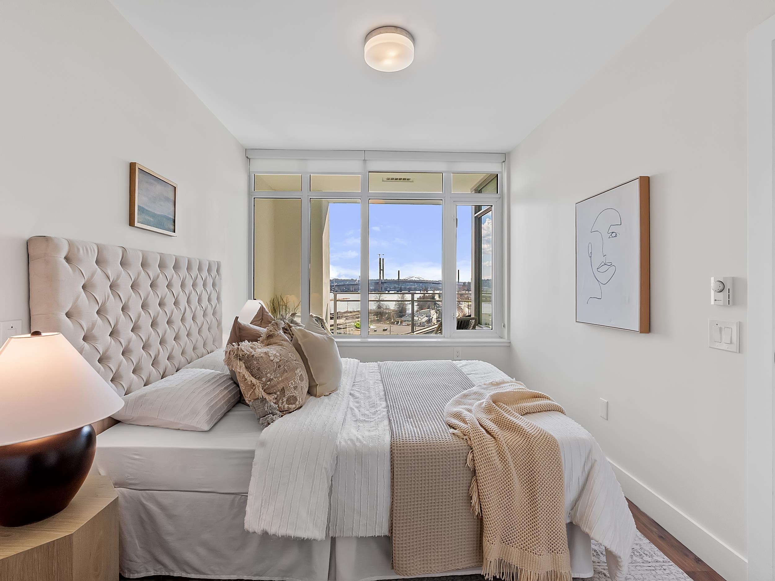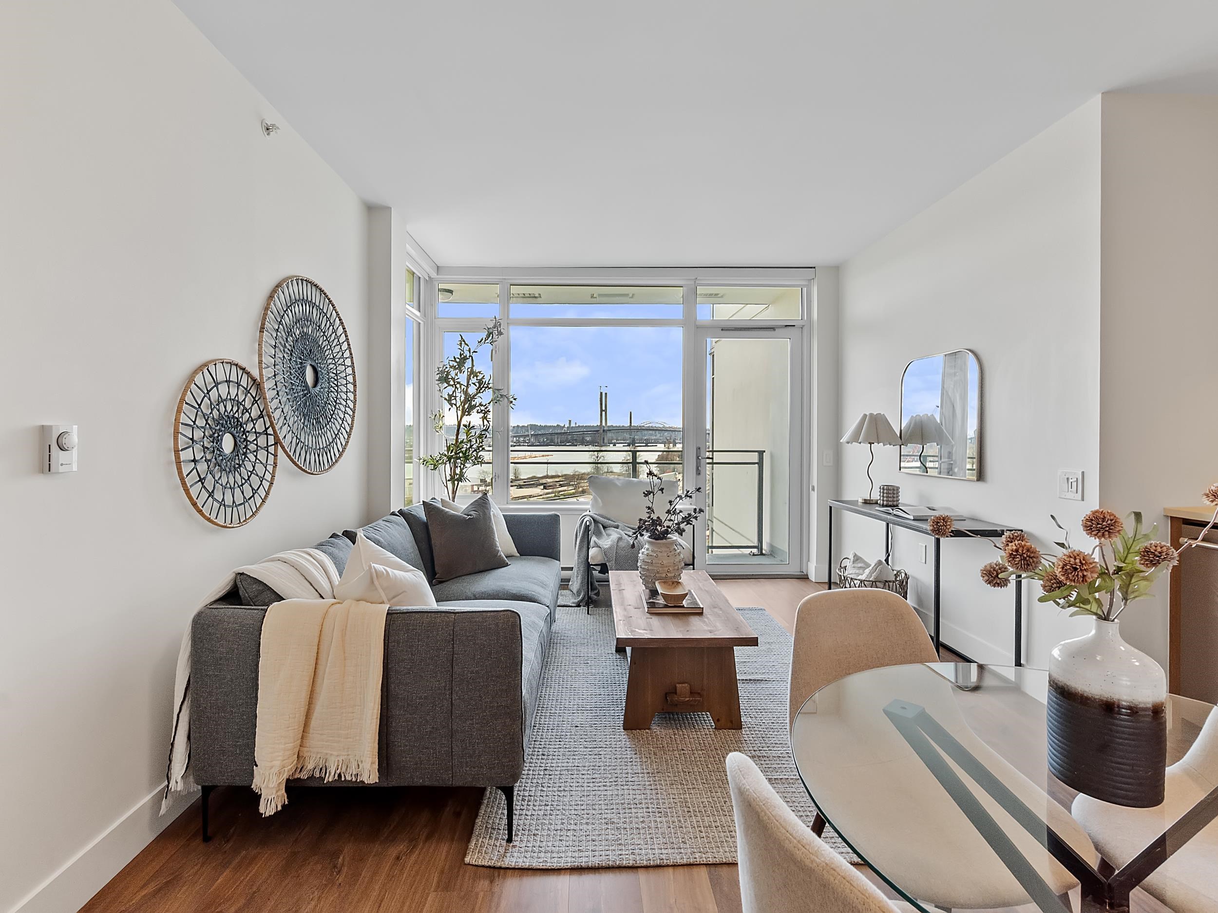 Southeast unit on the sixth floor of The Columbia, Wesgroup's concrete tower anchoring the Brewery District. The Fraser River fills your sightline the moment you walk in, framed by a southeast balcony stretching over twenty feet wide. A gas range kitchen with two-tone oak and gloss cabinetry meets quartz counters and glass subway tile, grounded by wide plank flooring underfoot. The bathroom reads boutique hotel with its soaker tub, quartz vanity, and polished chrome fixtures. A private den closes off for fo...