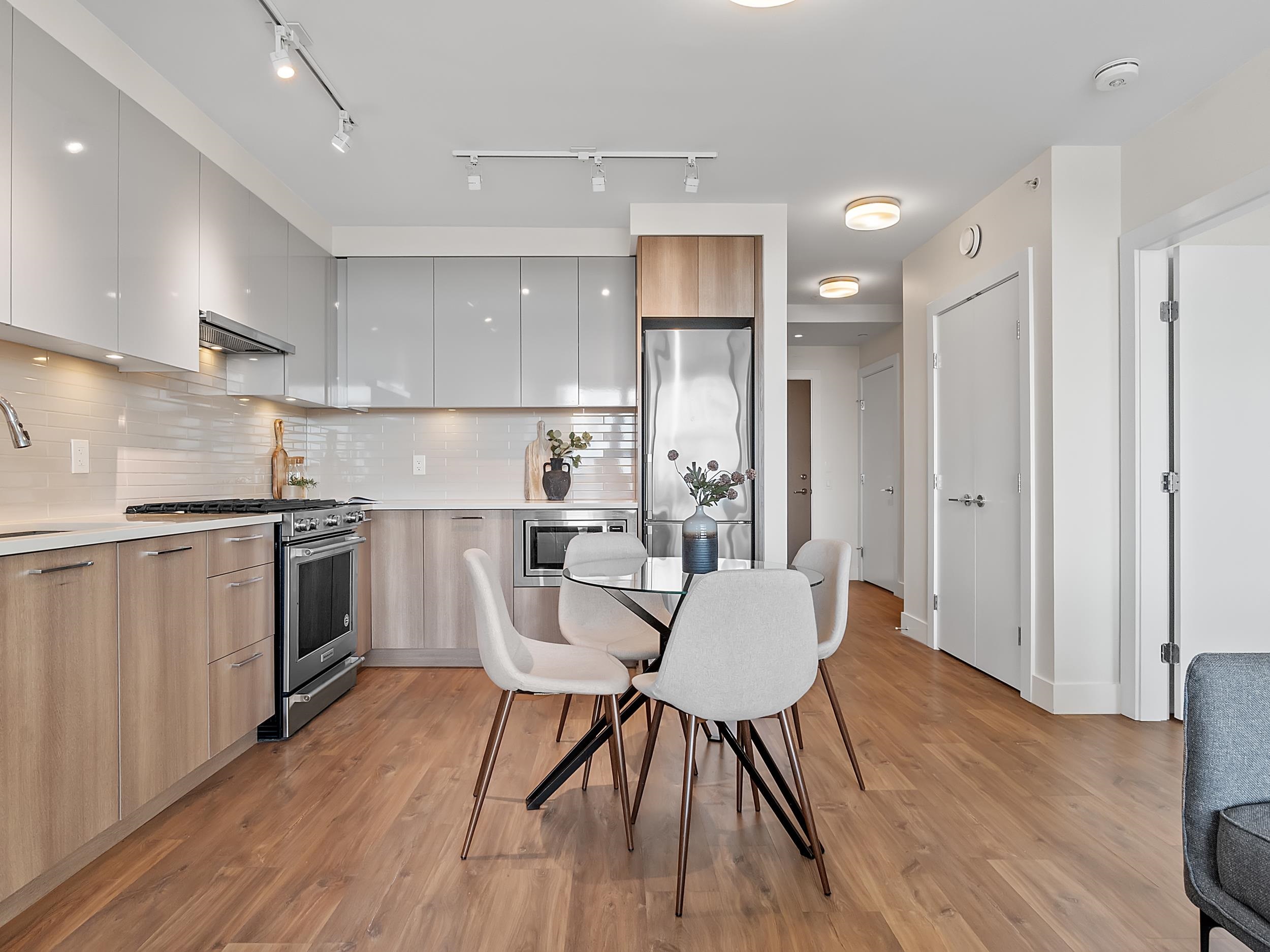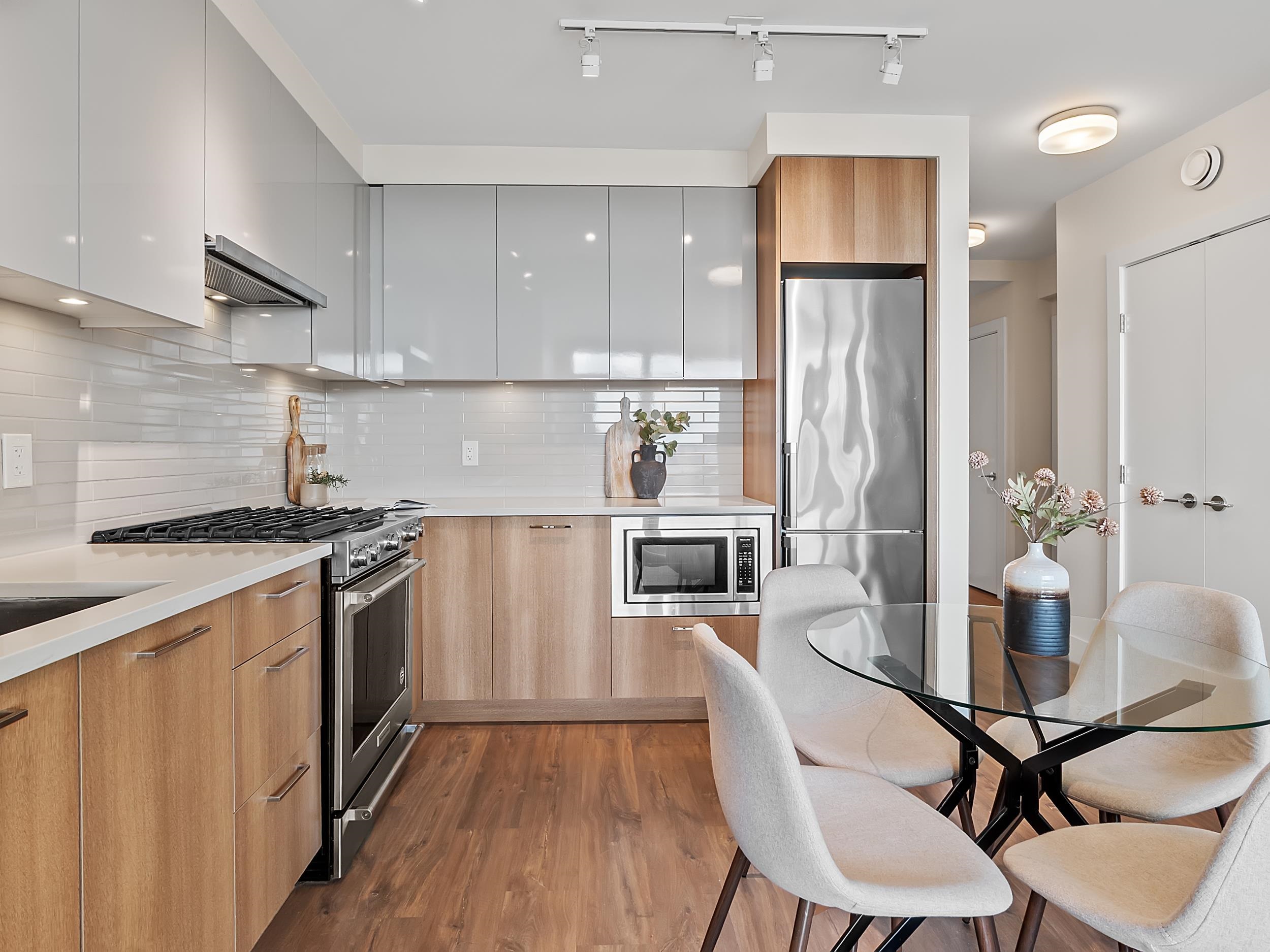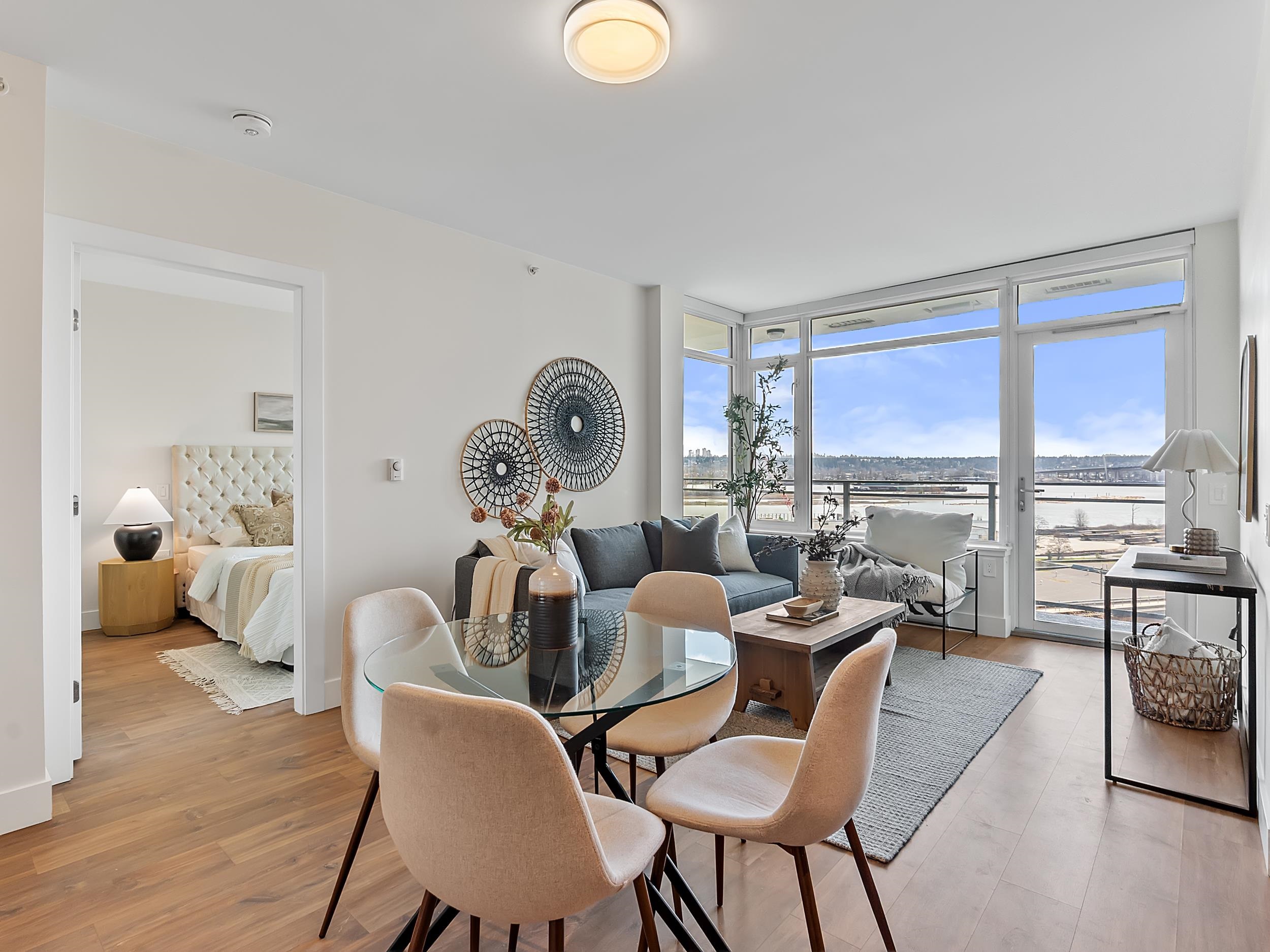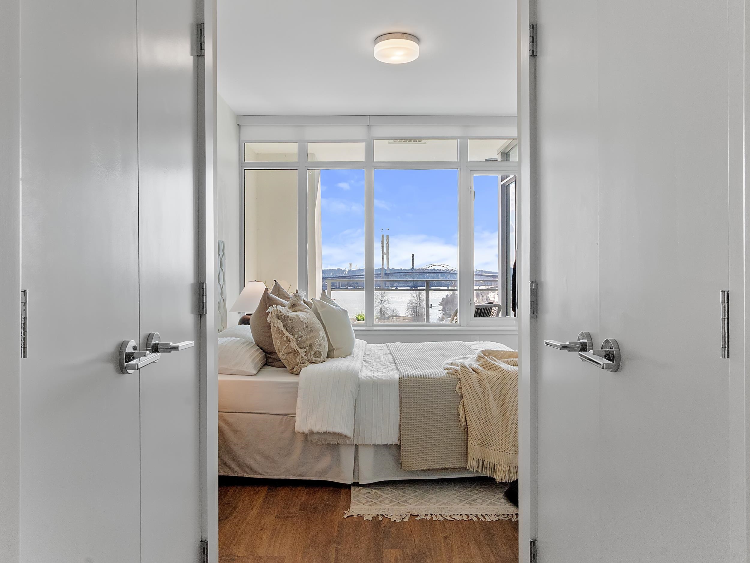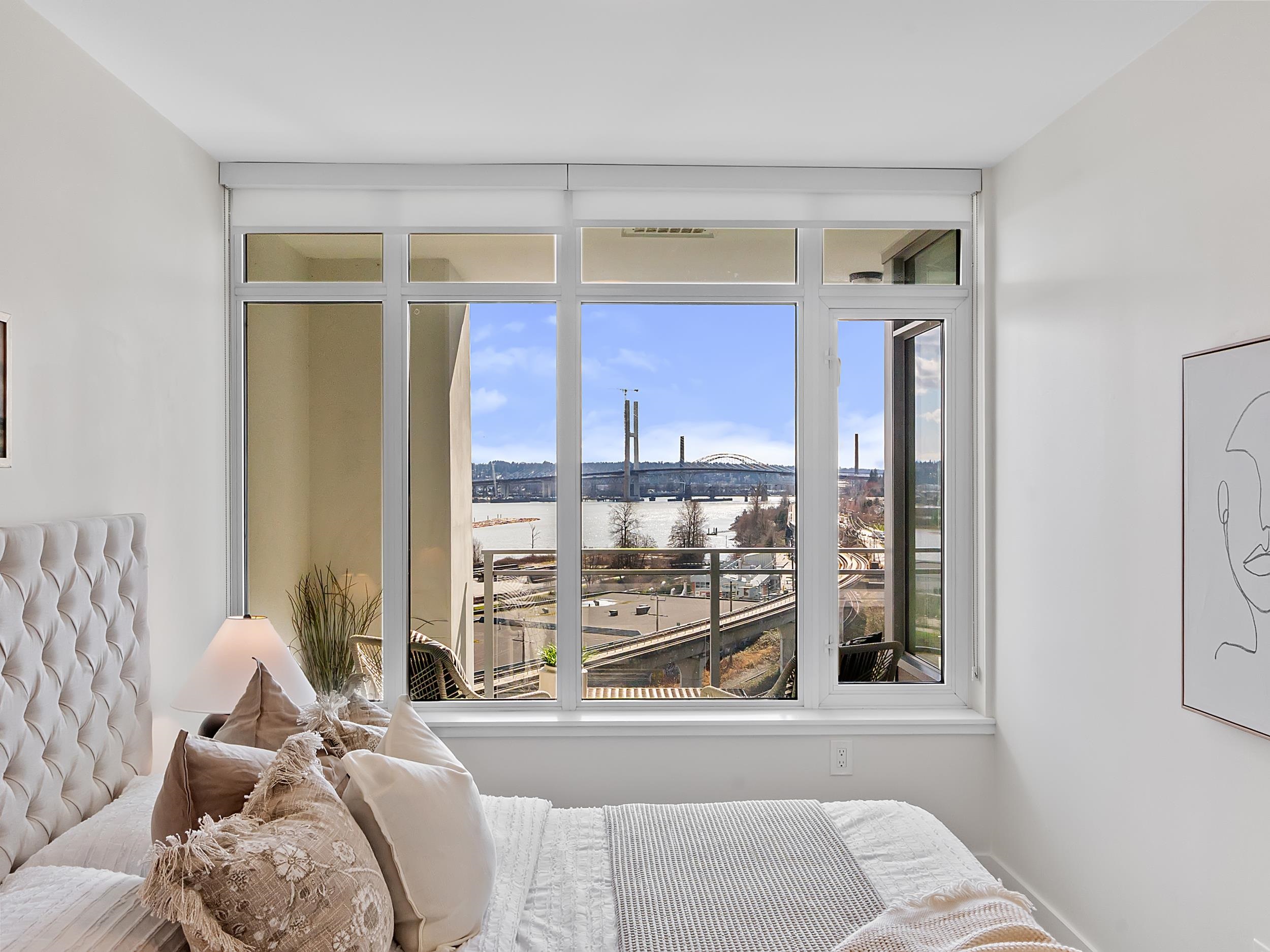 Southeast unit on the sixth floor of The Columbia, Wesgroup's concrete tower anchoring the Brewery District. The Fraser River fills your sightline the moment you walk in, framed by a southeast balcony stretching over twenty feet wide. A gas range kitchen with two-tone oak and gloss cabinetry meets quartz counters and glass subway tile, grounded by wide plank flooring underfoot. The bathroom reads boutique hotel with its soaker tub, quartz vanity, and polished chrome fixtures. A private den closes off for fo...