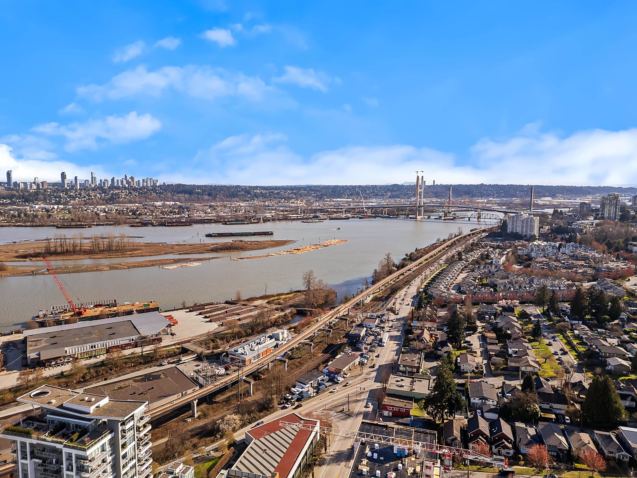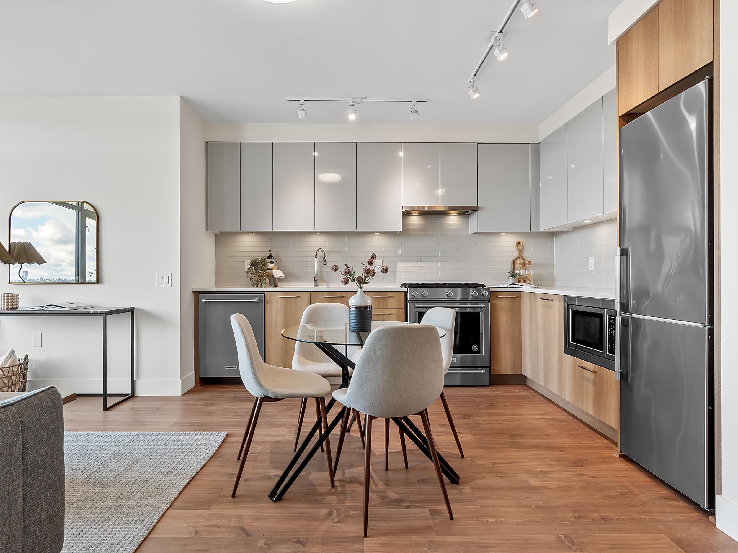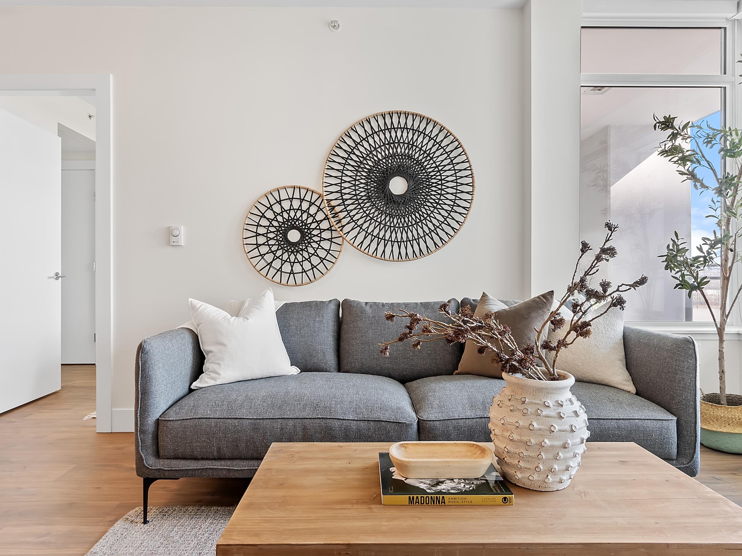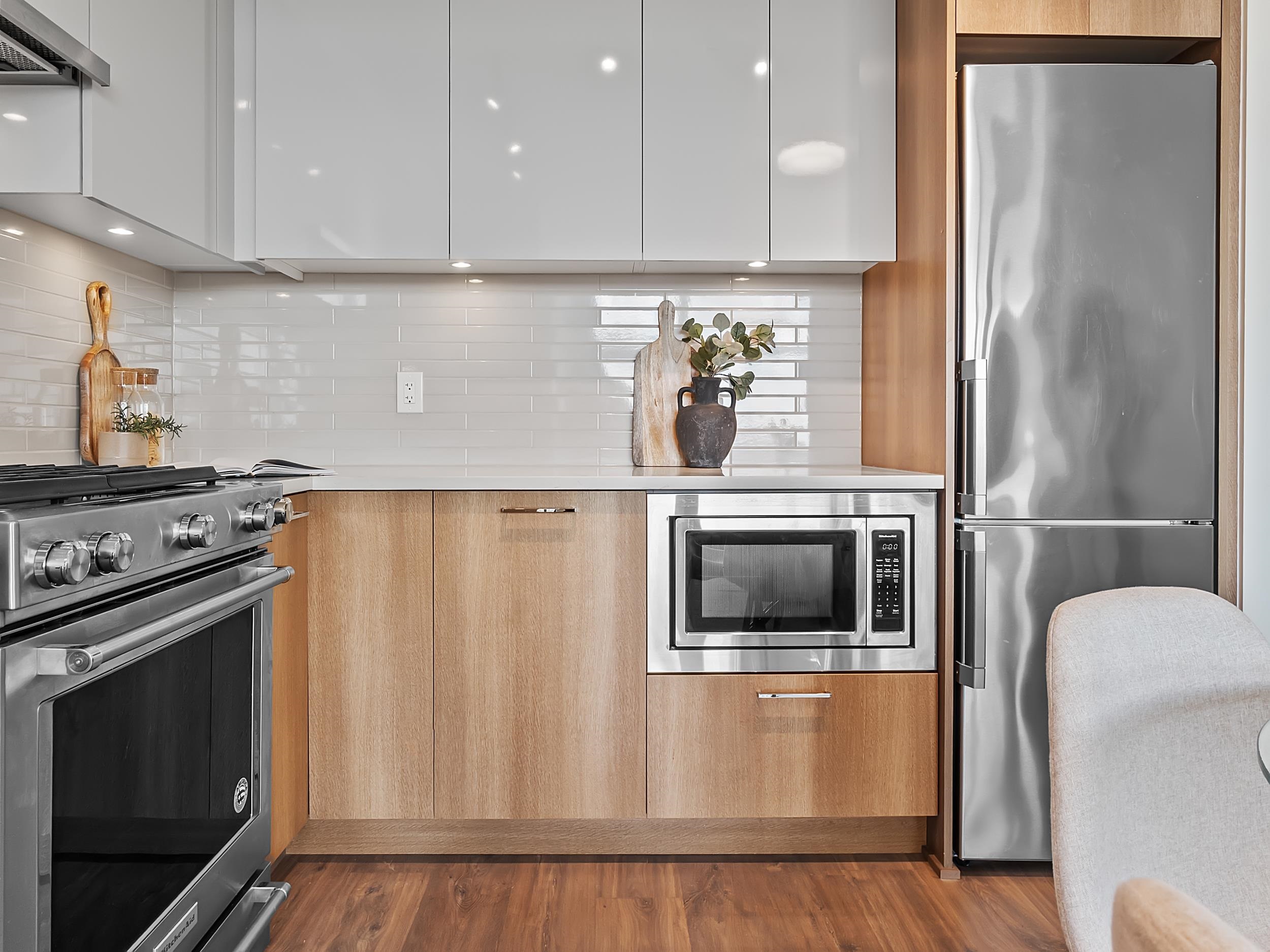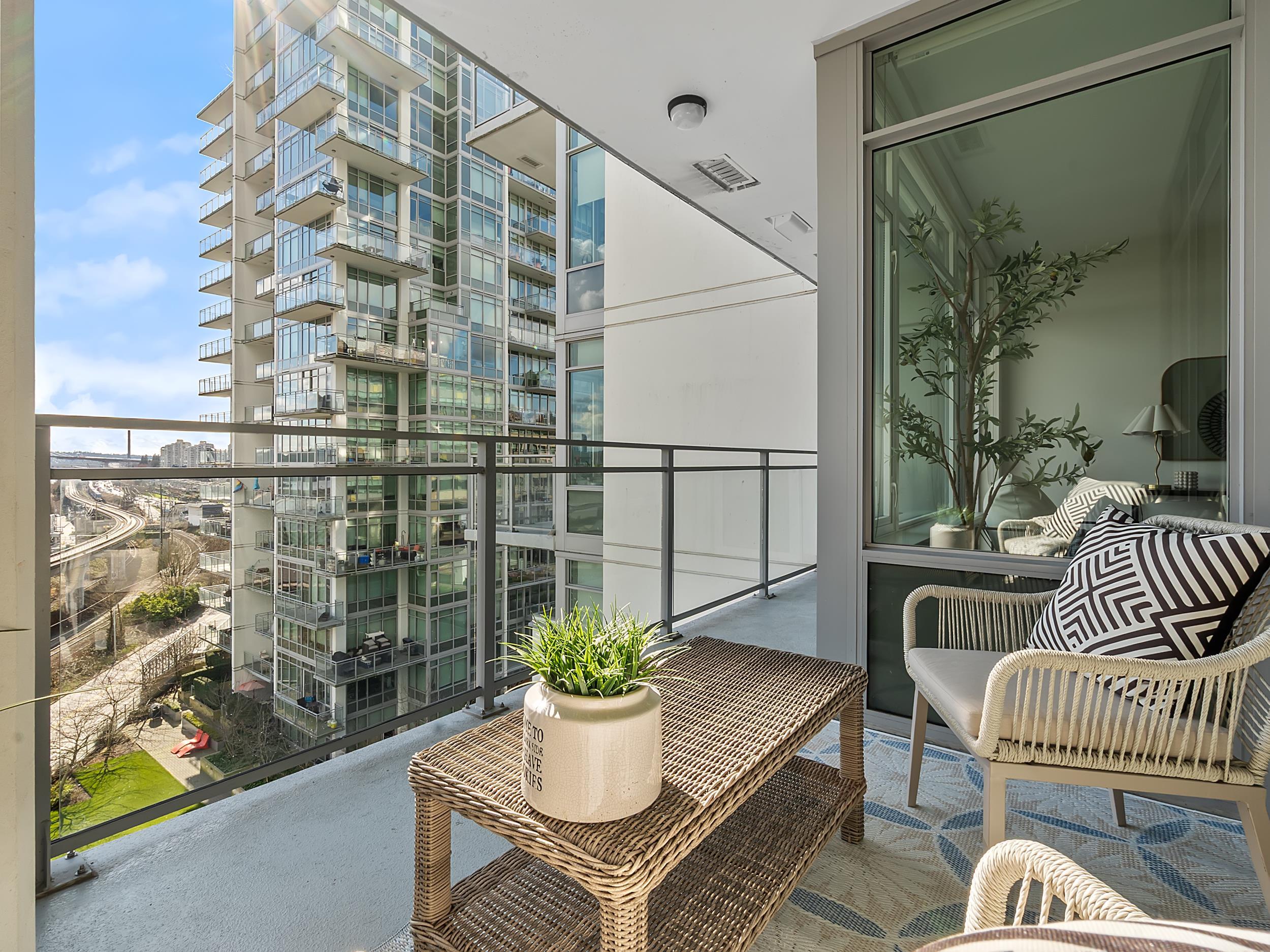 Southeast unit on the sixth floor of The Columbia, Wesgroup's concrete tower anchoring the Brewery District. The Fraser River fills your sightline the moment you walk in, framed by a southeast balcony stretching over twenty feet wide. A gas range kitchen with two-tone oak and gloss cabinetry meets quartz counters and glass subway tile, grounded by wide plank flooring underfoot. The bathroom reads boutique hotel with its soaker tub, quartz vanity, and polished chrome fixtures. A private den closes off for fo...