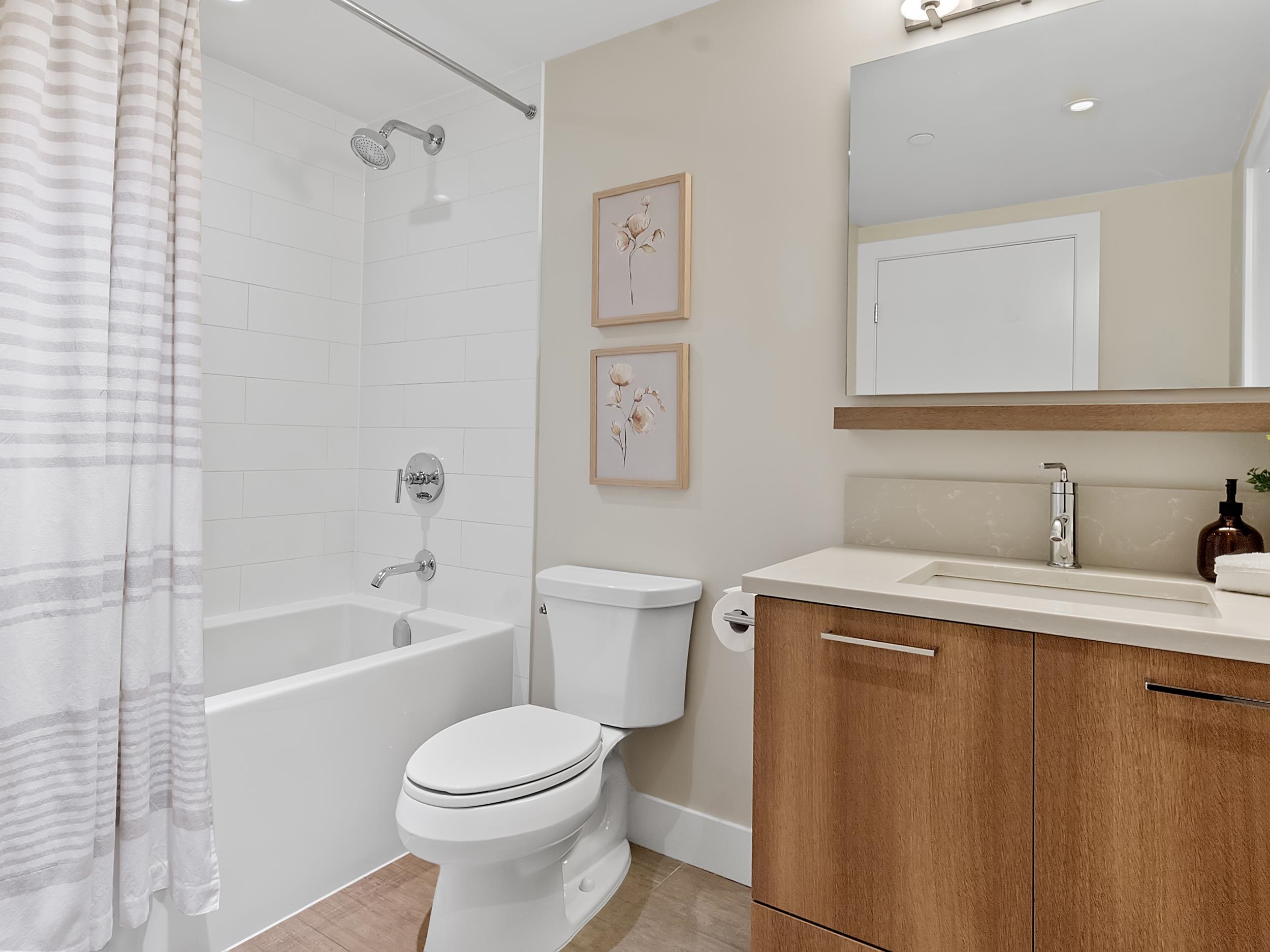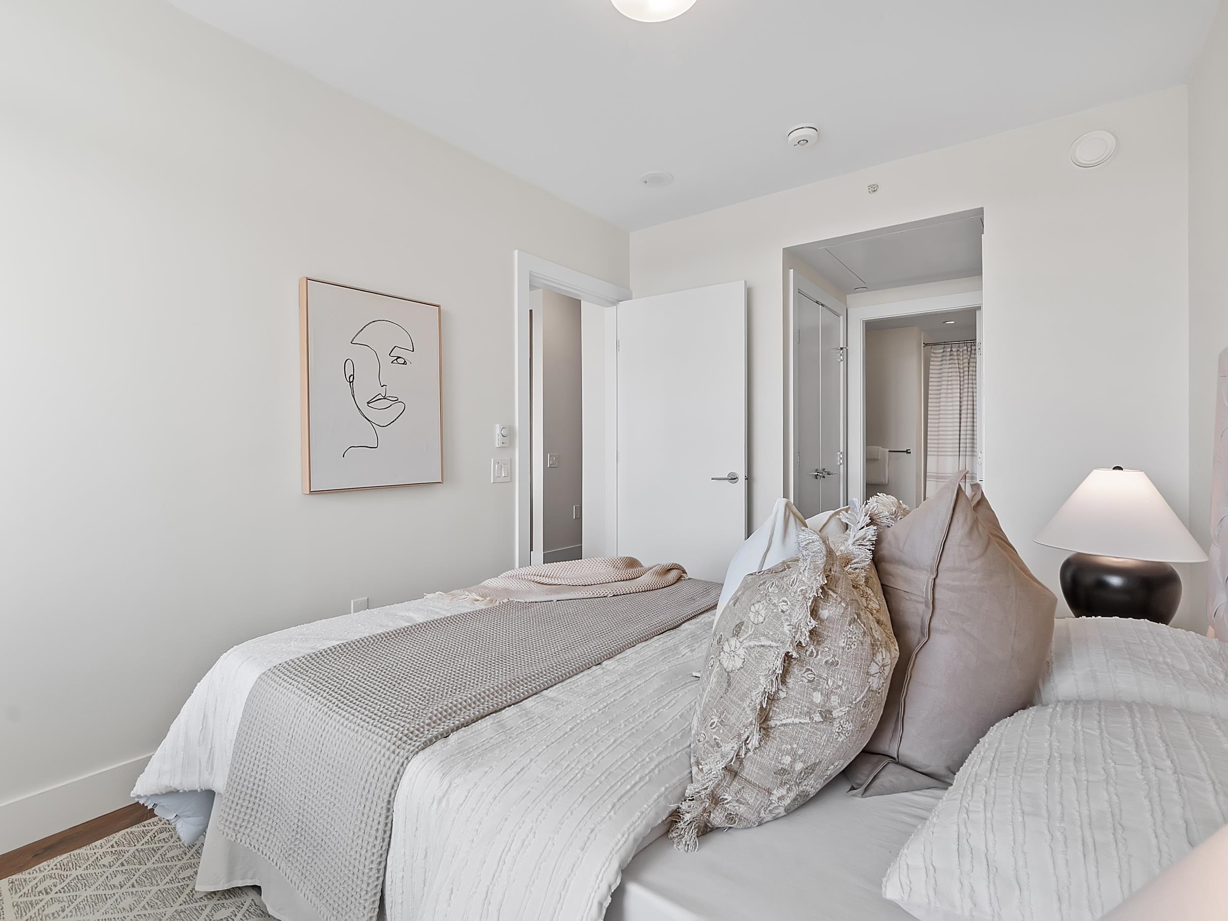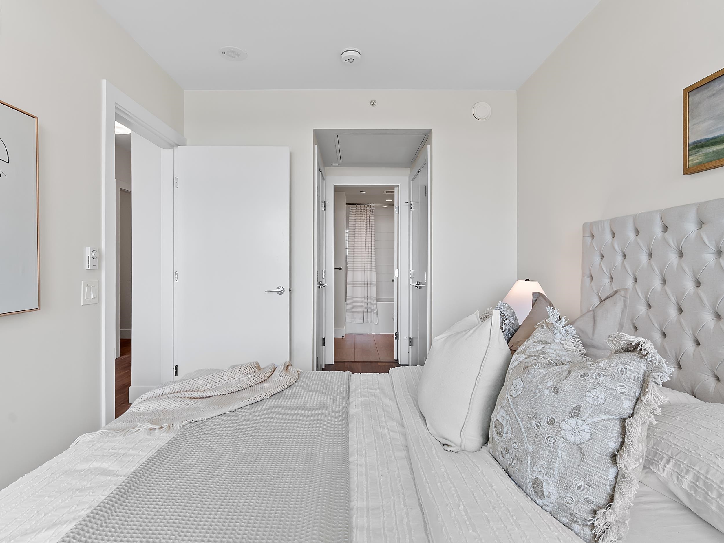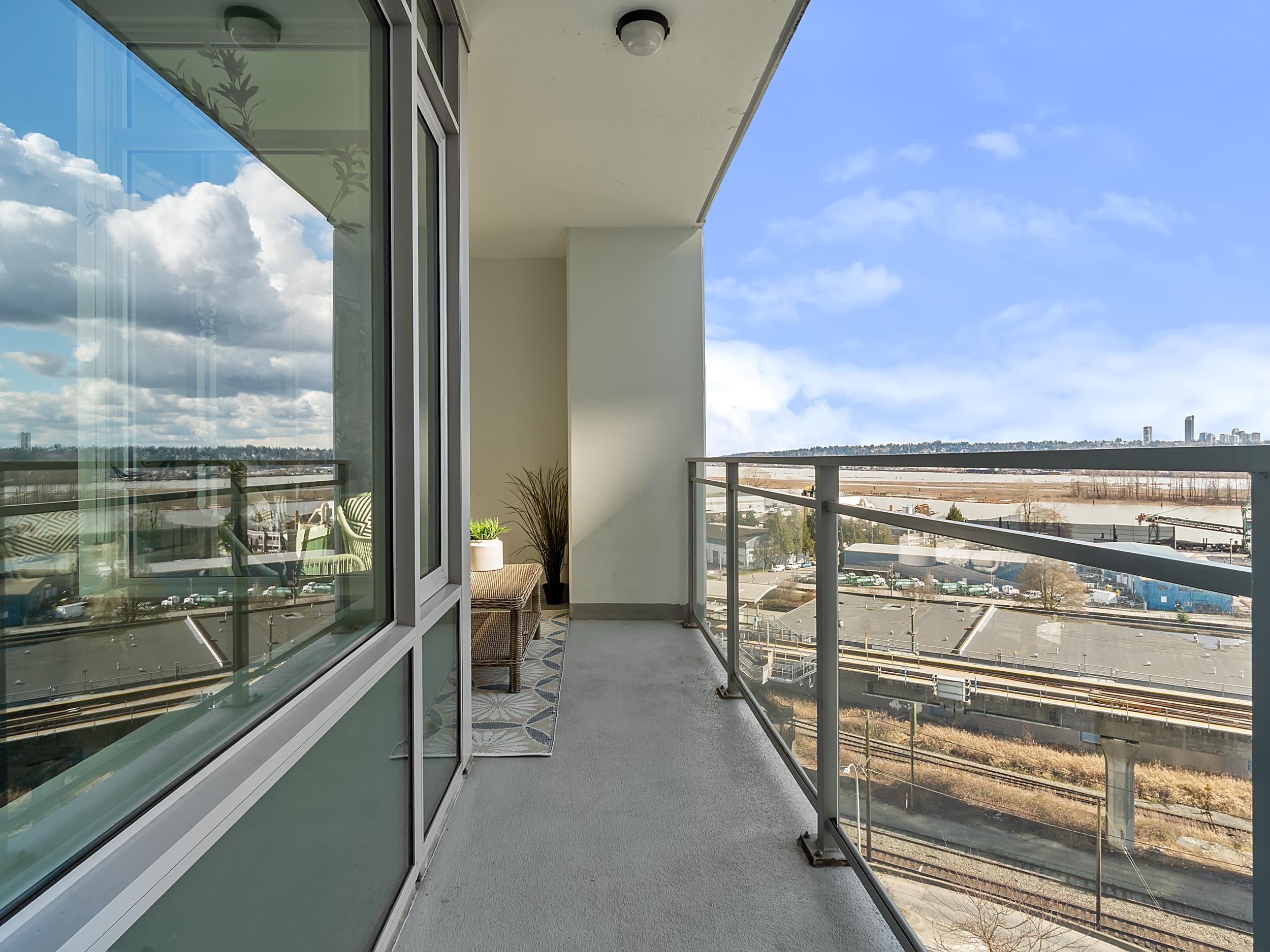 Southeast unit on the sixth floor of The Columbia, Wesgroup's concrete tower anchoring the Brewery District. The Fraser River fills your sightline the moment you walk in, framed by a southeast balcony stretching over twenty feet wide. A gas range kitchen with two-tone oak and gloss cabinetry meets quartz counters and glass subway tile, grounded by wide plank flooring underfoot. The bathroom reads boutique hotel with its soaker tub, quartz vanity, and polished chrome fixtures. A private den closes off for fo...