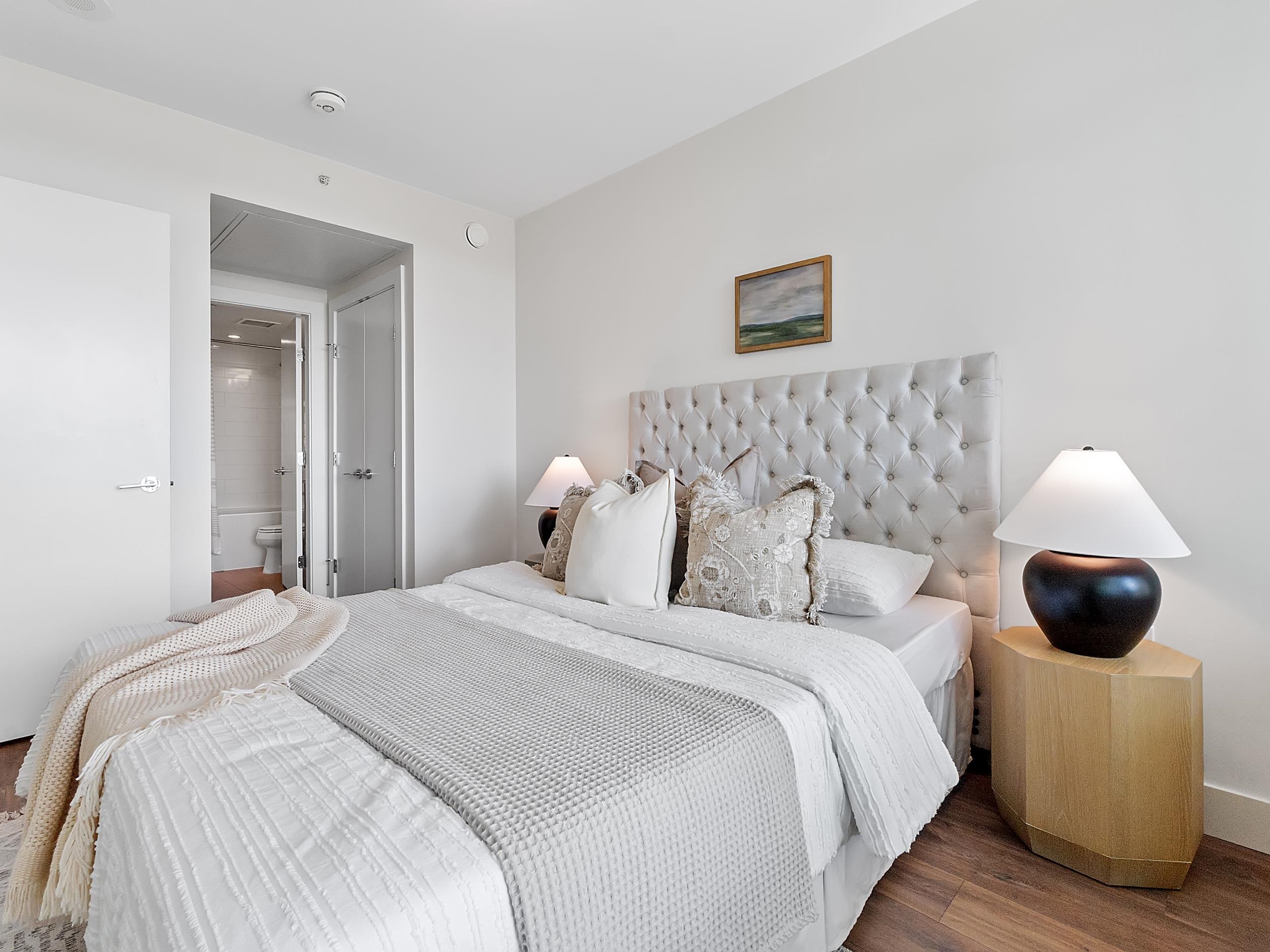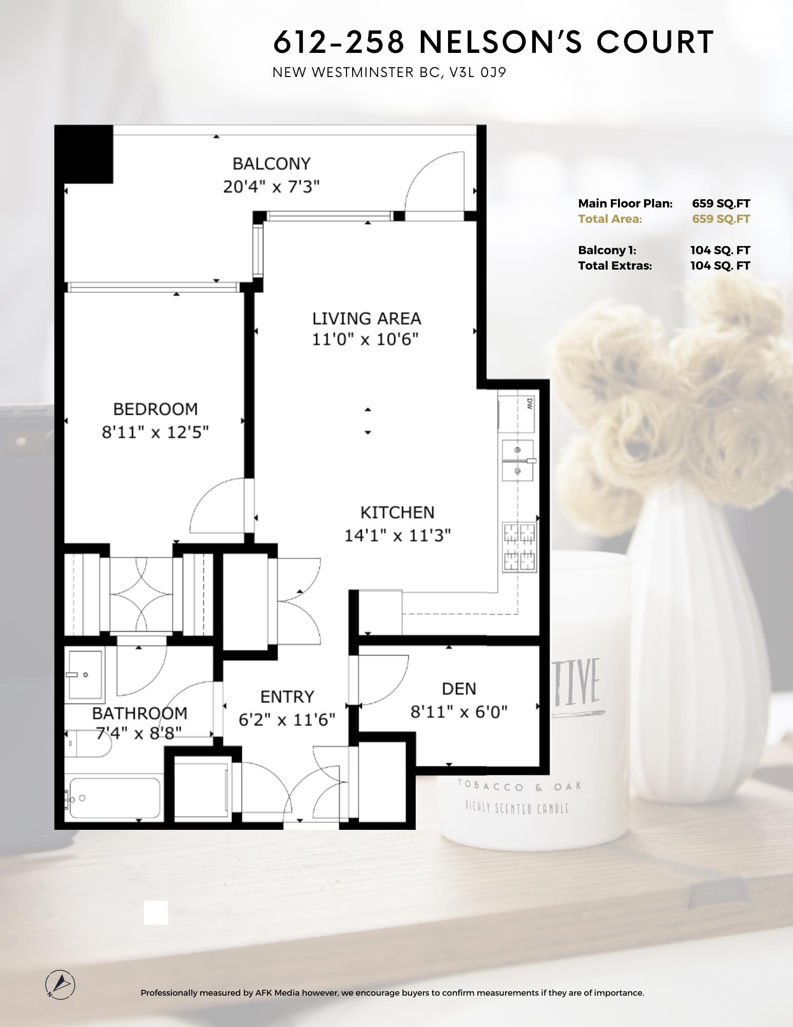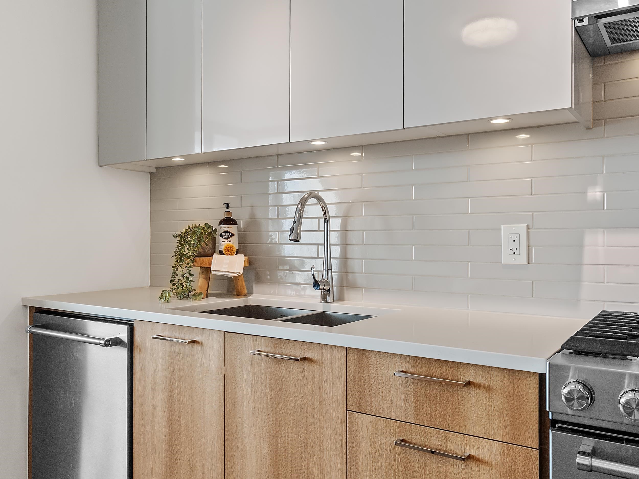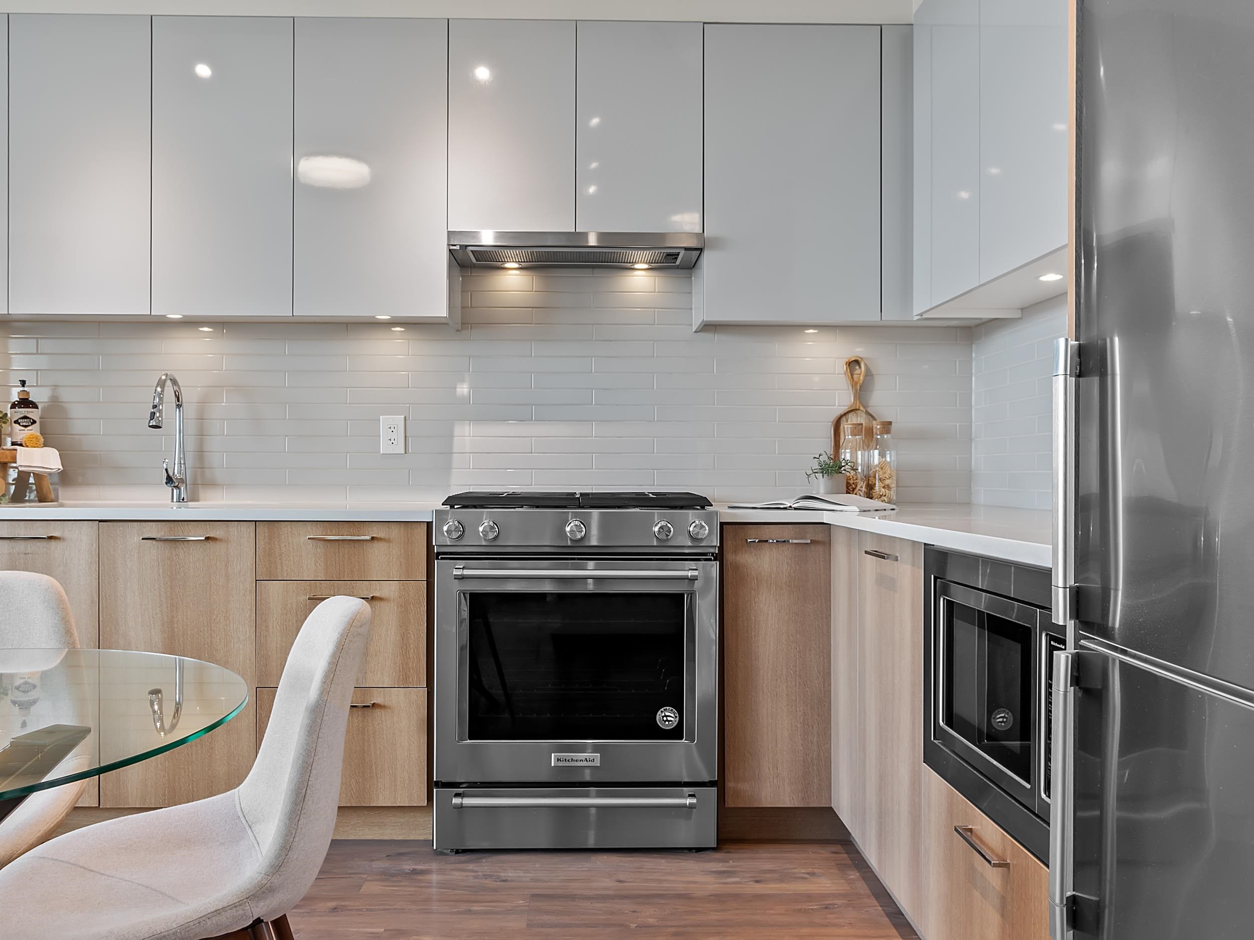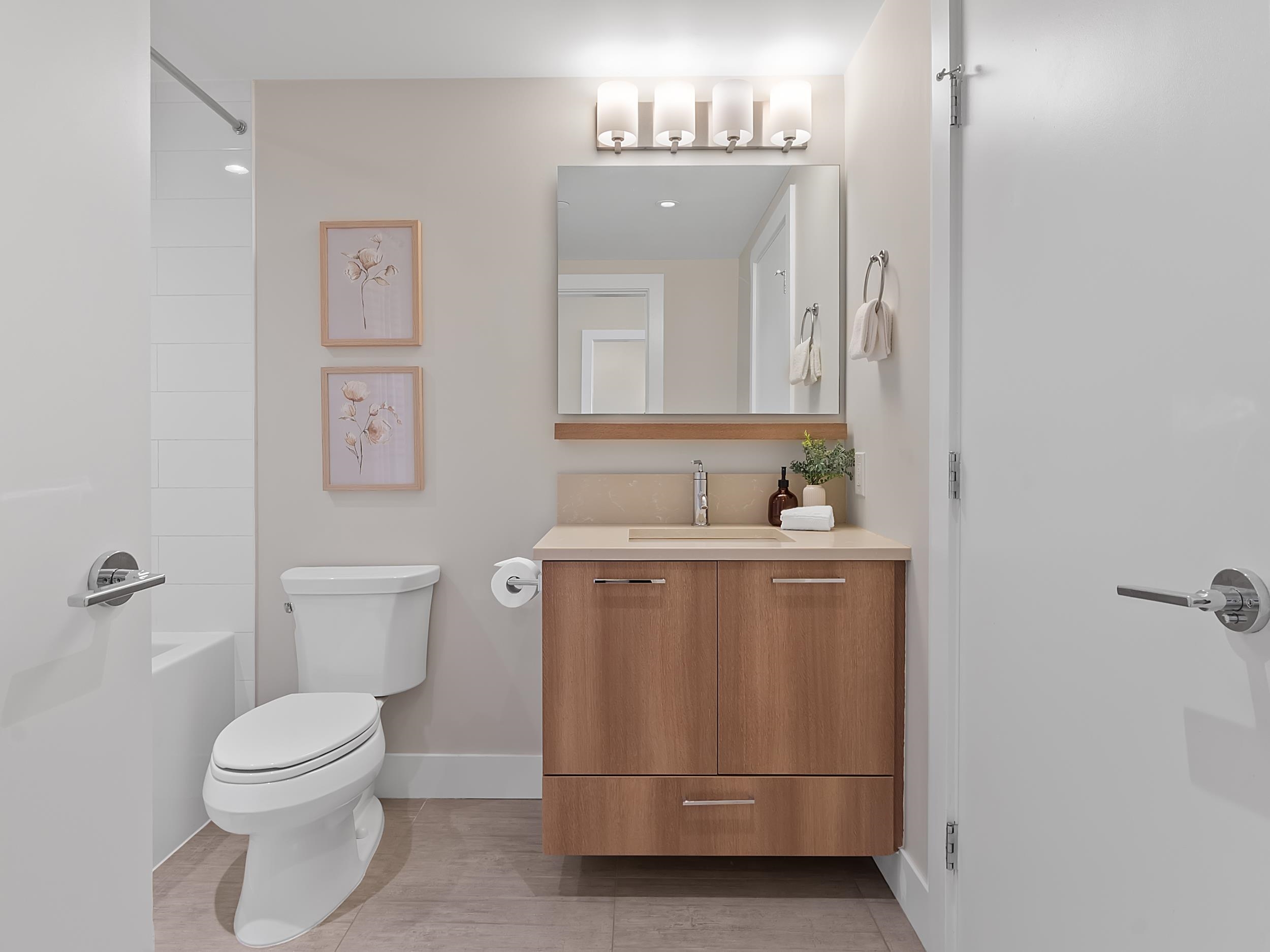 Southeast unit on the sixth floor of The Columbia, Wesgroup's concrete tower anchoring the Brewery District. The Fraser River fills your sightline the moment you walk in, framed by a southeast balcony stretching over twenty feet wide. A gas range kitchen with two-tone oak and gloss cabinetry meets quartz counters and glass subway tile, grounded by wide plank flooring underfoot. The bathroom reads boutique hotel with its soaker tub, quartz vanity, and polished chrome fixtures. A private den closes off for fo...