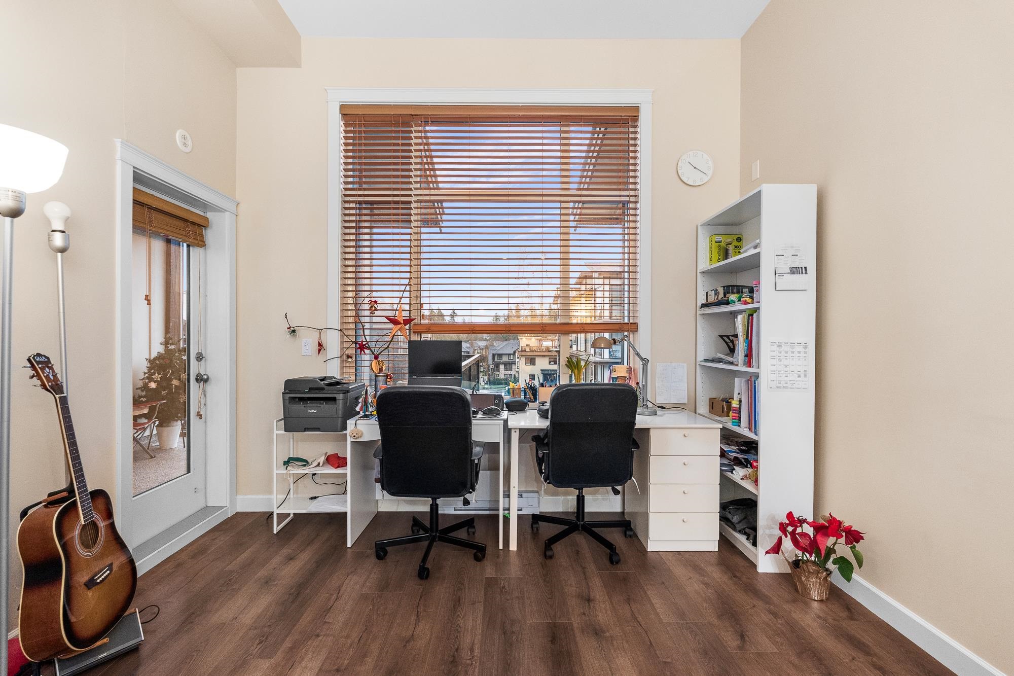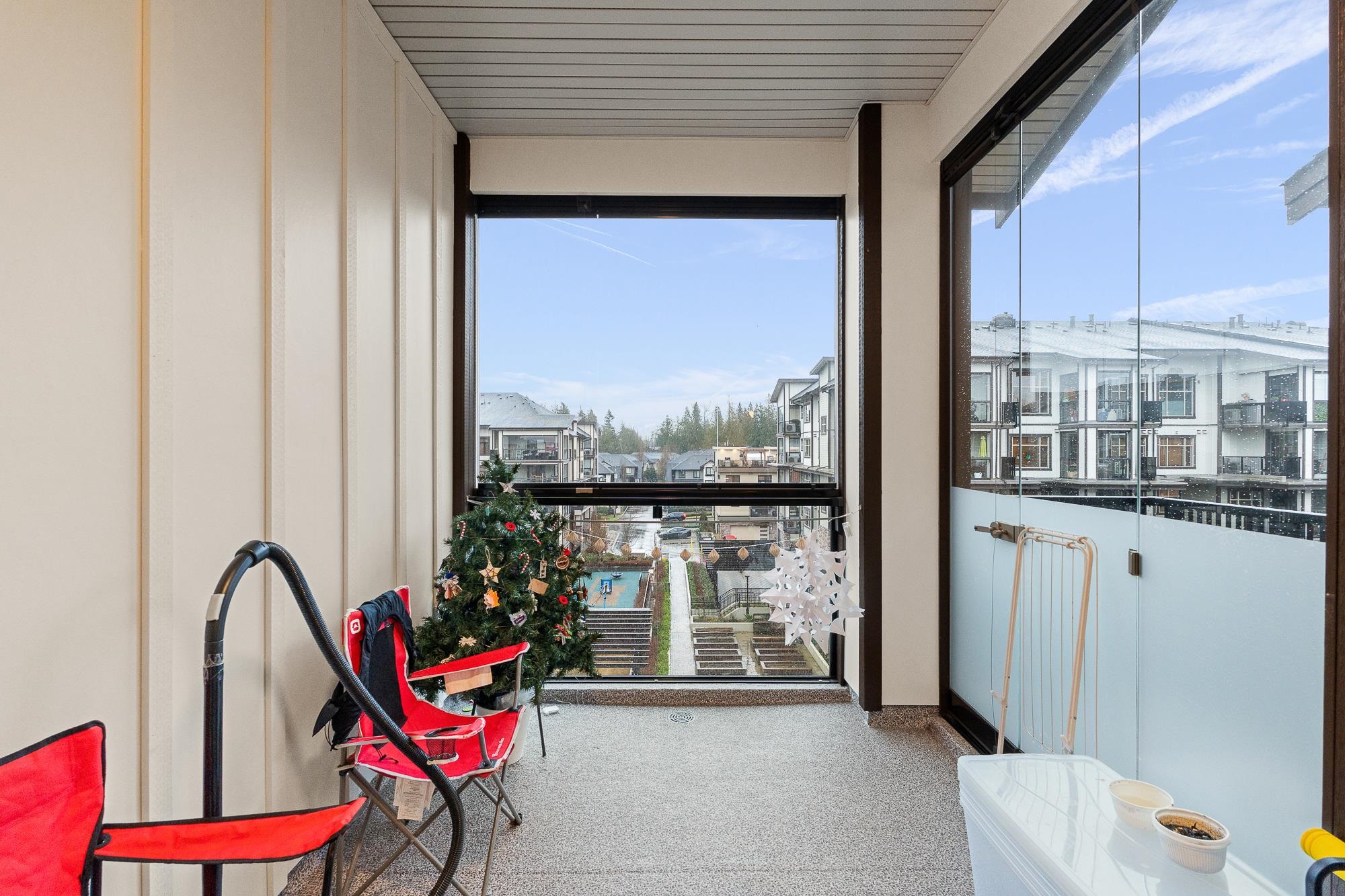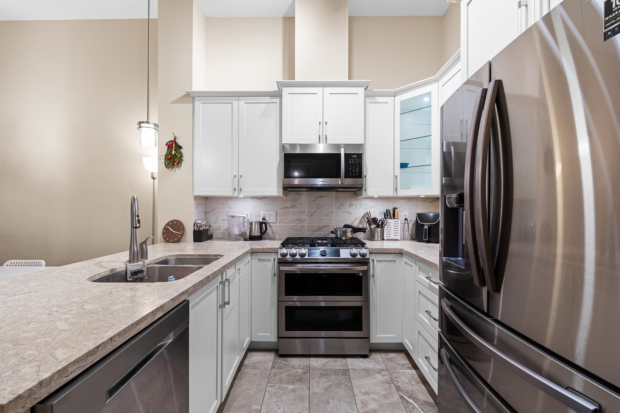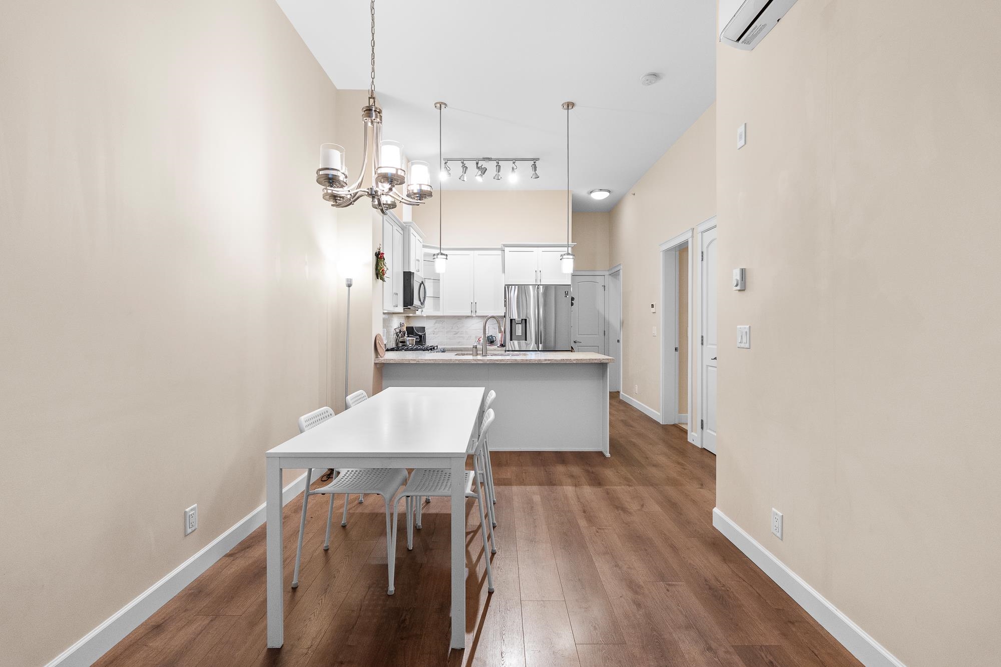 Beautiful Yorkson Park Central home featuring 2 bedrooms + den, 1 bathroom, and an east-facing, unobstructed top-floor view. This unit offers high ceilings, an open-concept living space, and a versatile enclosed solarium/balcony ideal for year-round use and BBQs. The kitchen is equipped with stainless steel appliances, gas stove, and premium finishes. Enjoy air-conditioning in all rooms with a high-efficiency heat pump, plus new carpet throughout. Low strata fees include hot water and gas. Comes with 2 par...