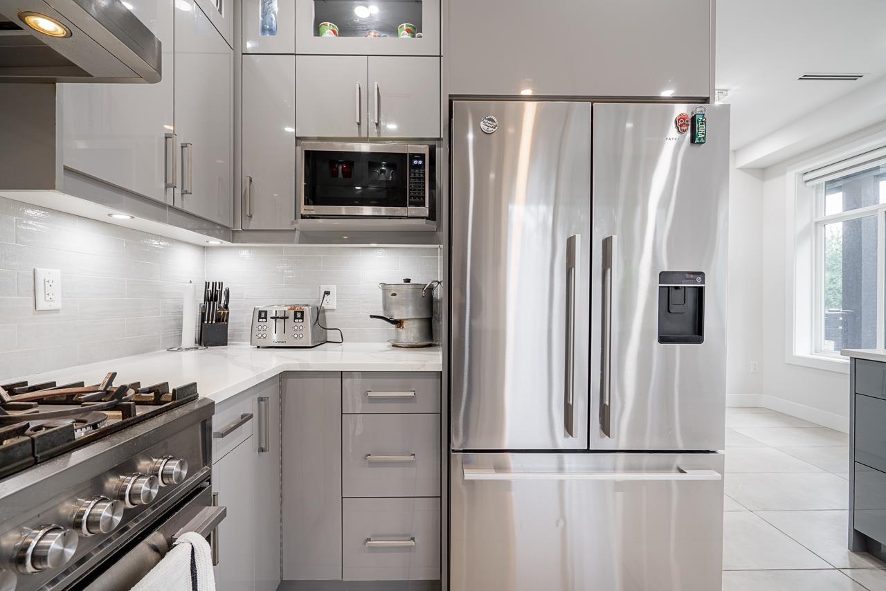 Perched high on a prominent corner lot, this 3-level side-by-side duplex features 1,940sf of well-designed living. Just 3 yrs new with the balance of 2-5-10 warranty, the home boasts a well-equipped kitchen with a premium stainless Fisher & Paykel appliance package. The open-concept main floor is bright with natural light and views of beautiful tree-lined streets. Upstairs offers 3 bdrms while the lower level provides a separate, spacious 2-bdrm suite for income or family. Radiant heat and A/C on all levels...