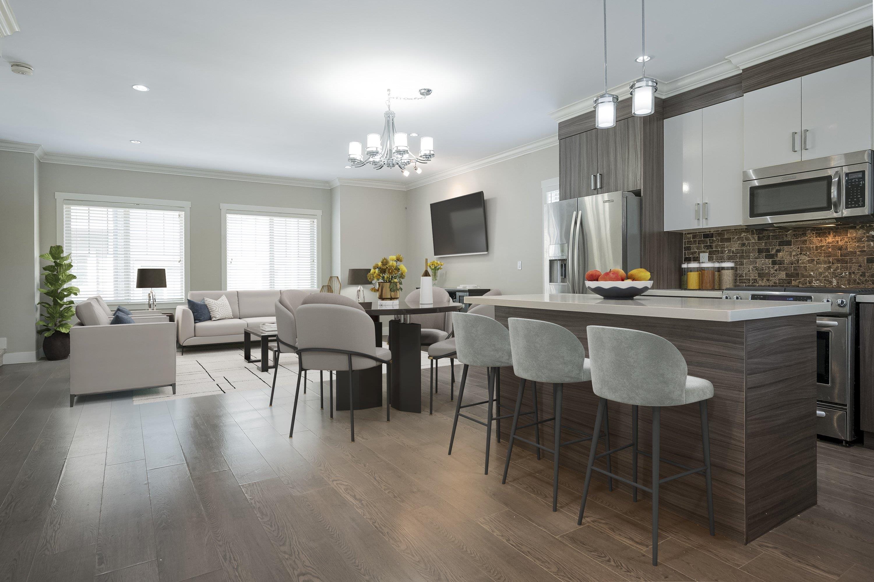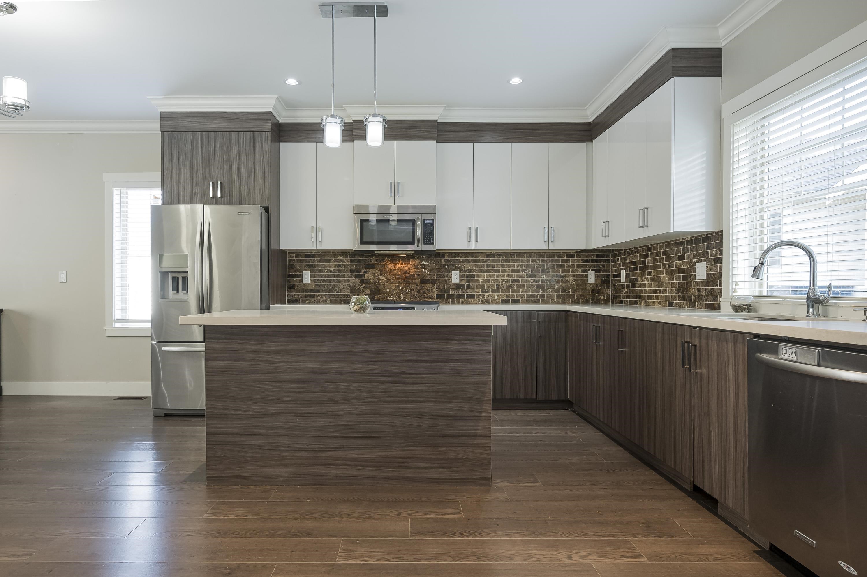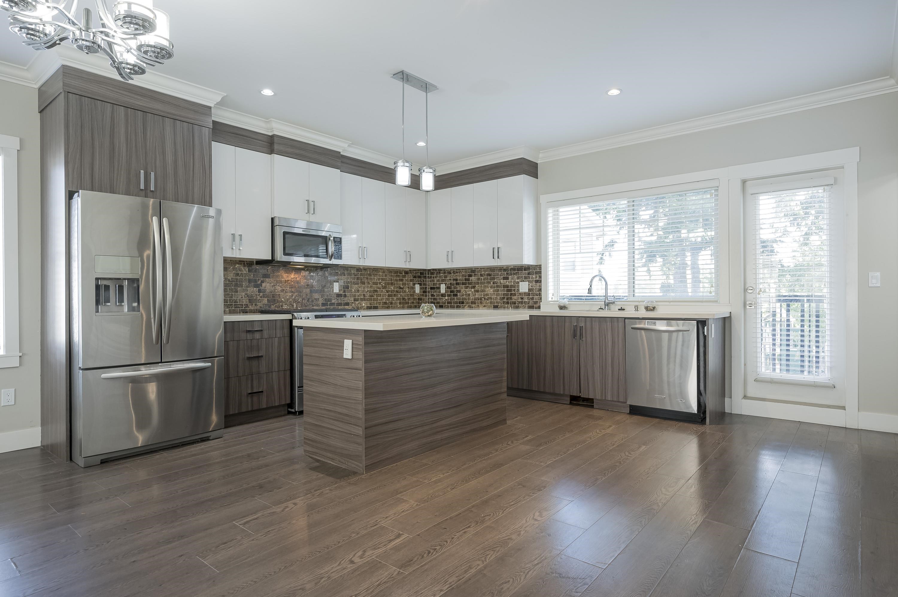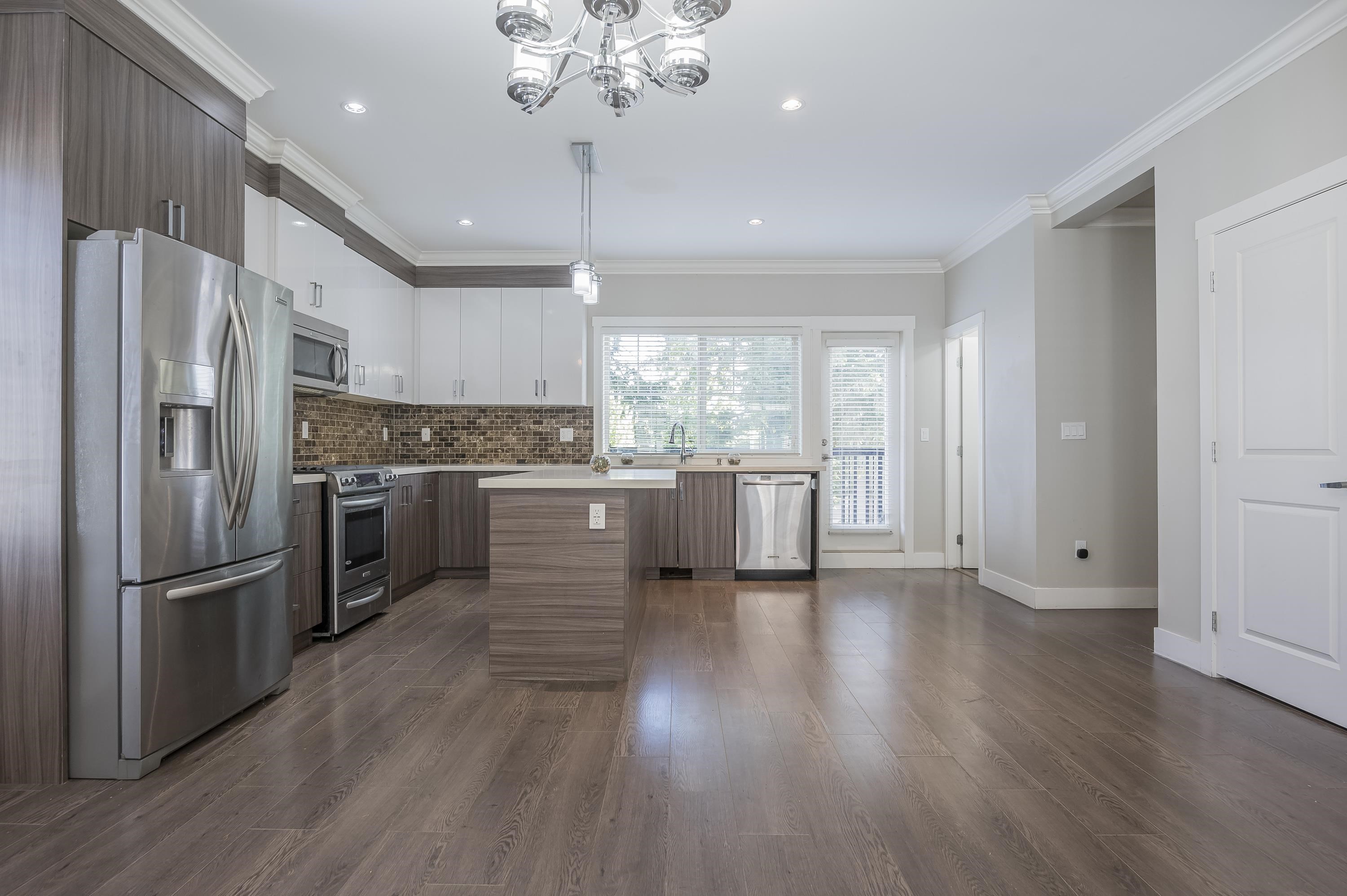 Fantastic townhouse just a short distance from the new sky train station. Does not back onto Fraser highway but does back onto a small park. Good location in "The heights". Open, great room concept on the main floor with a gourmet kitchen, Gas stove, Quartz counters and an island. Crown moulding throughout. Powder room on main floor. Upper features 2 full baths & 3 spacious bedrooms. Extra large (20x28) Side by side Double garage with 11' ceilings and backyard access. Lots of visitor parking very close ...
