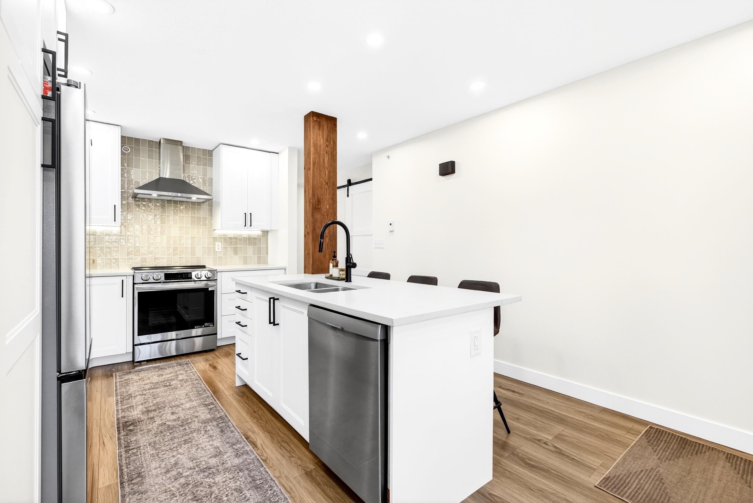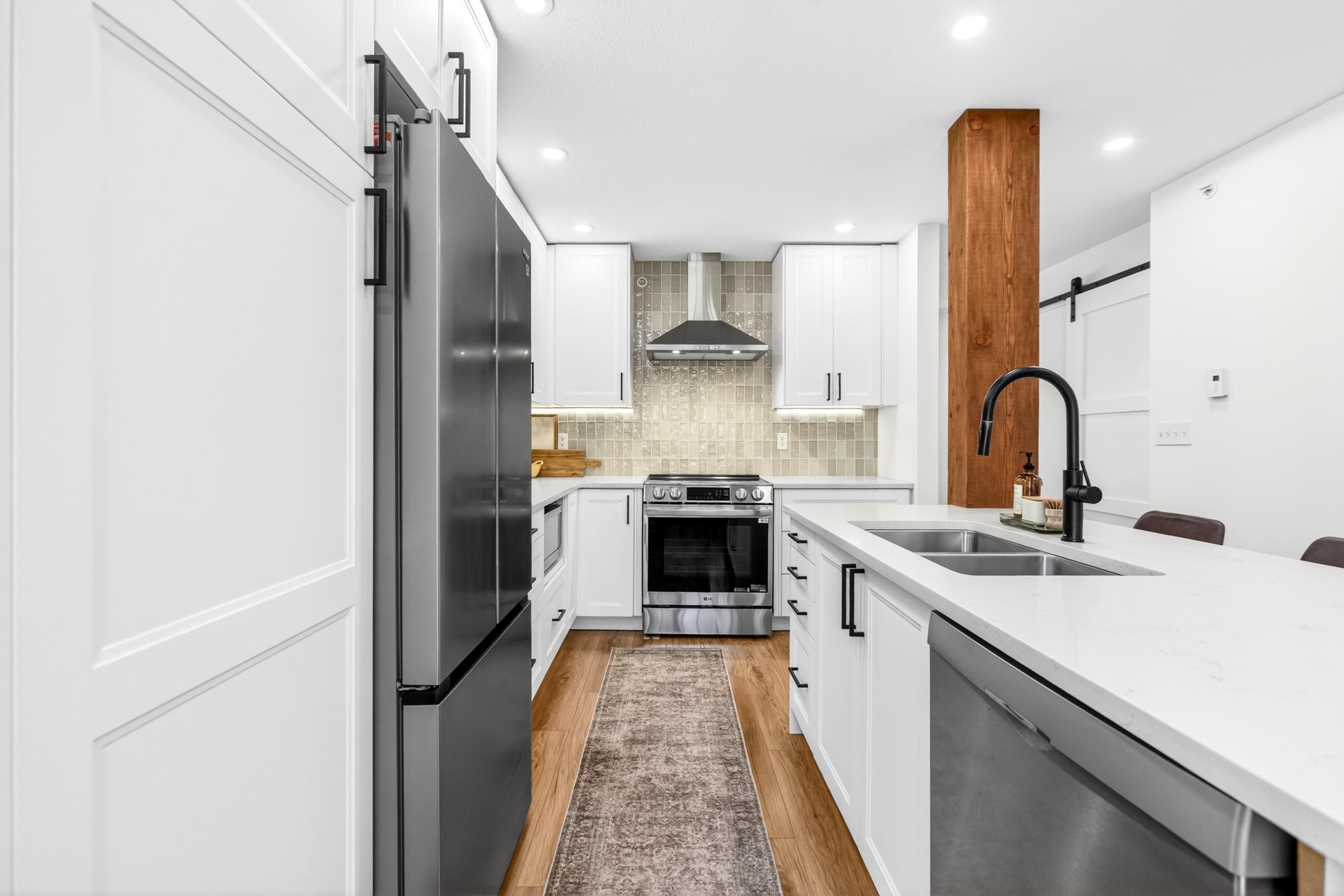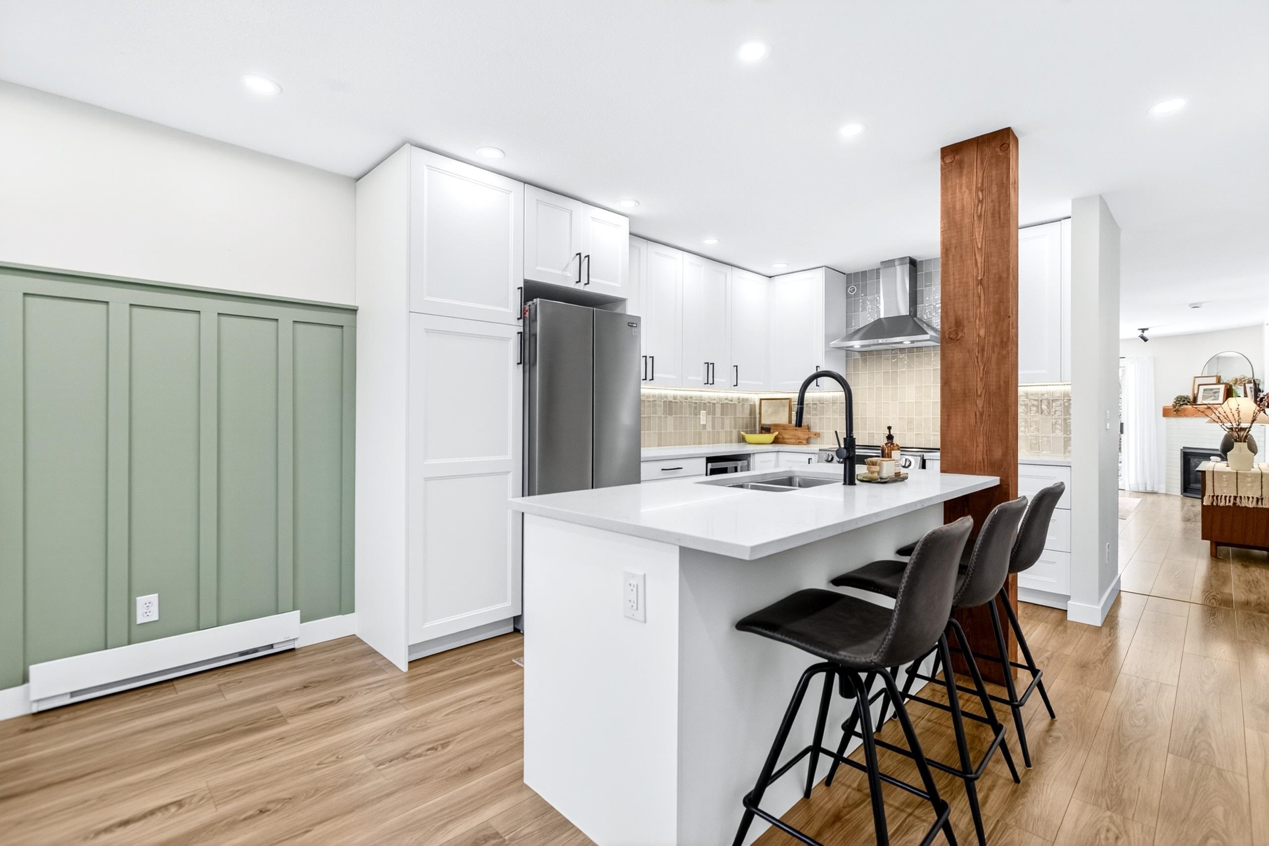 Renovated 2 bdrm, 2 bthrm centrally located at the popular Mcmyn Estates. Large gourmet kit offers updated cabinets w/ undermount lighting, quartz counters/breakfast bar, tiled bcksplsh, recessed lights, wainscotting & stainless steel appl. Adjacent dining/living rm w/ new gas fireplace w/ tile surround & custom mantle. Sliding doors leading to a private east facing bckyrd/garden w/ cement patio perfect for entertaining. Spacious bdrms, both w/ ensuite bthrms, incl primary w/ WIC. Stylish barn doors, lam fl...