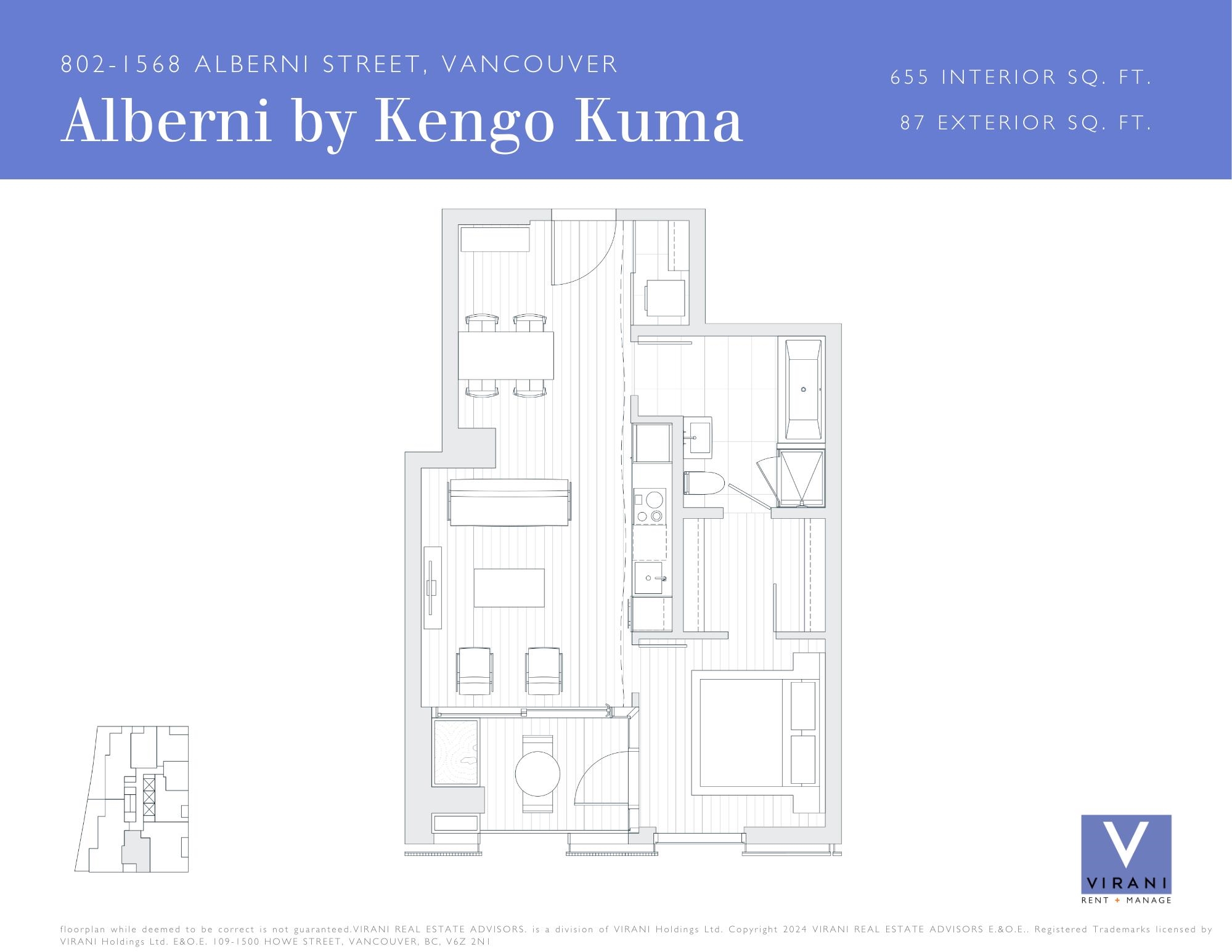 MOVE IN TO ALBERNI BY KENGO KUMA TODAY! Rarely available, this 1 bed 1 bath home features 655 Sq. Ft. of living space and 87 Sq. Ft. of beautiful Japanese inspired outdoor space. Enjoy city views with a high-end Miele appliance package, beautiful, designed Japanese inspired features, and floor-to-ceiling windows. Experience resort like living with amenities such as a 24-hour concierge, state of the art fitness facility, stunning indoor lap pool, music room, and private wine tasting room. 1 Parking stall, 1 ...