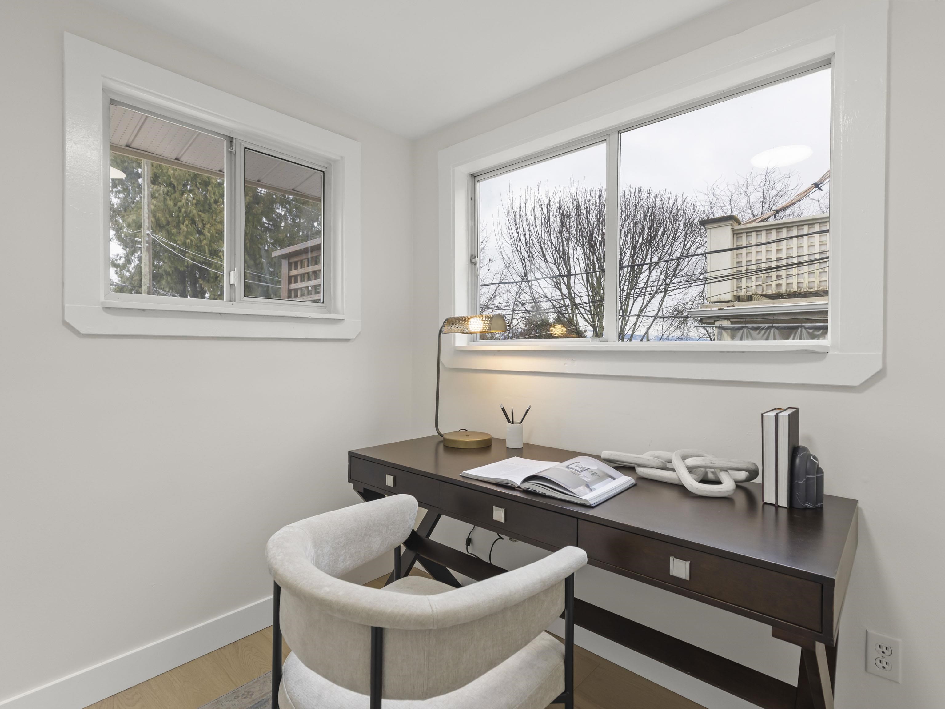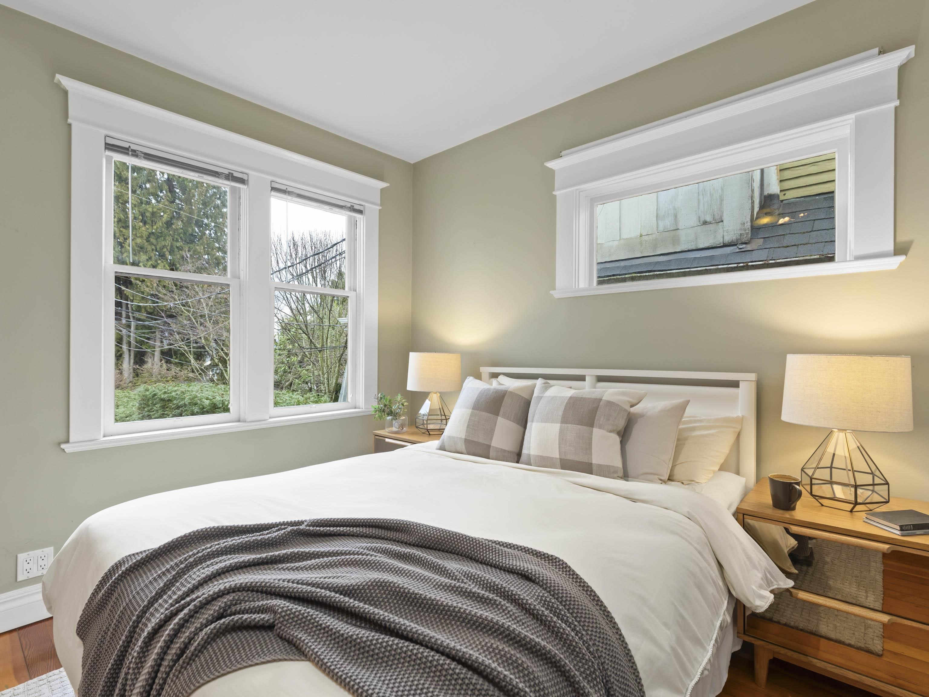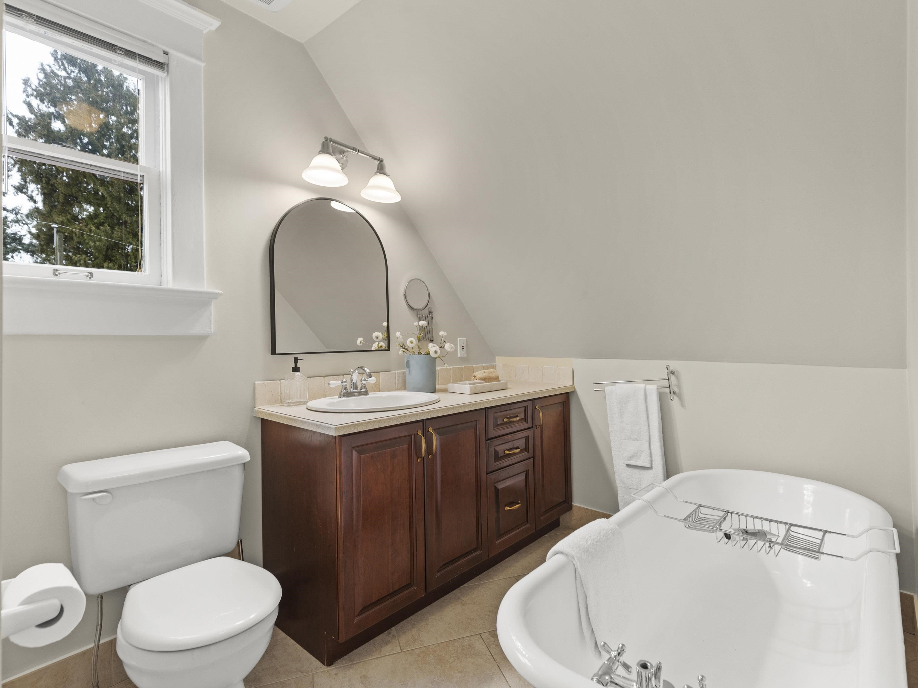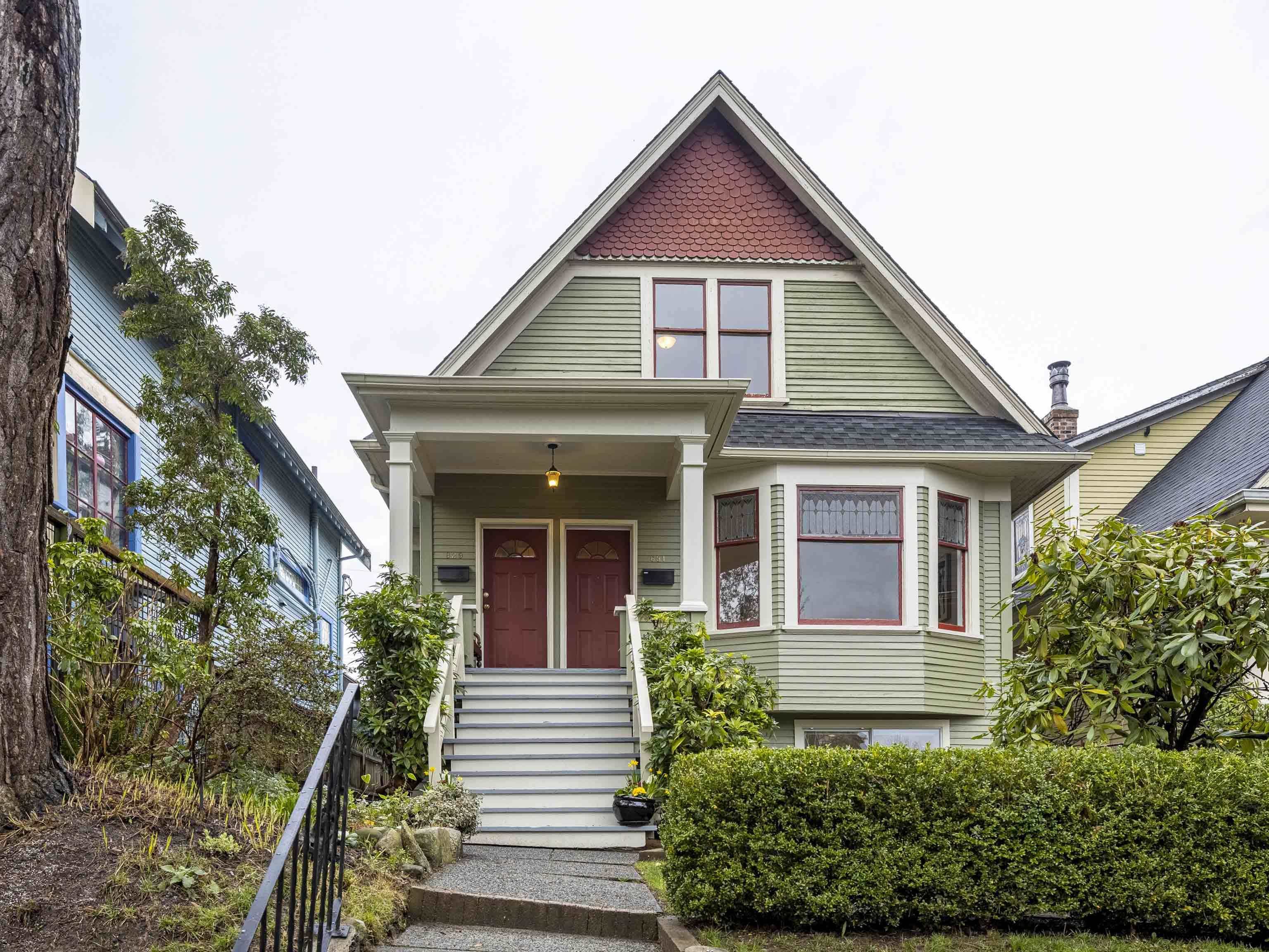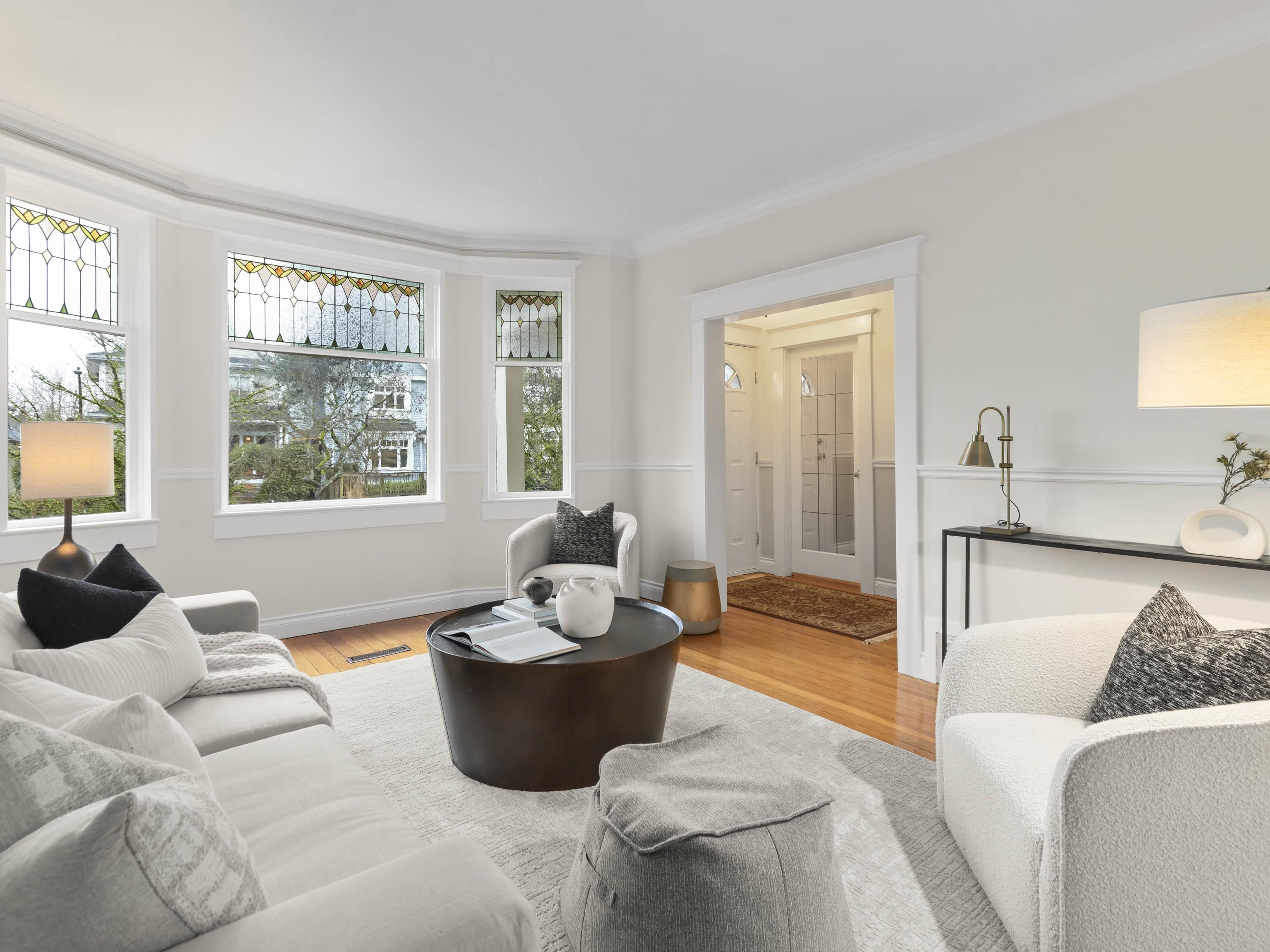 CHARACTER! Beautiful pre-WW1 home w/ vintage details perched at the top of the hill & elevated above the street, offering added privacy, views + light. Top floor has 3 beds +1 bath w/ claw tub. Big deck off bedroom shows off panoramic views. Main floor has it all, grand living room w/ stained glass + over height ceilings, updated kitchen flows into bright dining room w/ skylights & sliding door onto 2nd big deck + a guest bedroom + an office. Original fir floors throughout, heated floors in main floor bath....