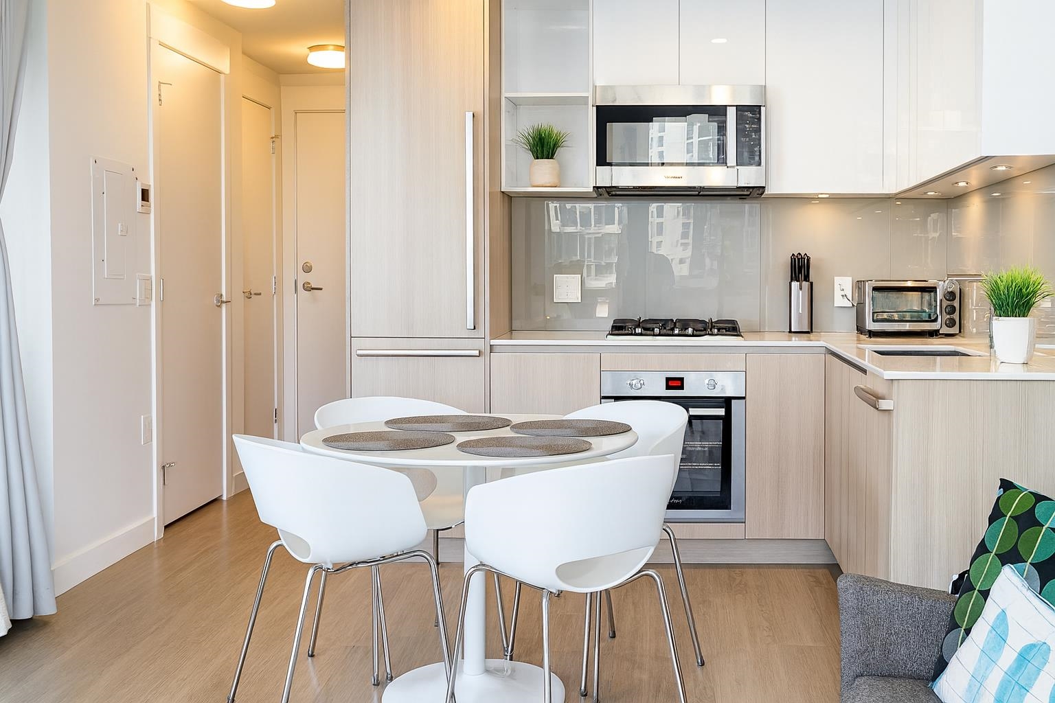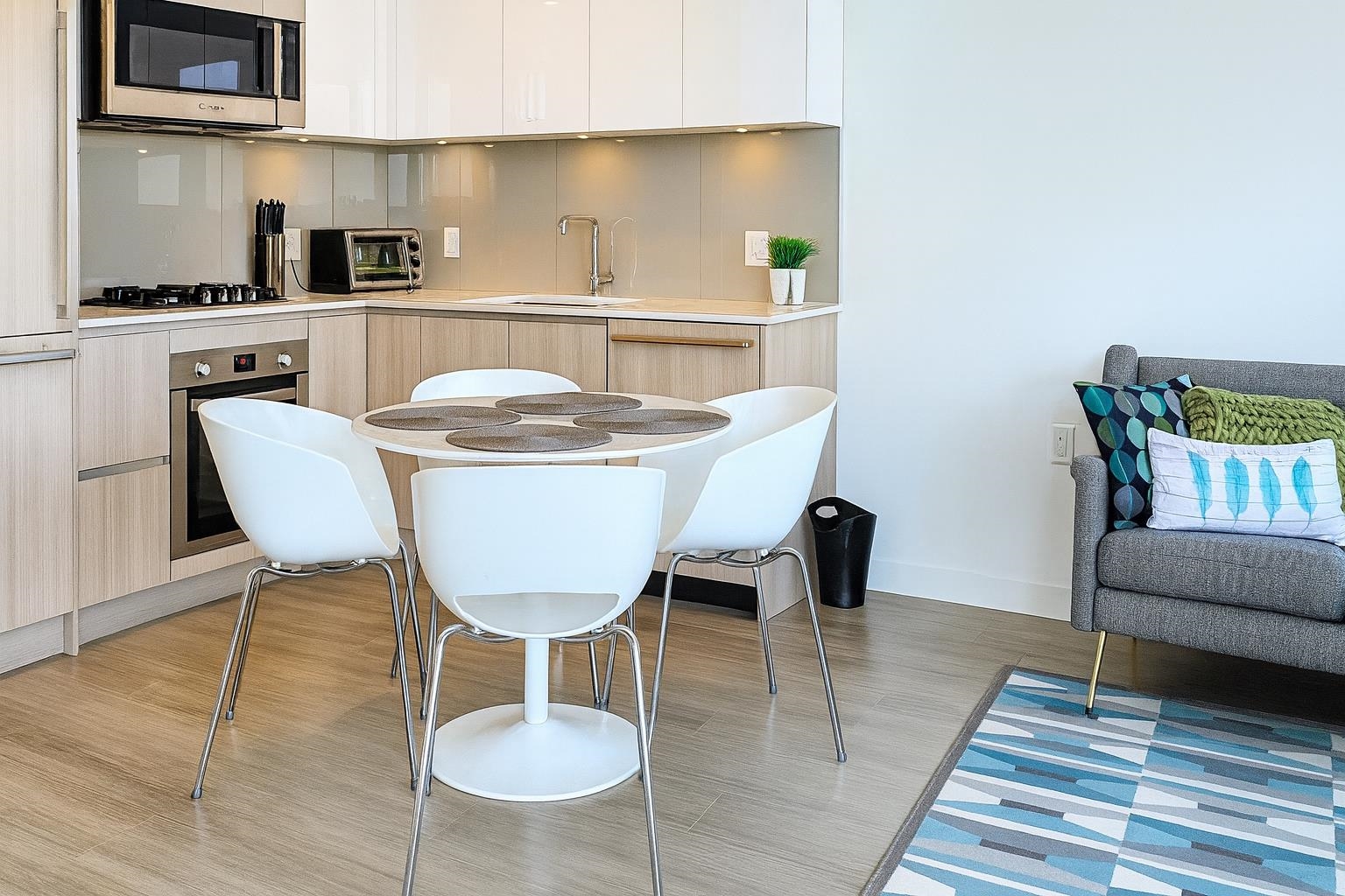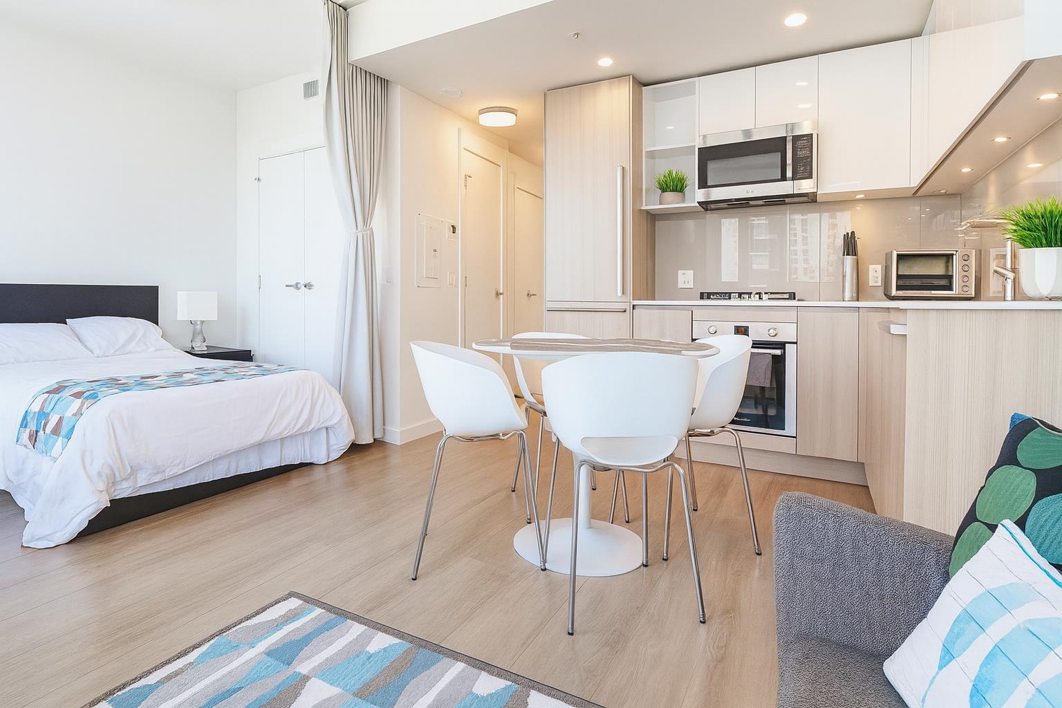 This 2024 built East facing Studio is fully furnished with modern furniture in the Downtown New Westminster neighborhood. This 461 sqft. suite offers an open plan studio + 1 bathroom with a river and city view Step inside and admire the elegant laminate floors, quartz countertops, and high end appliances in the kitchen. Enjoy breathtaking bridge and water views from the comfort of your own home. Stay comfortable year-round with air conditioning and take advantage of the amenities available in the building. ...