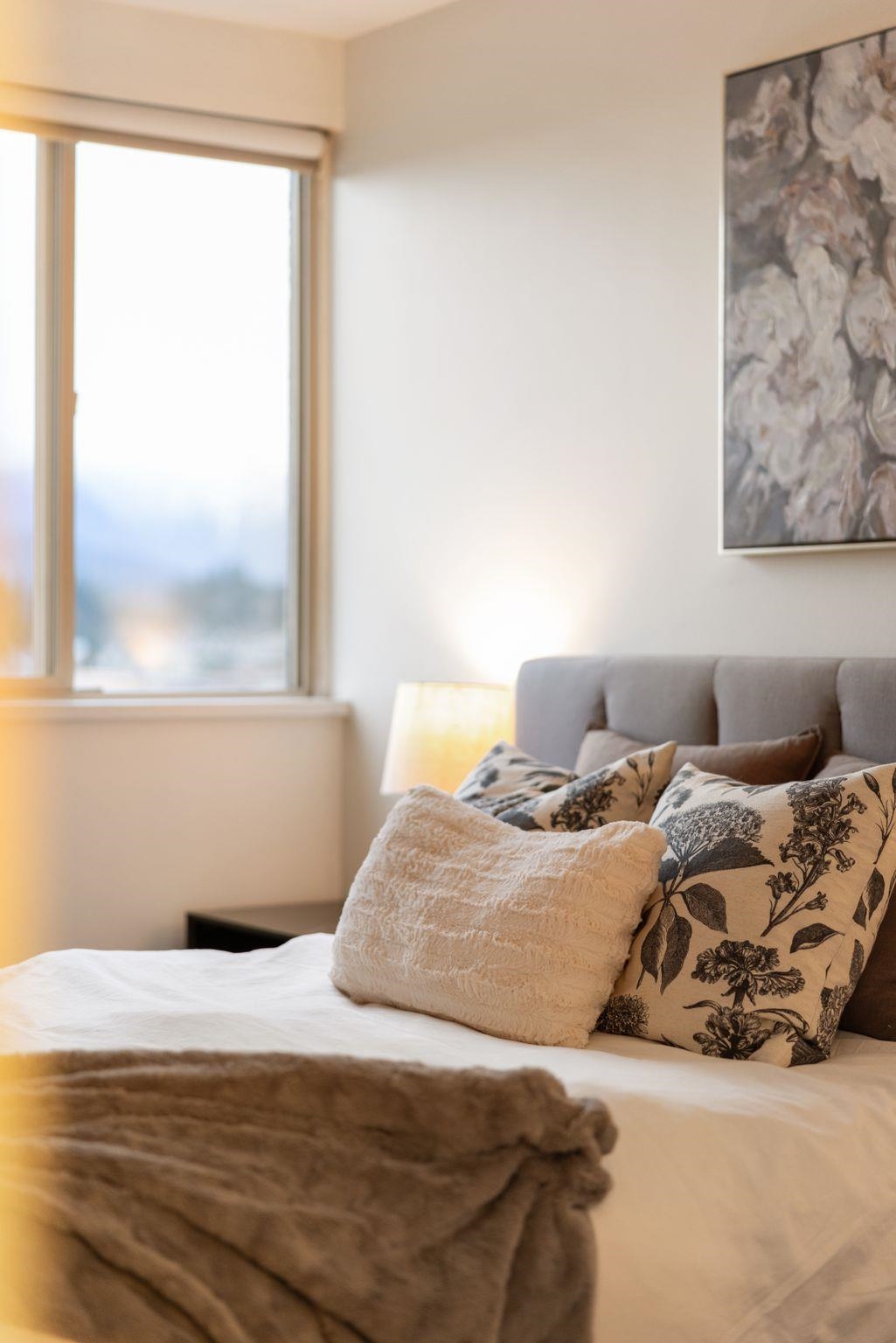 Spectacular southwest PANORAMIC VIEWS of the OCEAN, city skyline, Lions Gate Bridge & the Lions define this LUXURIOUSLY RENOVATED corner residence in a solid concrete building, in the heart of Lower Lonsdale. Thoughtfully updated, it features a new kitchen, custom cabinetry updated bathroom, luxury vinyl plank floors, new baseboards, smooth ceilings, quartz countertops, & new pot lighting. Bright, generously proportioned living & dining areas easily accommodate full-size furnishings, while principal rooms s...