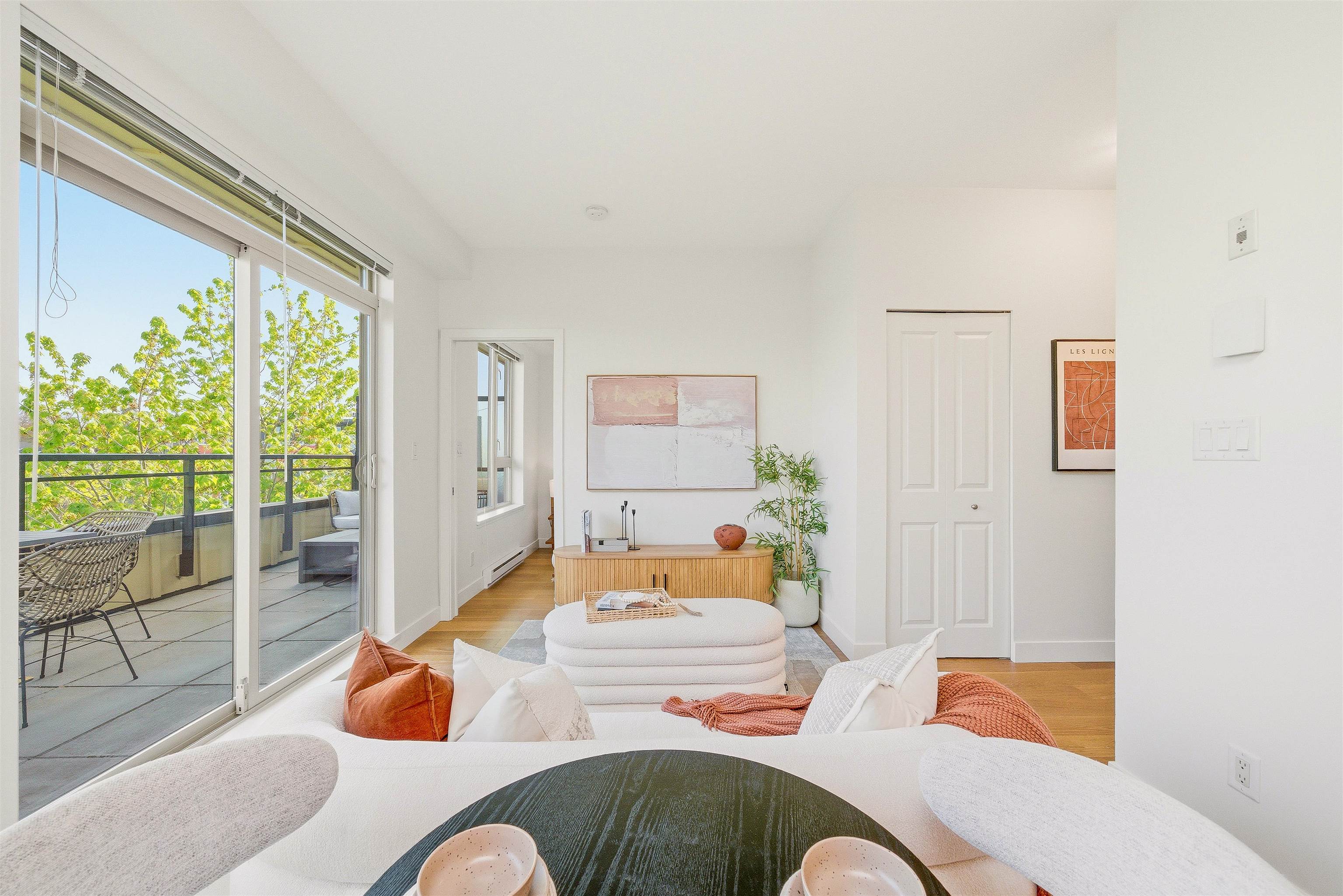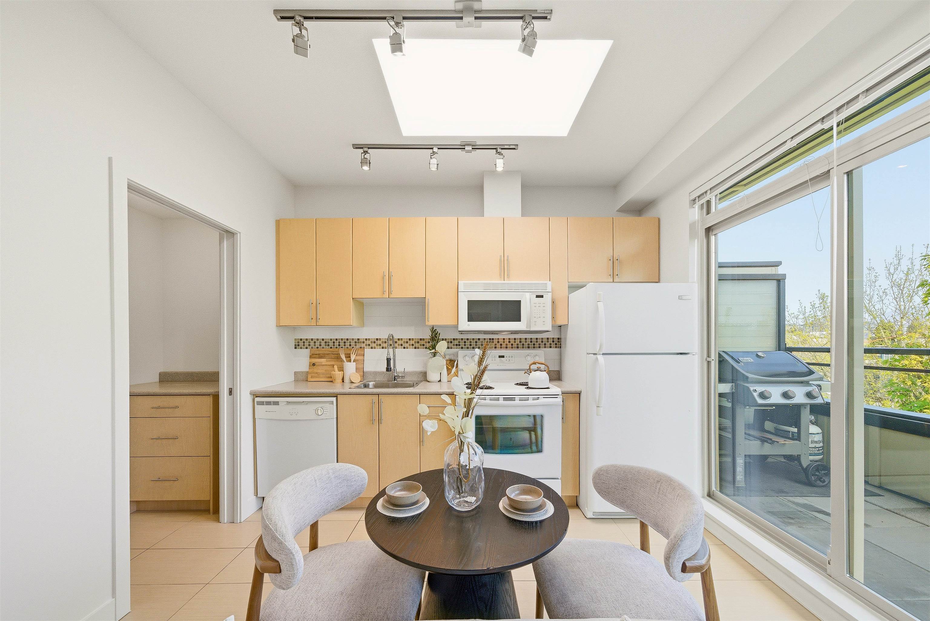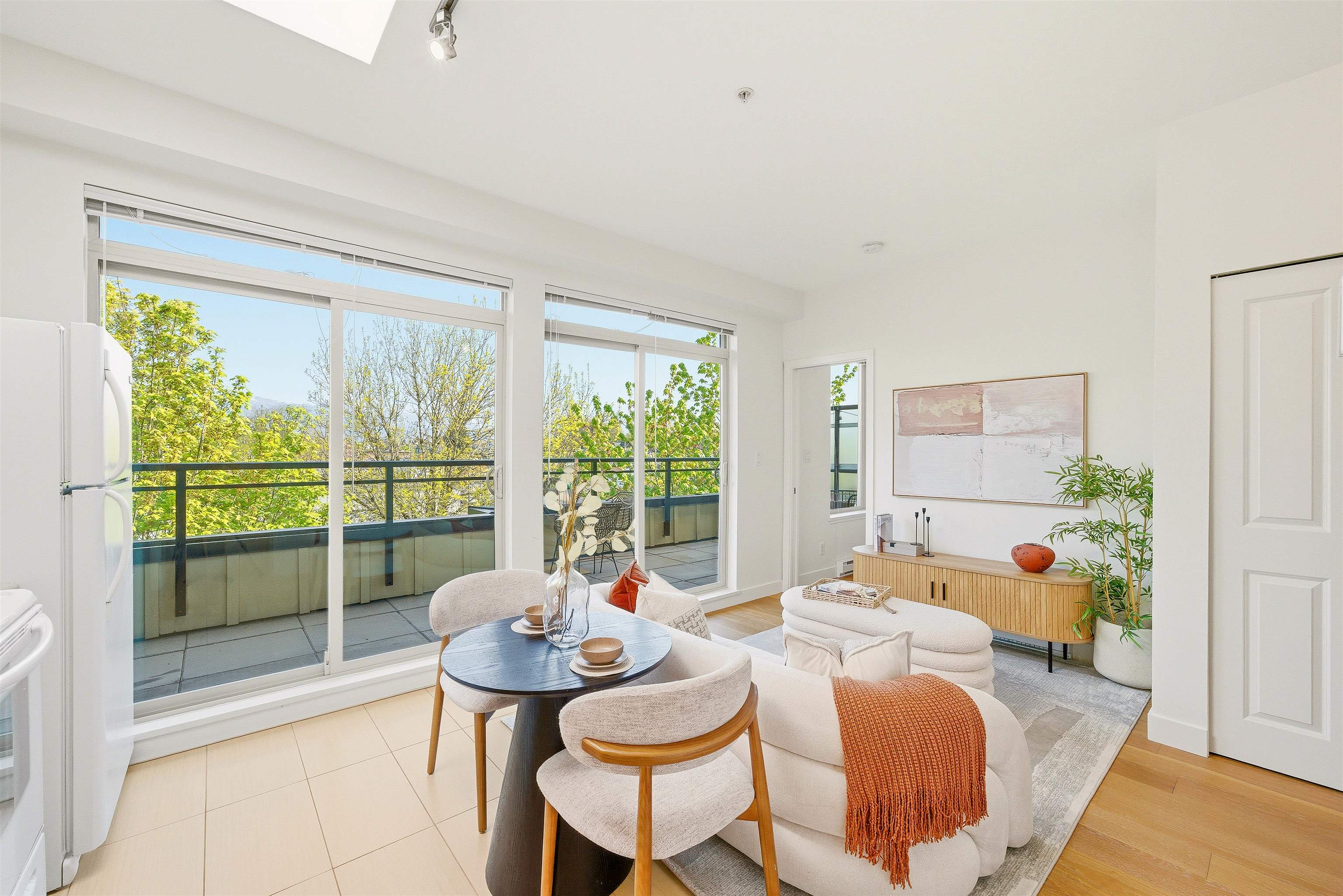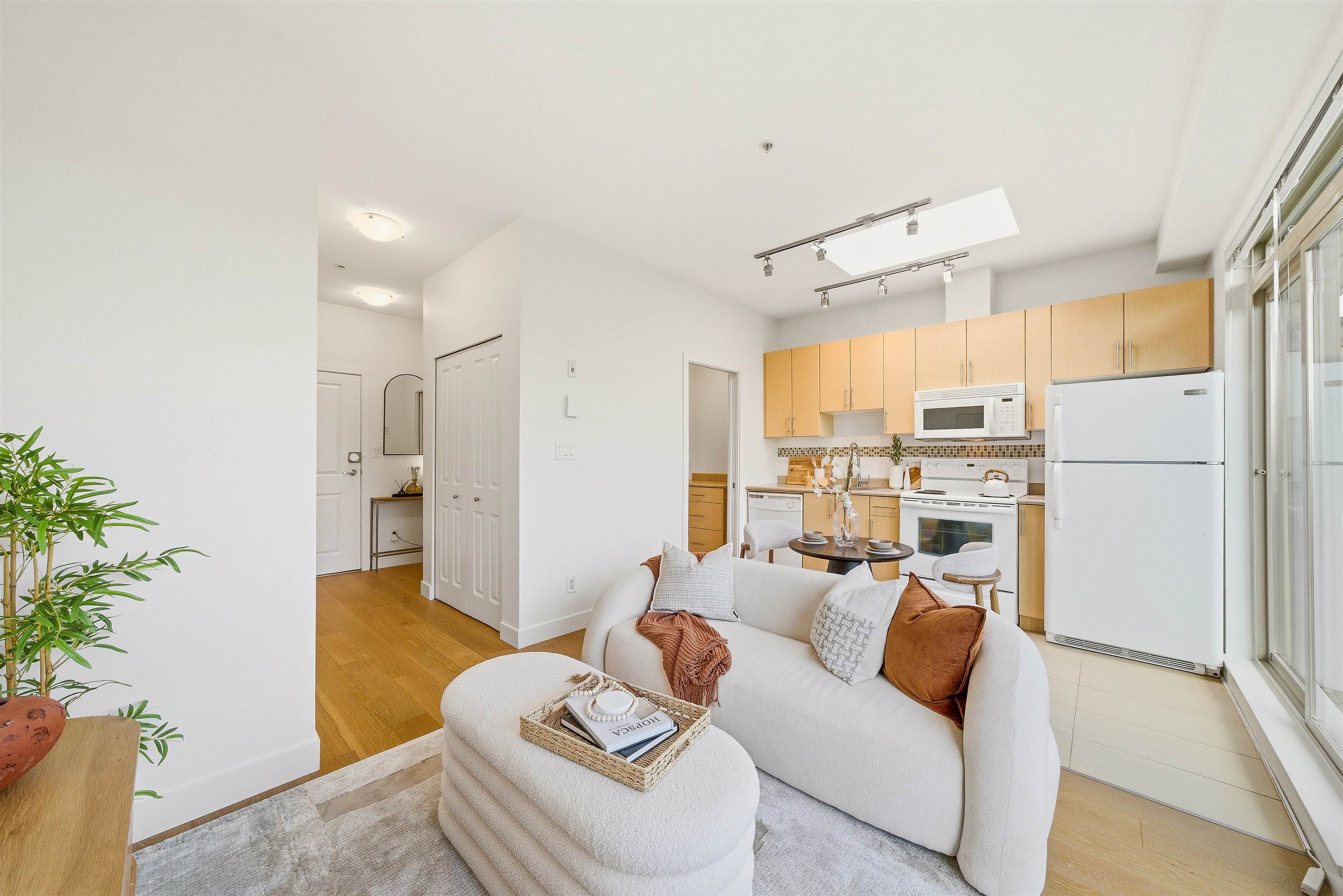 PENTHOUSE + PATIO at The Mondella. Welcome to this bright and updated 1-bed, 476 sqft home in the heart of Fraserhood. The open layout is enhanced by a skylight and 9' ceilings, while the kitchen flows into a versatile flex space—perfect for a coffee bar, pantry, or storage. A welcoming foyer and in-suite laundry add everyday convenience, with brand new hardwood floors and fresh paint throughout. Enjoy the 178 sq ft north-facing balcony with beautiful mountain views, ideal for relaxing or entertaining year-...