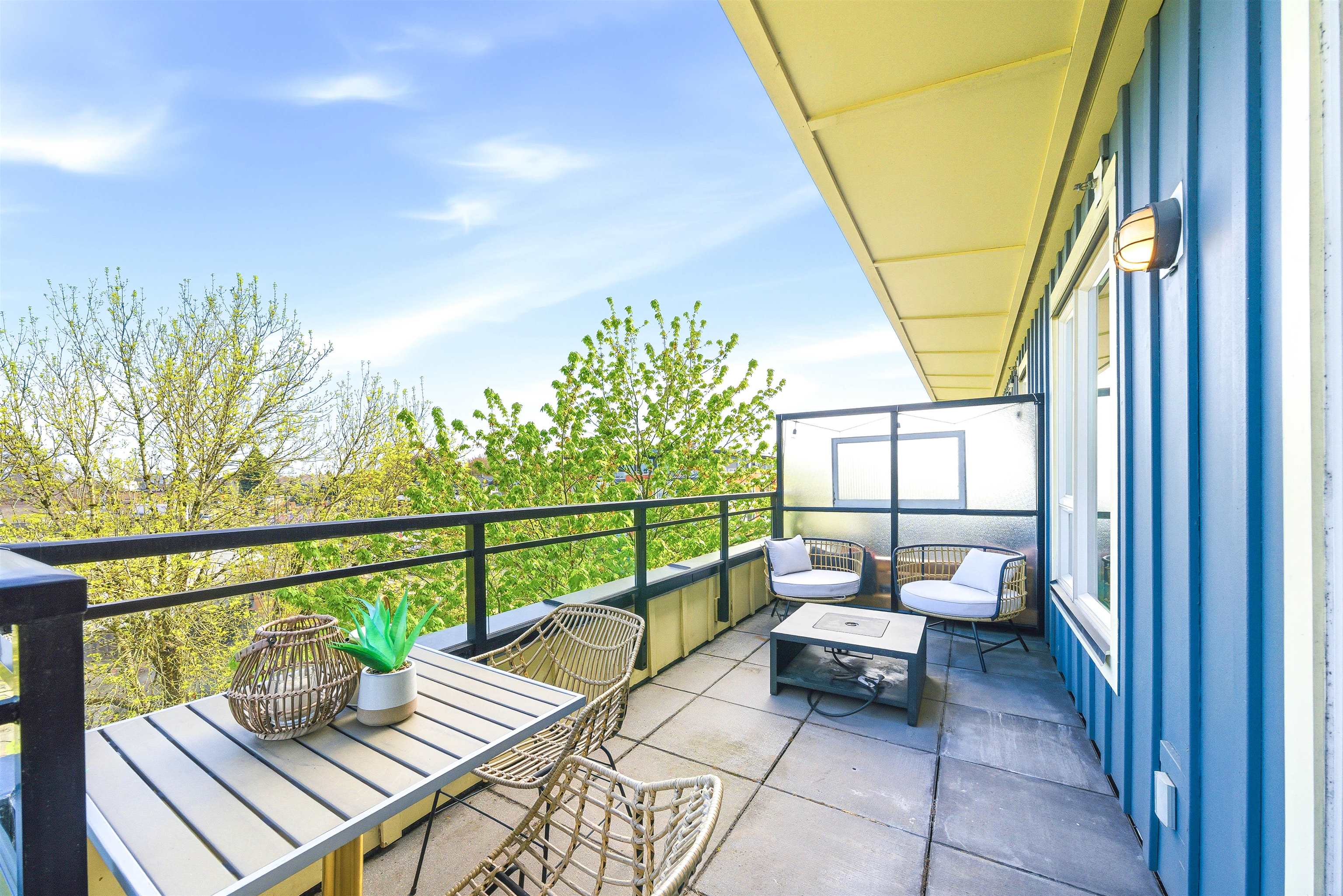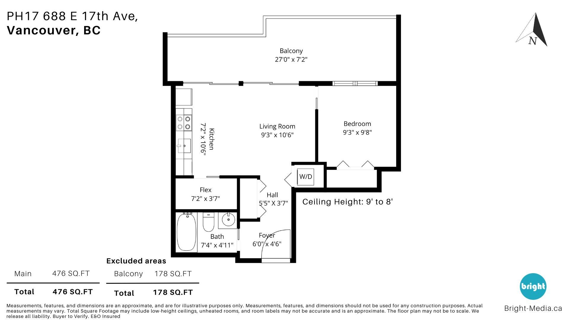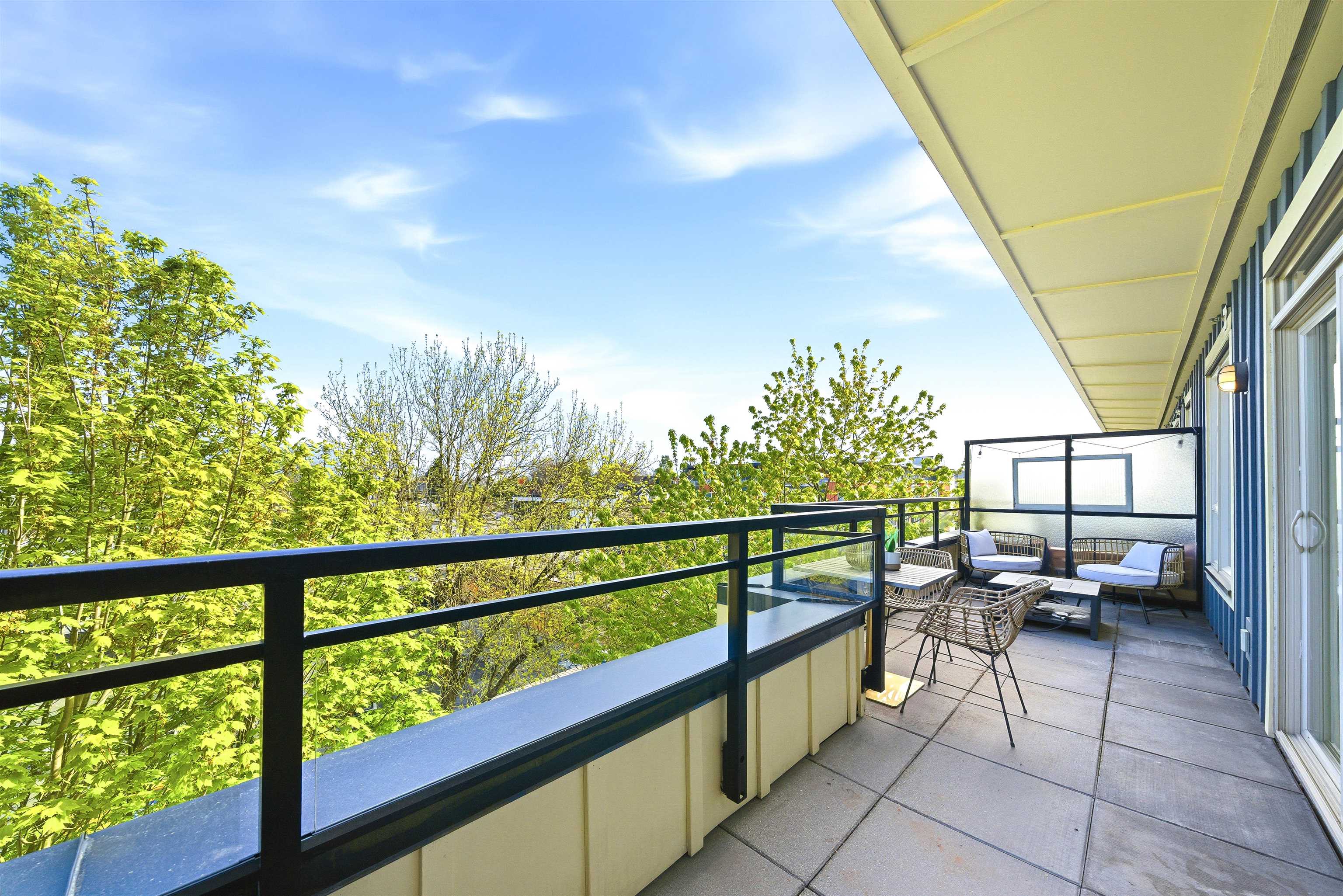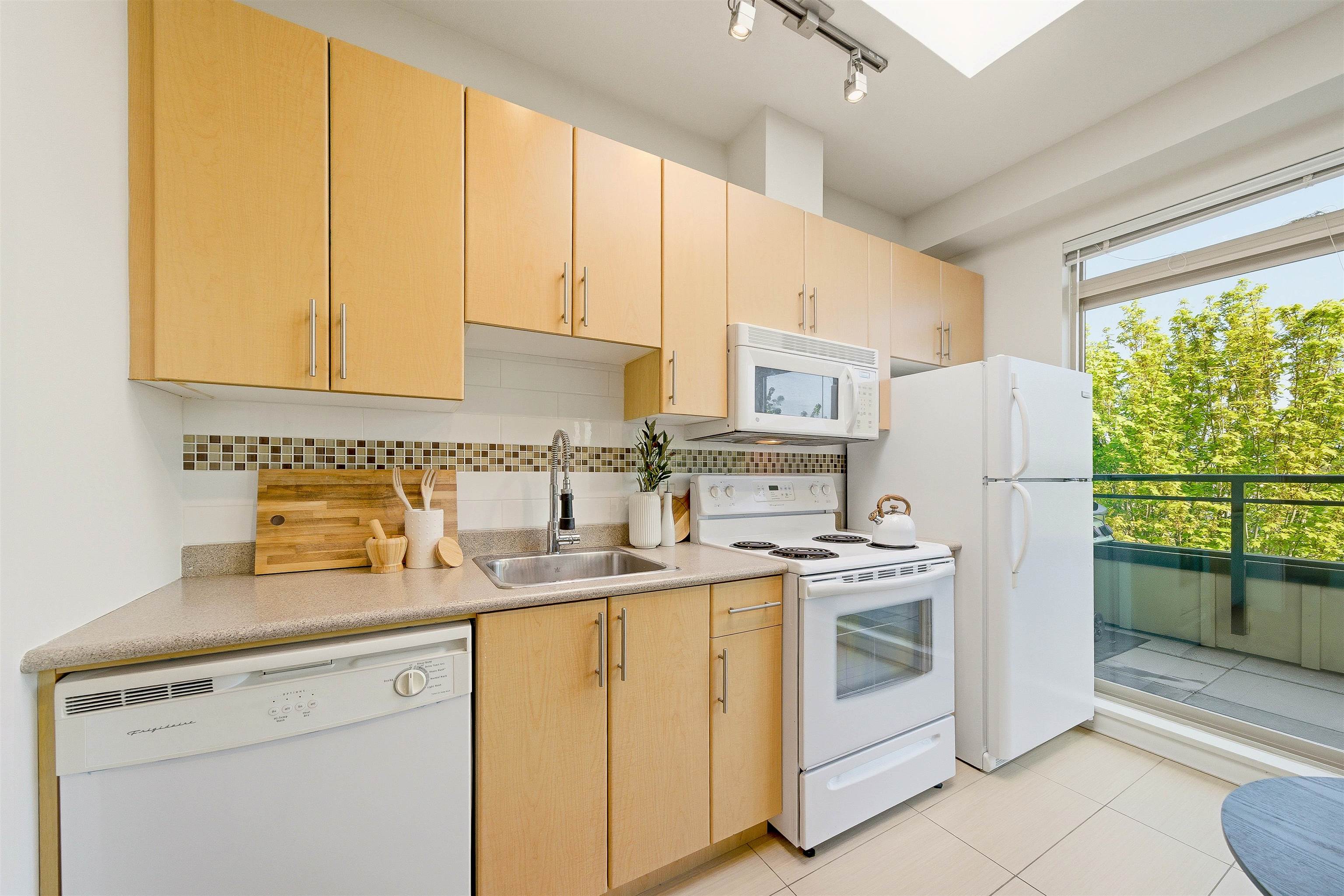 PENTHOUSE + PATIO at The Mondella. Welcome to this bright and updated 1-bed, 476 sqft home in the heart of Fraserhood. The open layout is enhanced by a skylight and 9' ceilings, while the kitchen flows into a versatile flex space—perfect for a coffee bar, pantry, or storage. A welcoming foyer and in-suite laundry add everyday convenience, with brand new hardwood floors and fresh paint throughout. Enjoy the 178 sq ft north-facing balcony with beautiful mountain views, ideal for relaxing or entertaining year-...