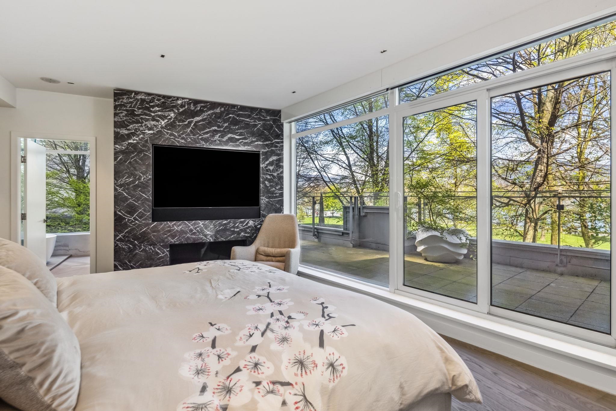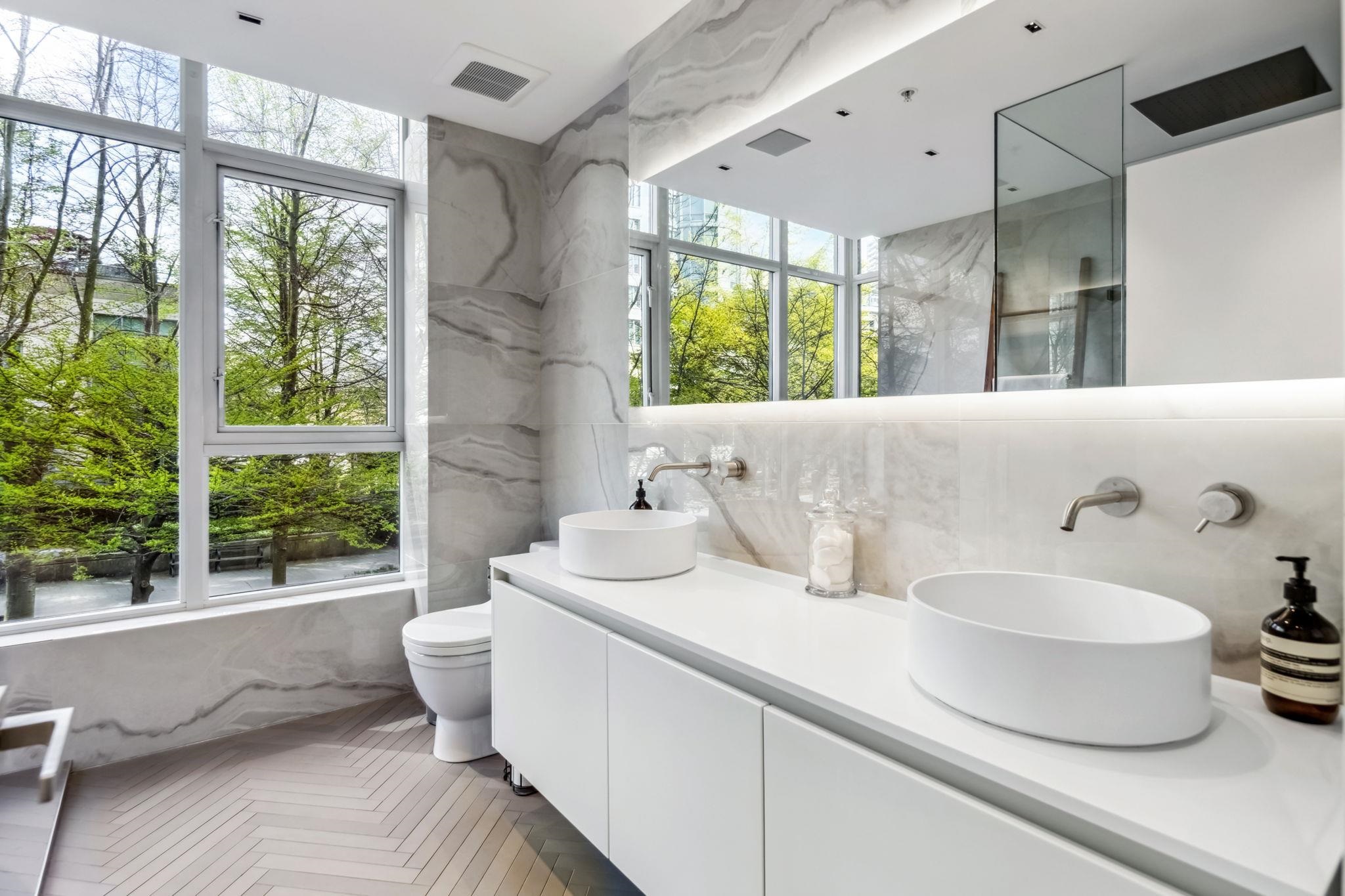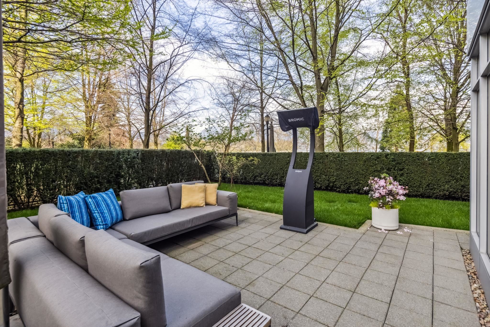 Waterfront Coal Harbour townhouse with stunning views and a house-like feel, featuring a private yard, corner exposure with abundant light, direct seawall entry, private elevator, gated 2-car garage with in-unit access, and private storage. Fully rebuilt in 2021 with Arclinea millwork, Sub-Zero/Wolf appliances, Bocci lighting, security, and Savant smart home with Lutron integration.